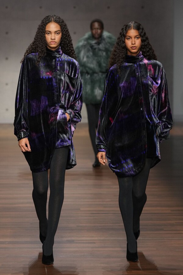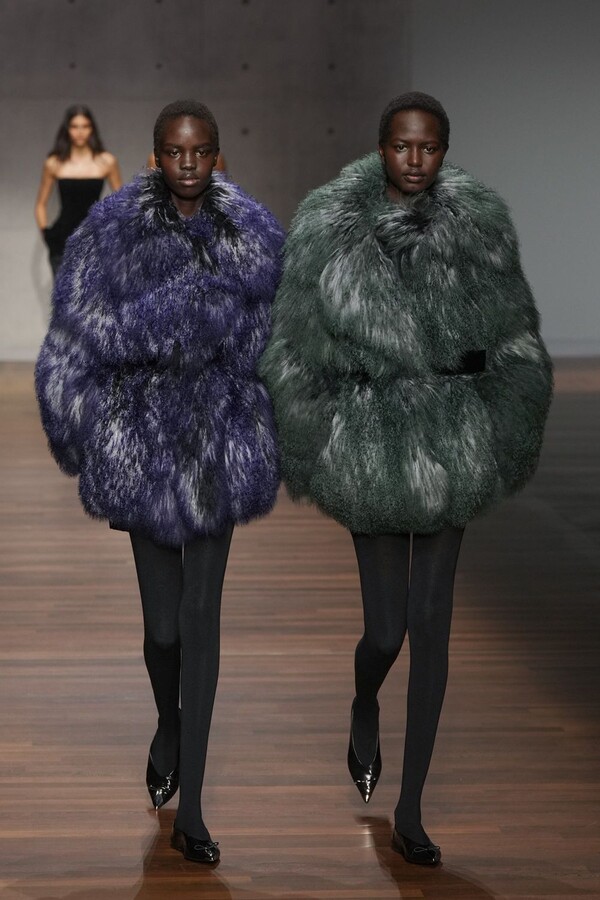 女装方面凸显了 70 年代的柔美风格。飘逸的格纹迷你裙搭配同款外套,充满了复古情怀;宝石色调的红绿皮草连体裤则重现江湖。简约公主风大衣和垂坠感十足的羊毛套装以品牌标志性的灰褐色为主色调,再次印证了风格的延续性。