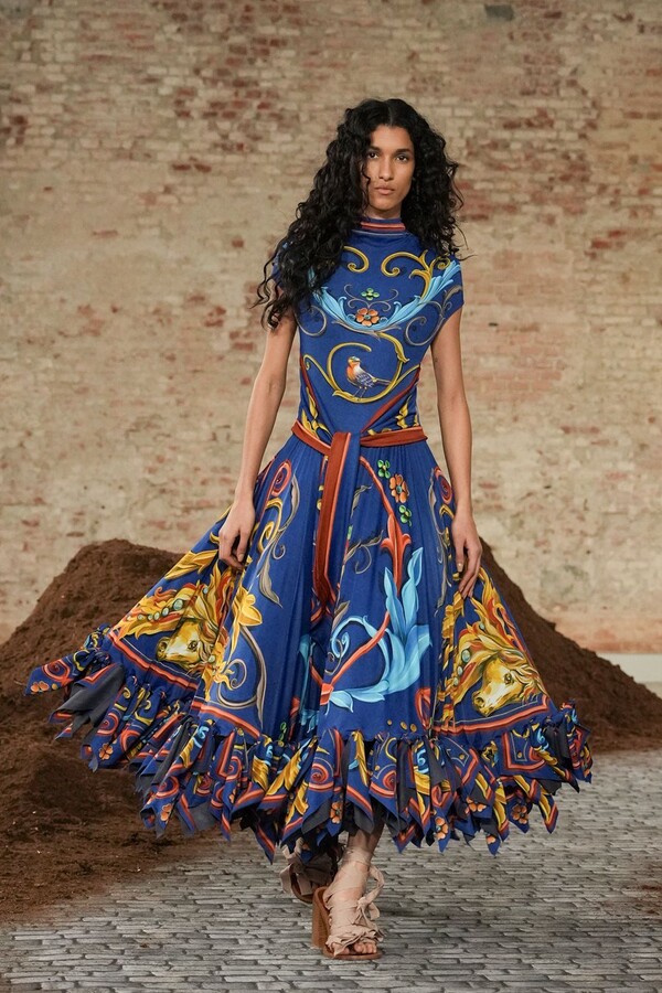 视觉元素加深了文化层次感。阿根廷公交车和商店橱窗上常见的华丽曲线装饰风格——Filete porteño 蜿蜒于飘逸的舞裙和外套之上,其繁复的装饰与 MOSCHINO 品牌一贯的奔放不羁竟出人意料地和谐共存。