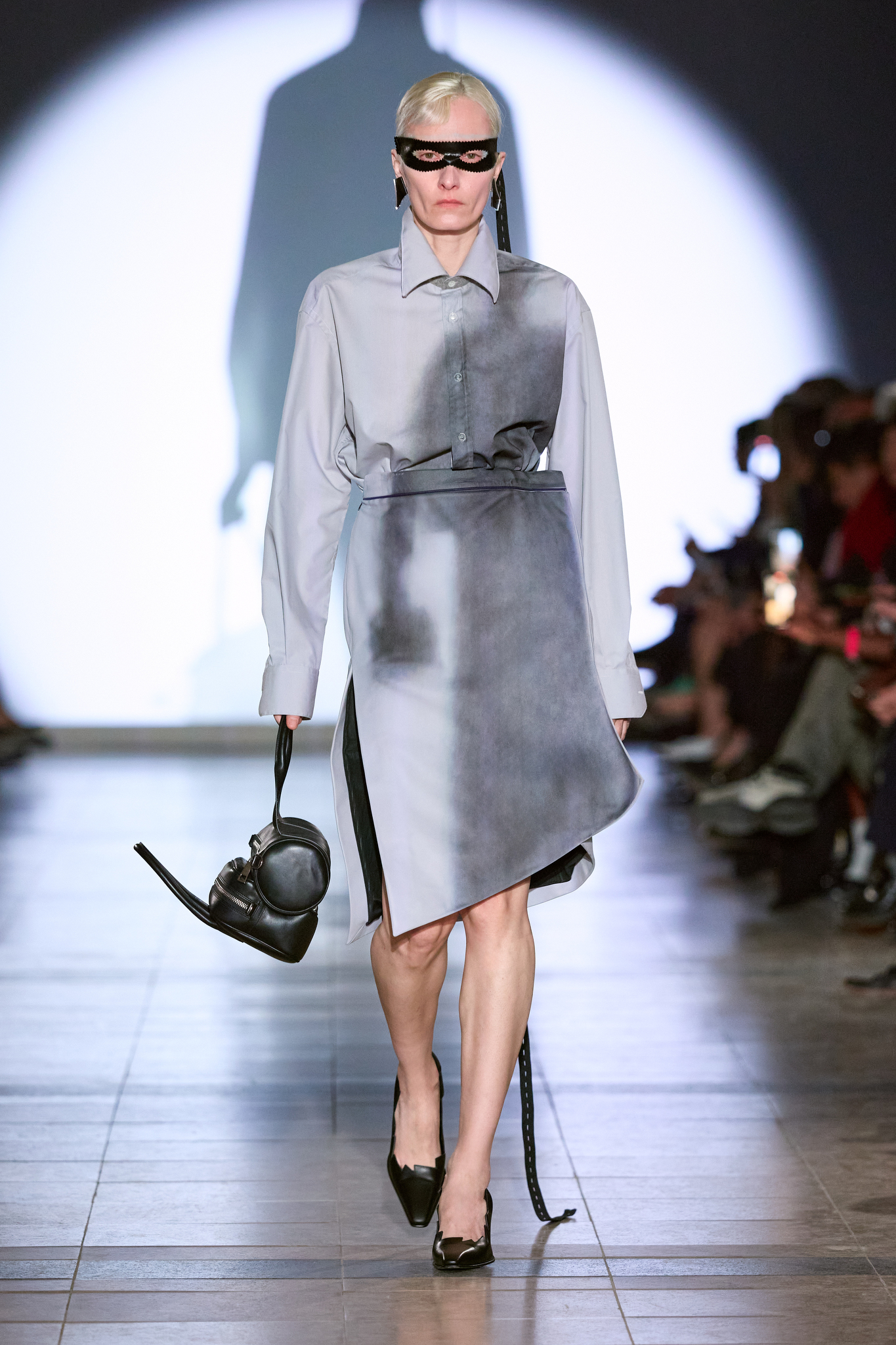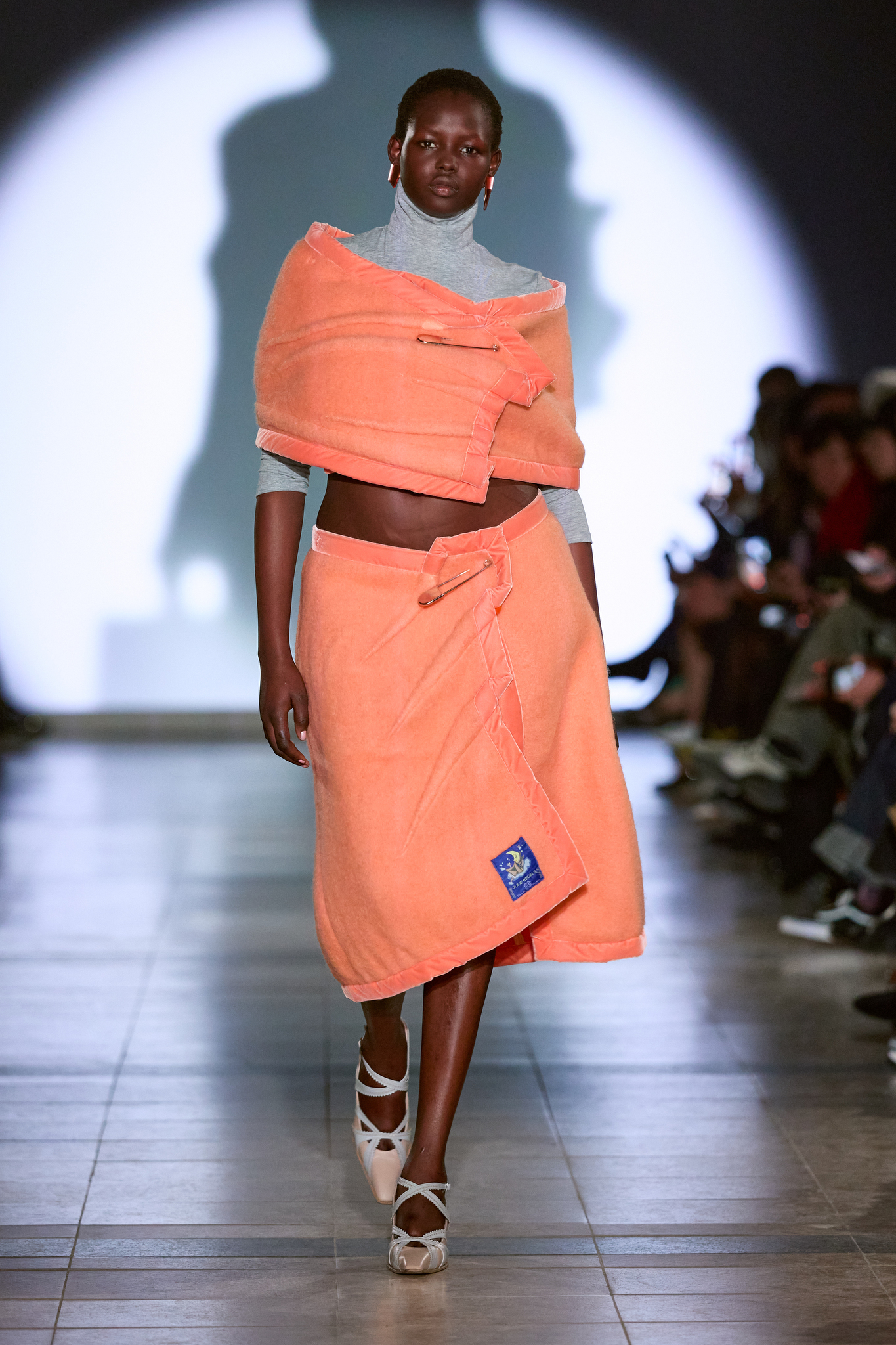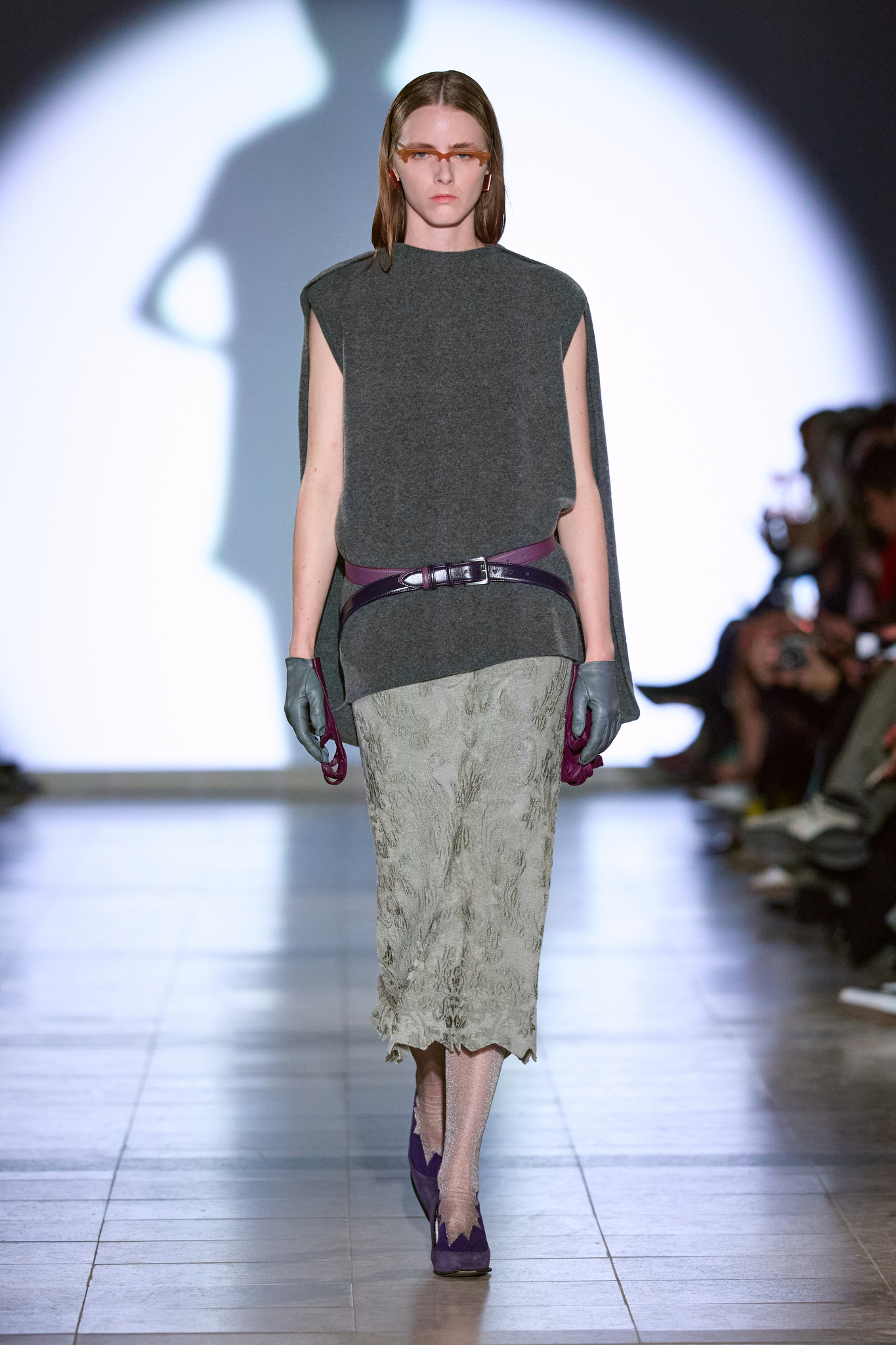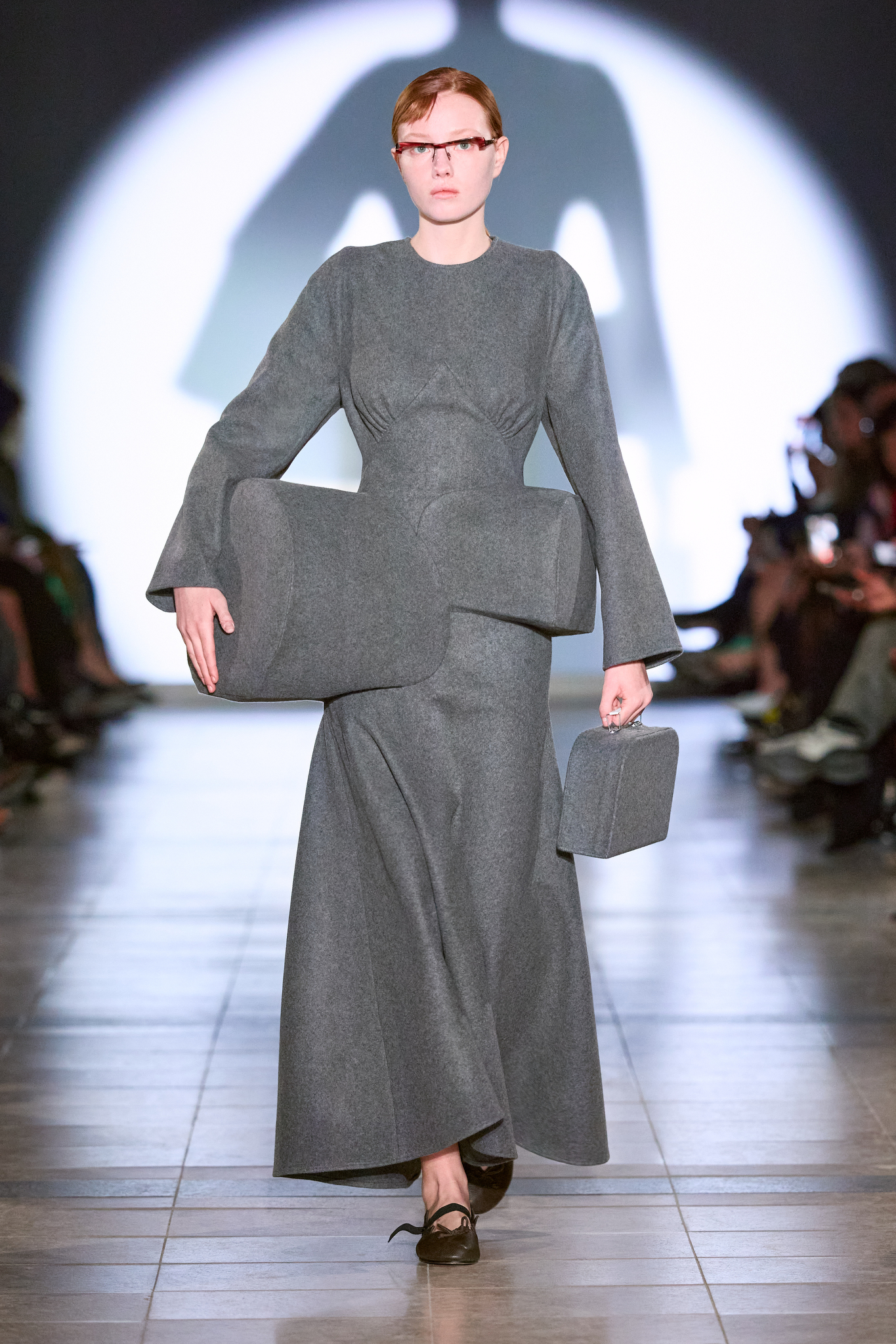 本季系列的色调较以往更加沉稳,设计上多采用更长线条和更具保护性的剪影,展示了一种冷静且充满力量的女性形象。Kegels 利用影像投射技术,将模特的阴影与他们的动作相对比,制造出一场视觉上的错位,呈现了不完美和幽默感。通过对剪裁的巧妙运用,例如圆形袖口和改变肩线的设计,Kegels 赋予了服装一种「即使你不自信,也能看起来充满自信」的效果。