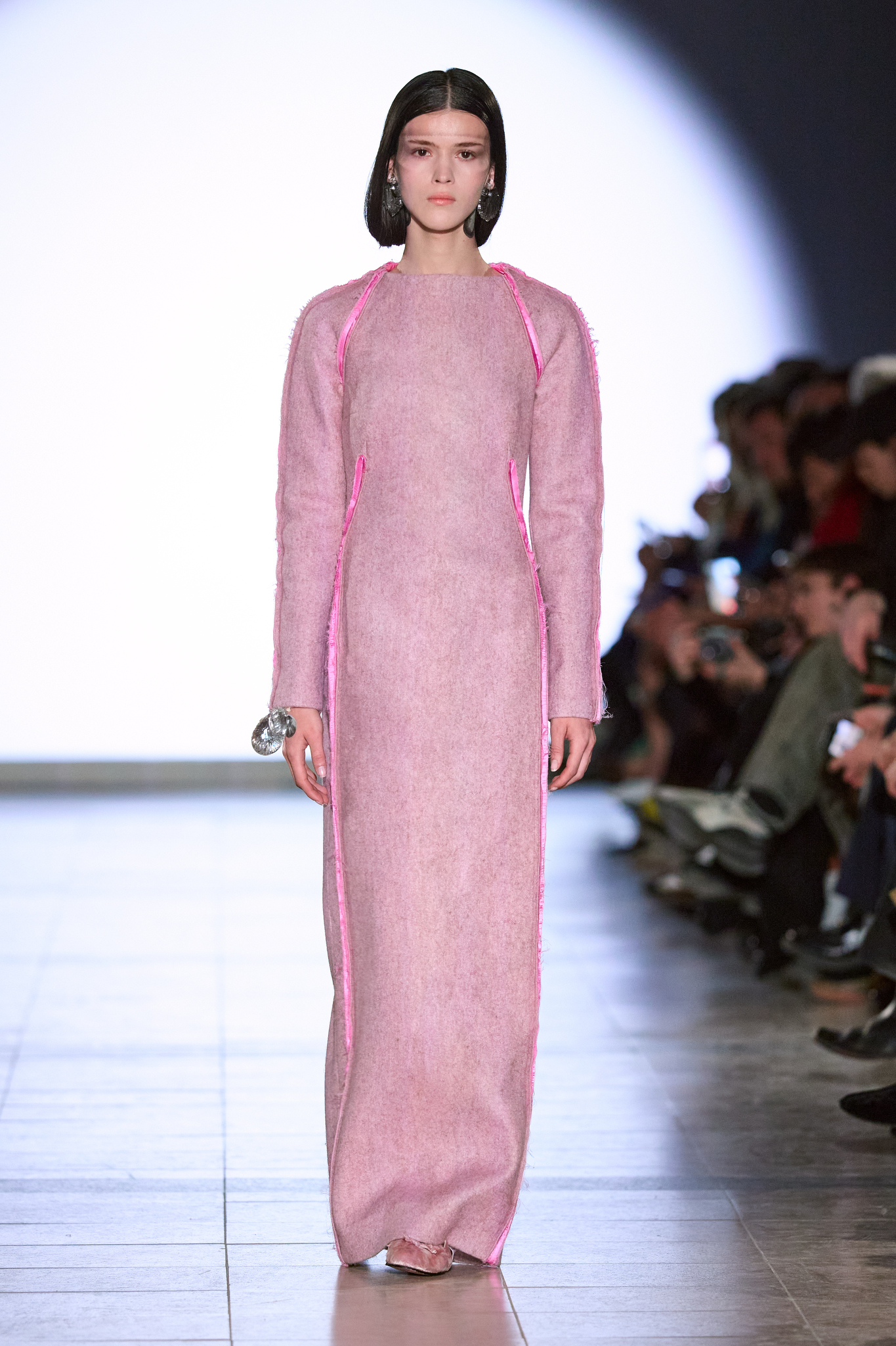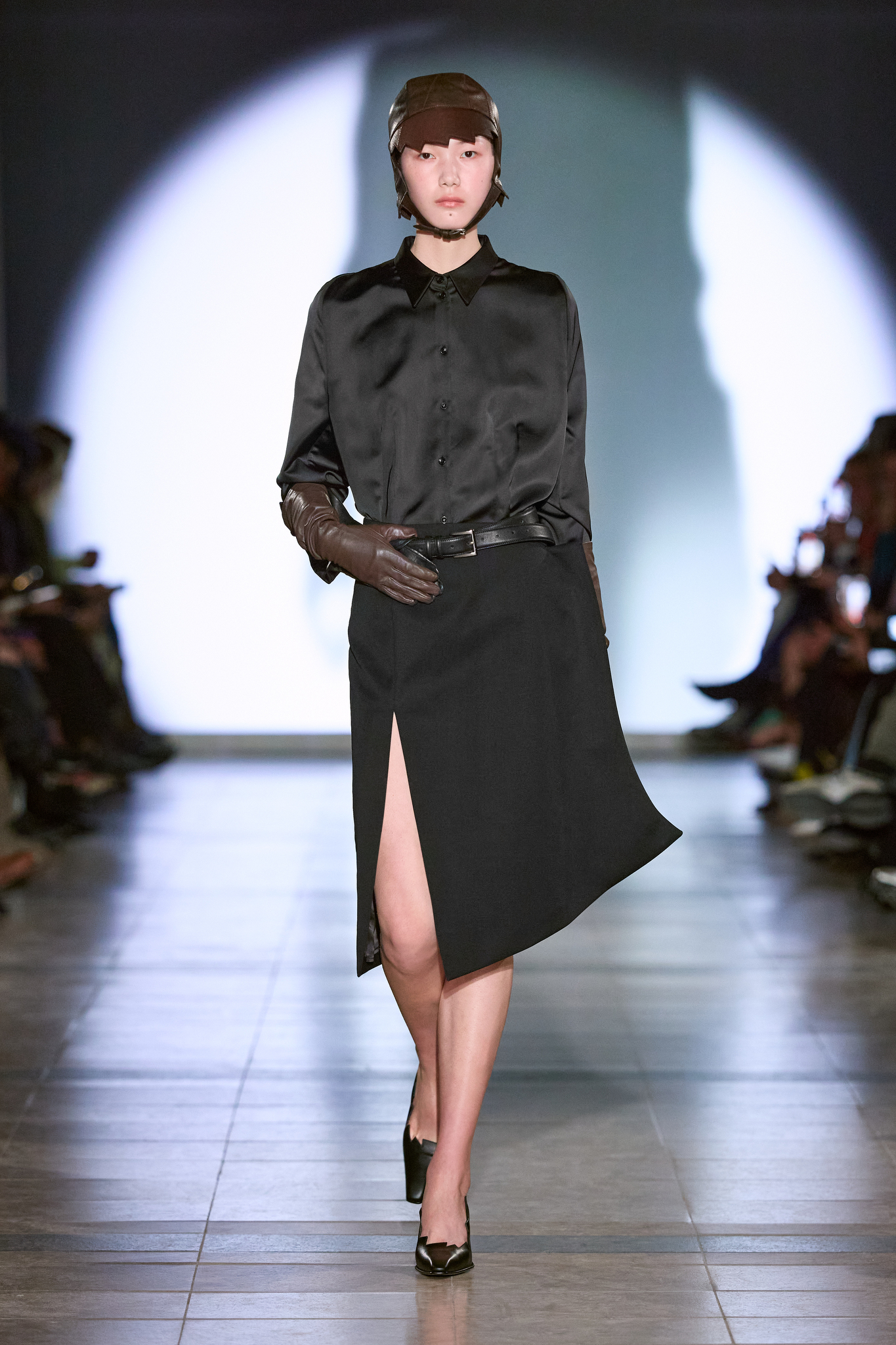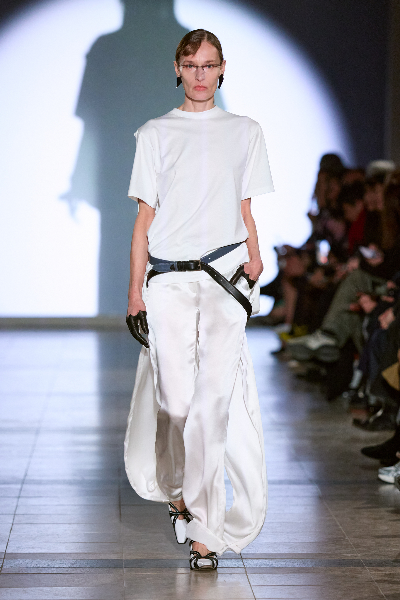 本季系列的色调较以往更加沉稳,设计上多采用更长线条和更具保护性的剪影,展示了一种冷静且充满力量的女性形象。Kegels 利用影像投射技术,将模特的阴影与他们的动作相对比,制造出一场视觉上的错位,呈现了不完美和幽默感。通过对剪裁的巧妙运用,例如圆形袖口和改变肩线的设计,Kegels 赋予了服装一种「即使你不自信,也能看起来充满自信」的效果。