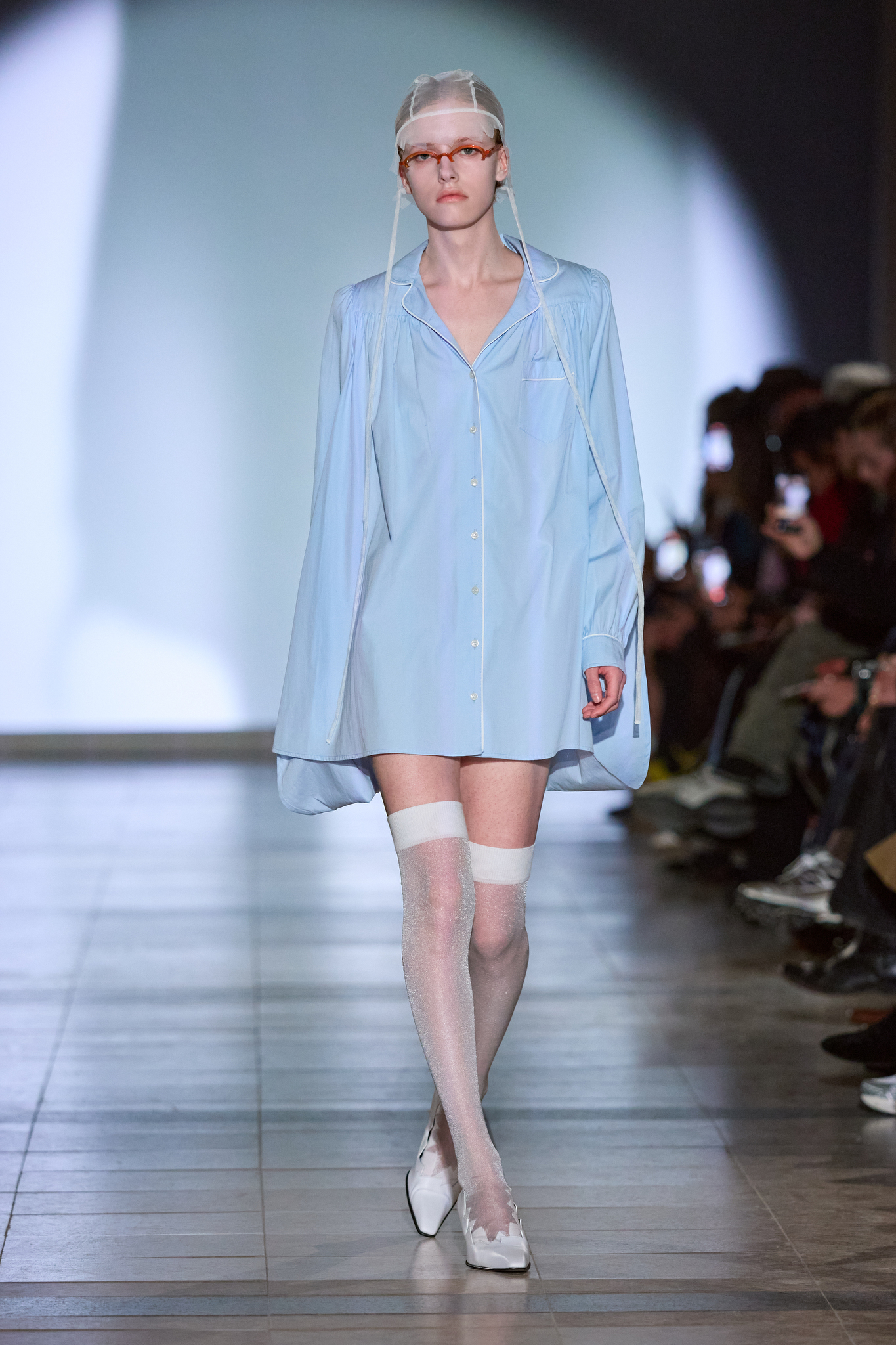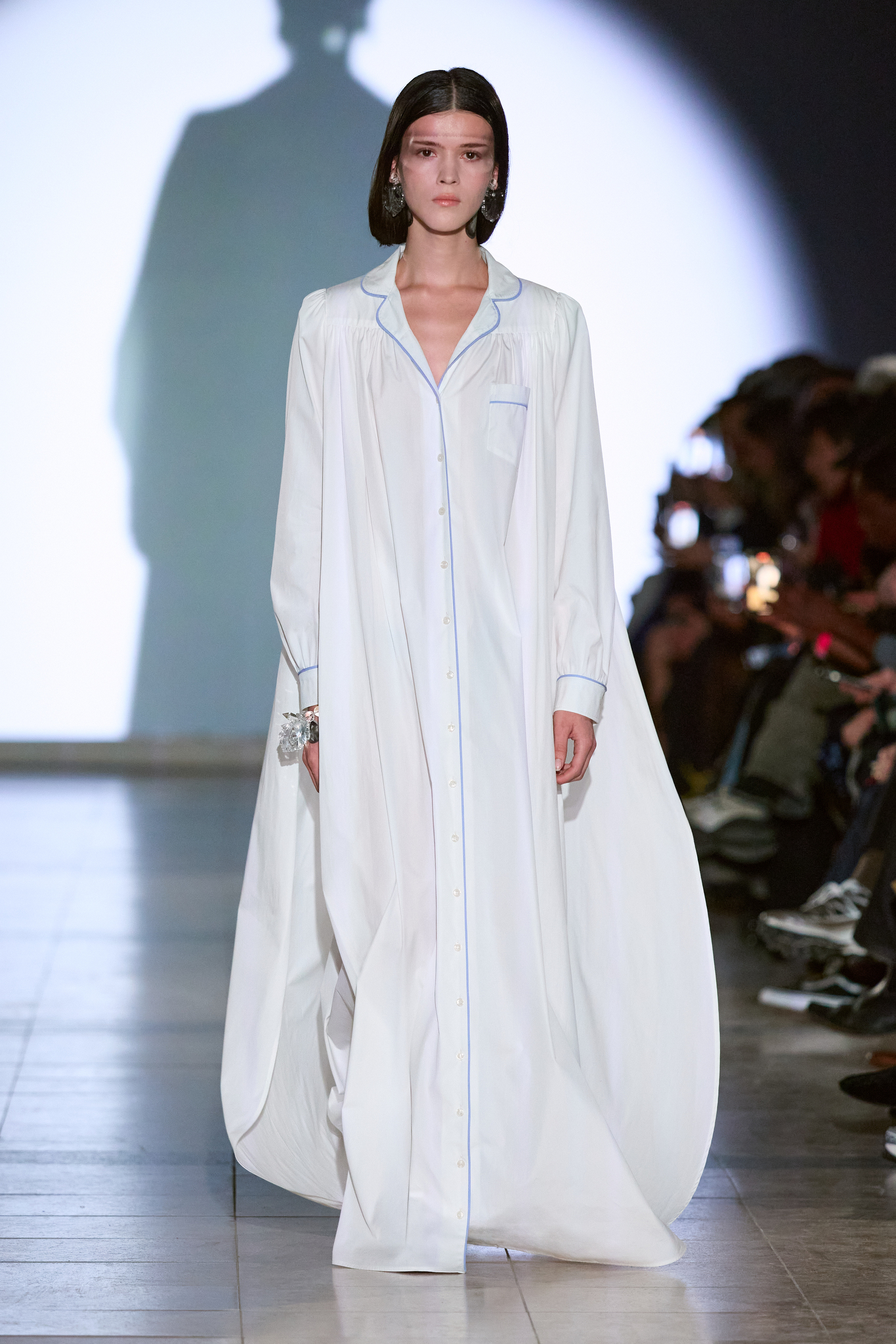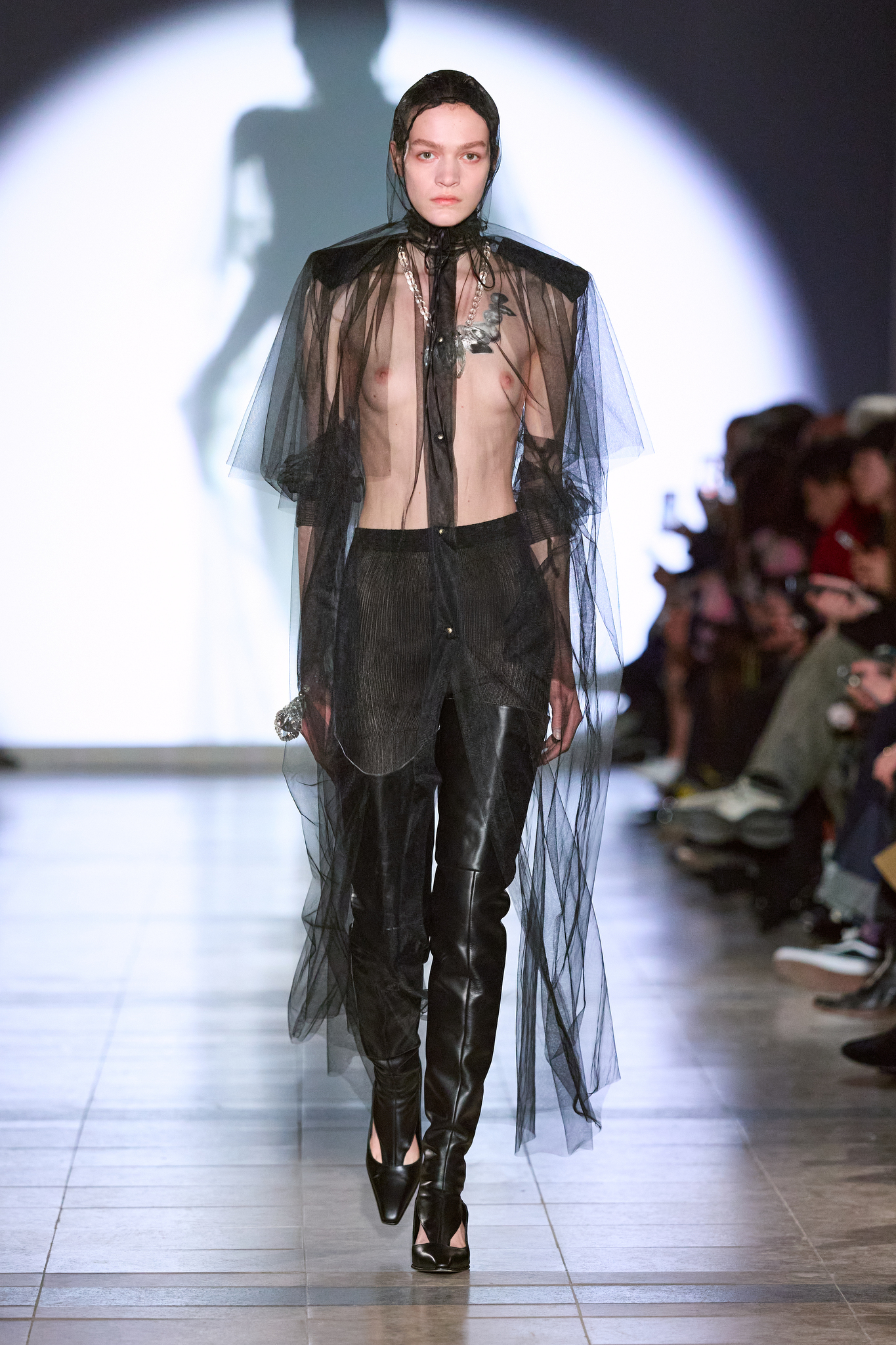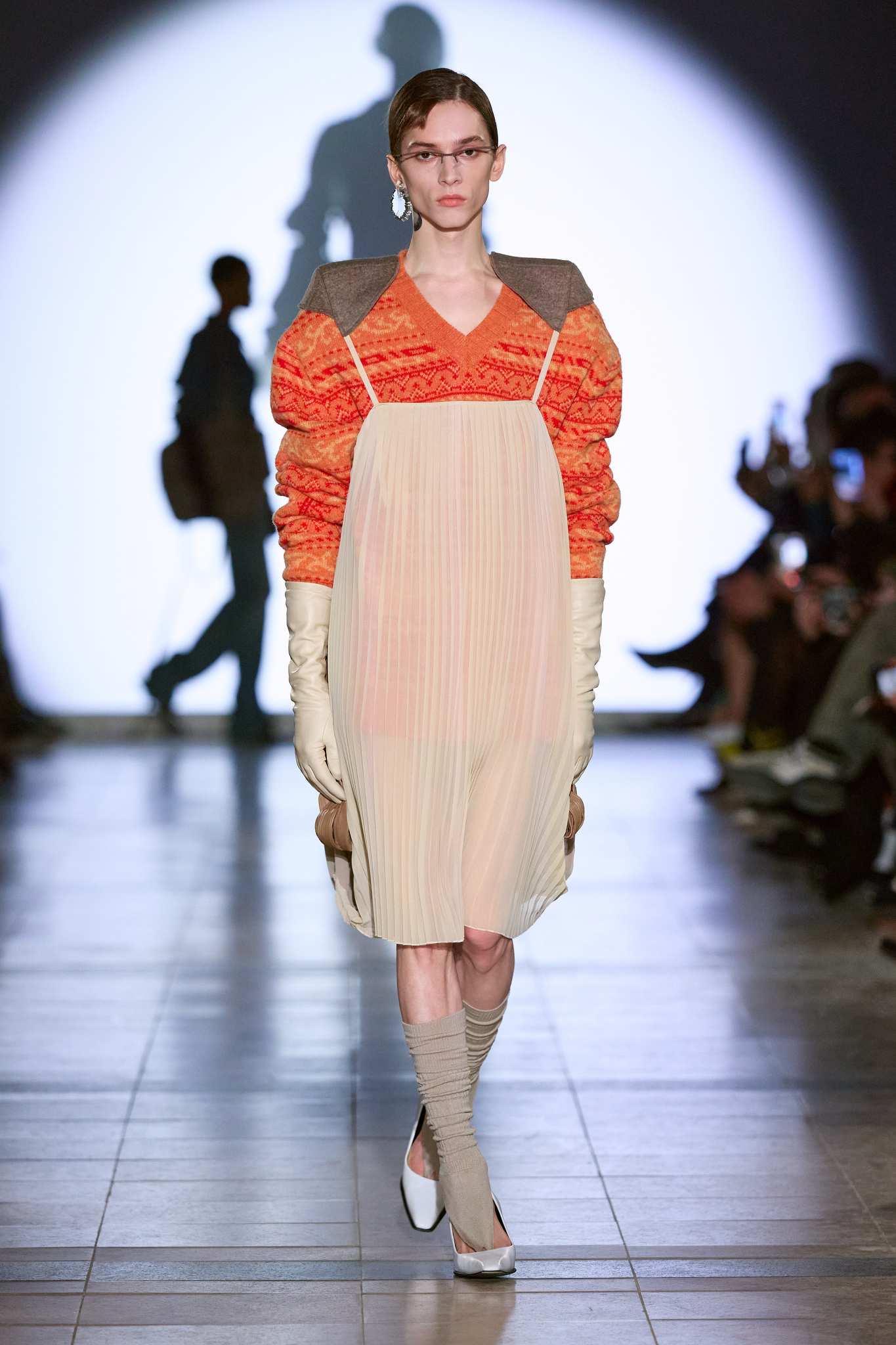 本季系列的色调较以往更加沉稳,设计上多采用更长线条和更具保护性的剪影,展示了一种冷静且充满力量的女性形象。Kegels 利用影像投射技术,将模特的阴影与他们的动作相对比,制造出一场视觉上的错位,呈现了不完美和幽默感。通过对剪裁的巧妙运用,例如圆形袖口和改变肩线的设计,Kegels 赋予了服装一种「即使你不自信,也能看起来充满自信」的效果。