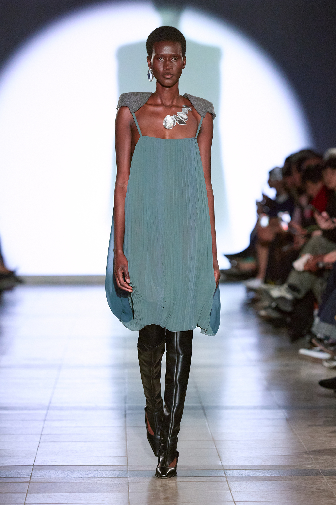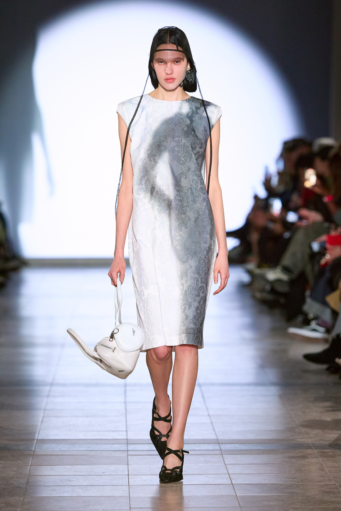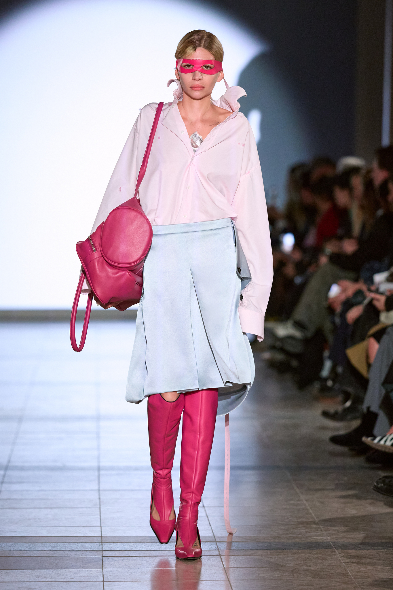 为了更好地展现「气场」概念,部分连衣裙采用了泡泡形状的布料披肩,作为衣物的「保护层」,可根据情绪调整,展现出不同的视觉效果。系列中的鞋履和皮帽使用了不规则的生皮材质,色彩鲜明,传达出一种「具有攻击性和保护性」的设计理念。最终,Kegels 将气场与外界形象联系,通过服装的视觉层次变化,展现了每个人在他人眼中的不同面貌。