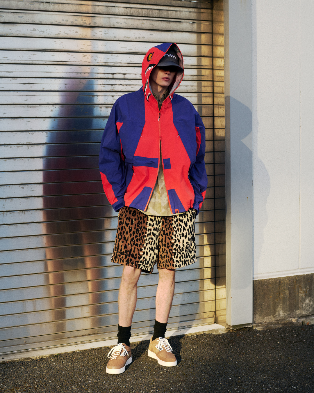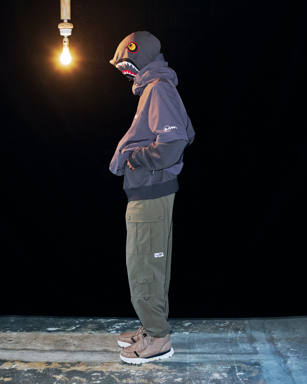 设计层面上,Kazuki Kuraishi 将其标志性的机能主义思维注入品牌经典廓形之中,推出包括全新 After-Hood Shark Hoodie、可抵御复杂环境的三层结构技术外壳夹克,以及多款数字迷彩叠搭单品在内的核心款式。通过对面料质感与实穿性能的升级,此番合作不仅延续了 BAPE 的标志性 DNA,也以更精炼、技术化的表达方式,为传奇街头品牌带来全新进化方向。