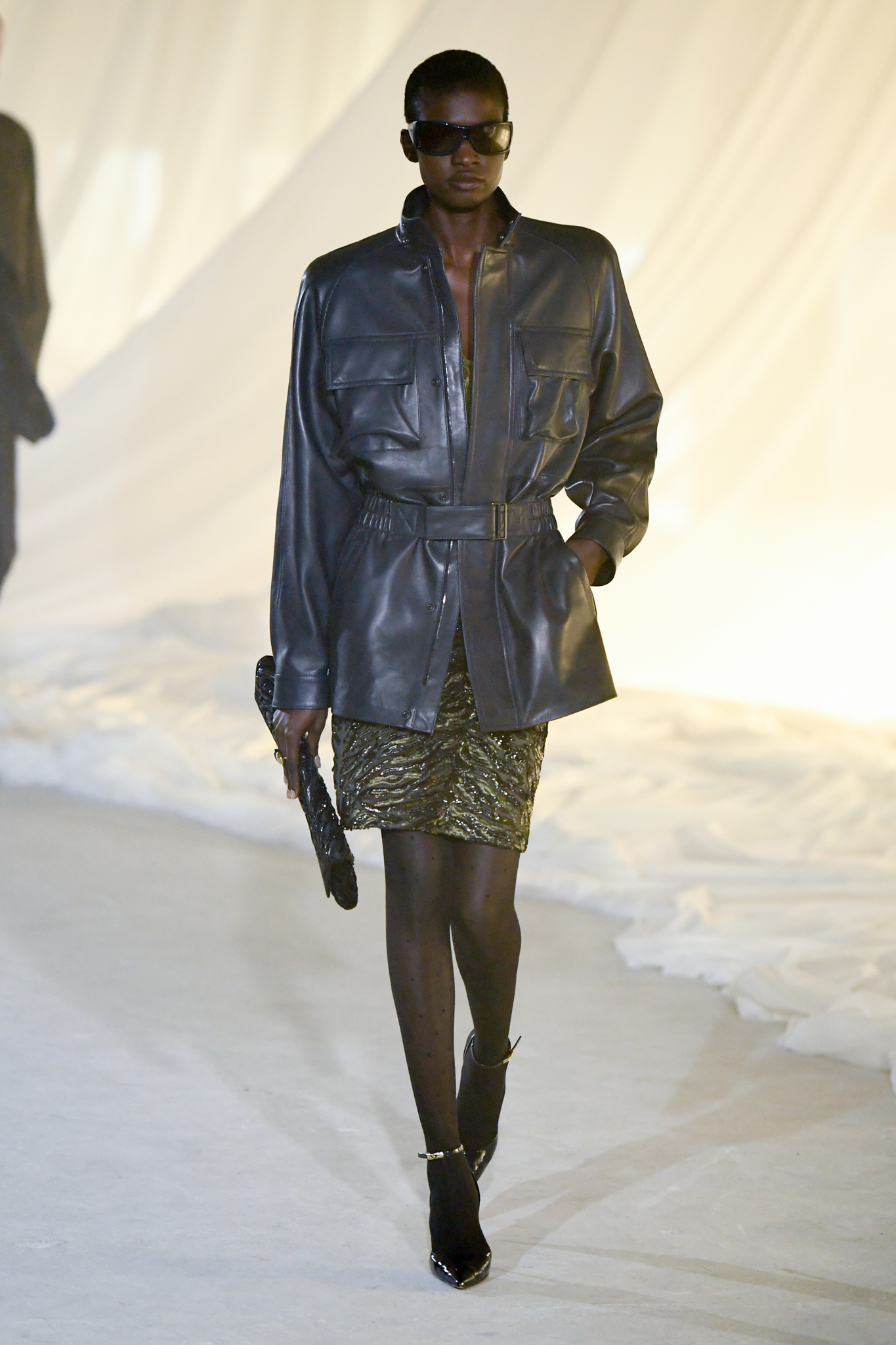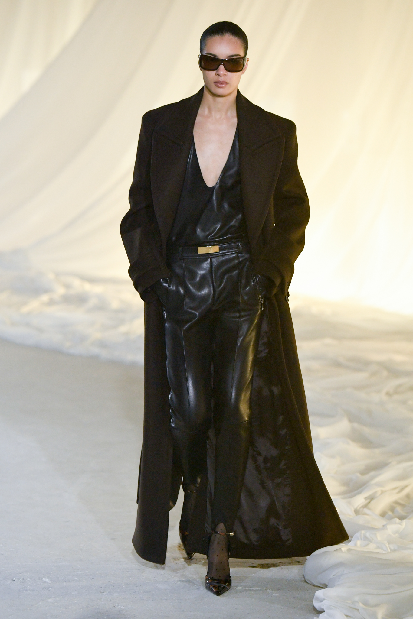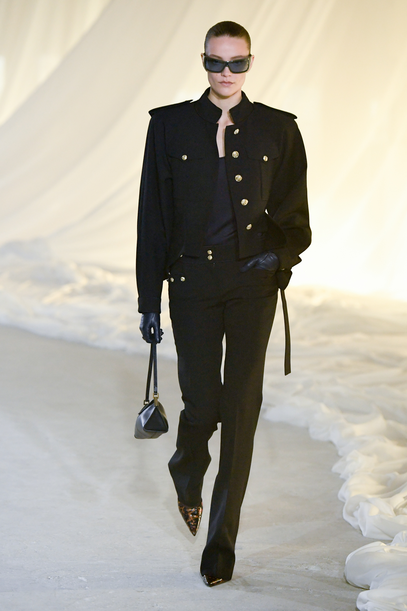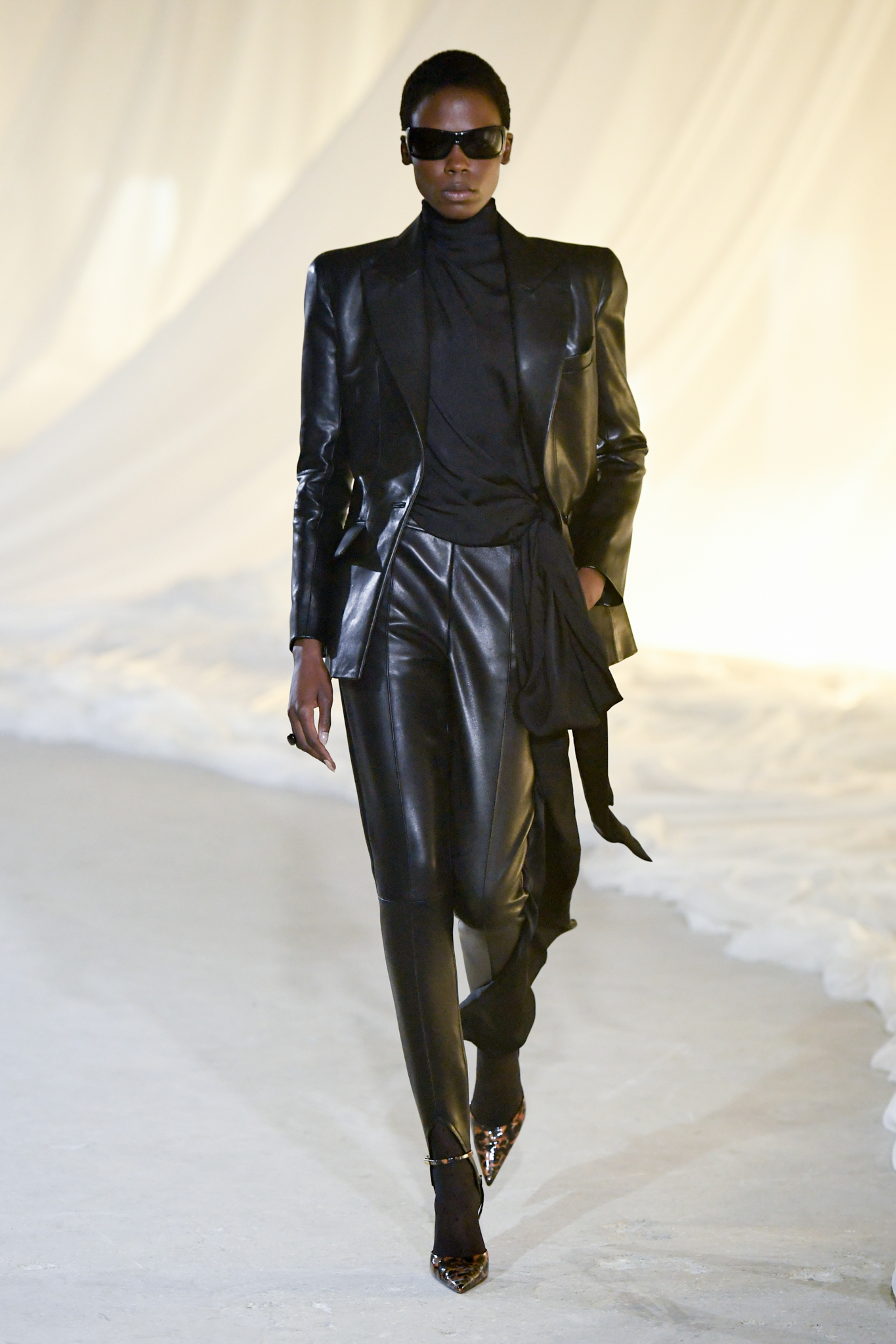 系列灵感版图亦涵盖 Tony Scott 的《The Hunger》与 David Lynch 的《Mulholland Drive》,在光影与情绪之间铺陈出戏剧张力。在延续品牌高订工艺传统的同时,Tron 巧妙交织 Olivier Rousteing 时期的都会性感基因,与自身 Atlein 式极简美学,塑造出更内敛却依旧华丽的风格。深V连身裙以腰线收束,黑色皮革外套搭配锥形裤装拉长比例,奢华光泽面料呼应品牌创立初期的高级质感。1953 年经典豹纹元素则以迷你连身裙形式回归,并以自然毛边细节收尾,在精致与野性之间取得平衡。尽管整体气质更趋冷静克制,Rousteing 时期那种锋利张扬的都市姿态仍若隐若现。而模特发丝向后梳贴,搭配超大黑色墨镜与抛光金属配件,营造出自信强势的现代女性形象。