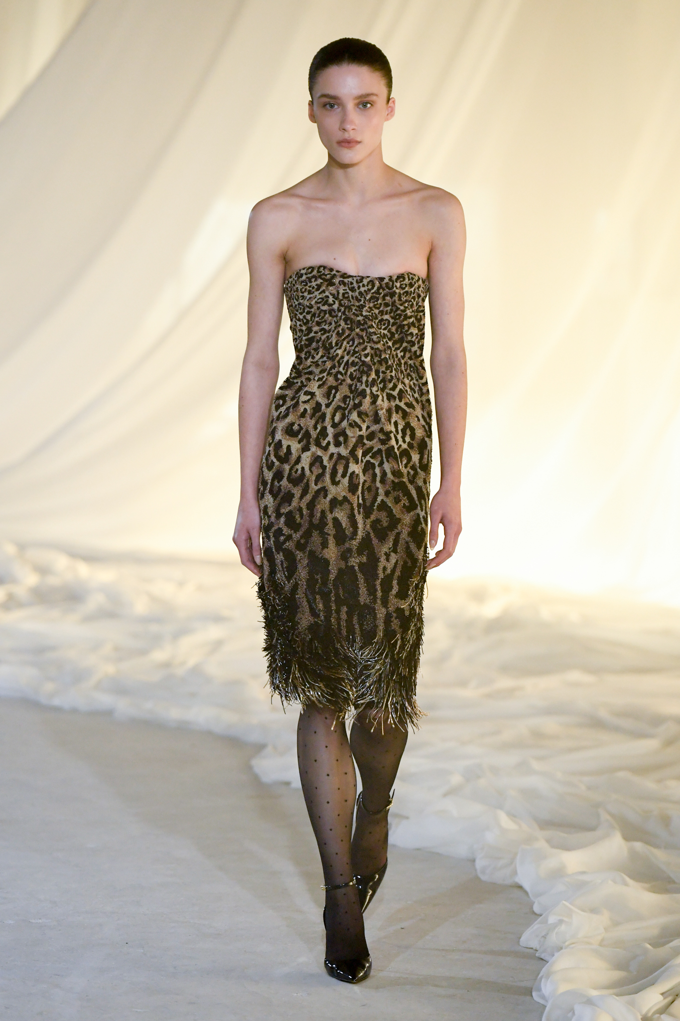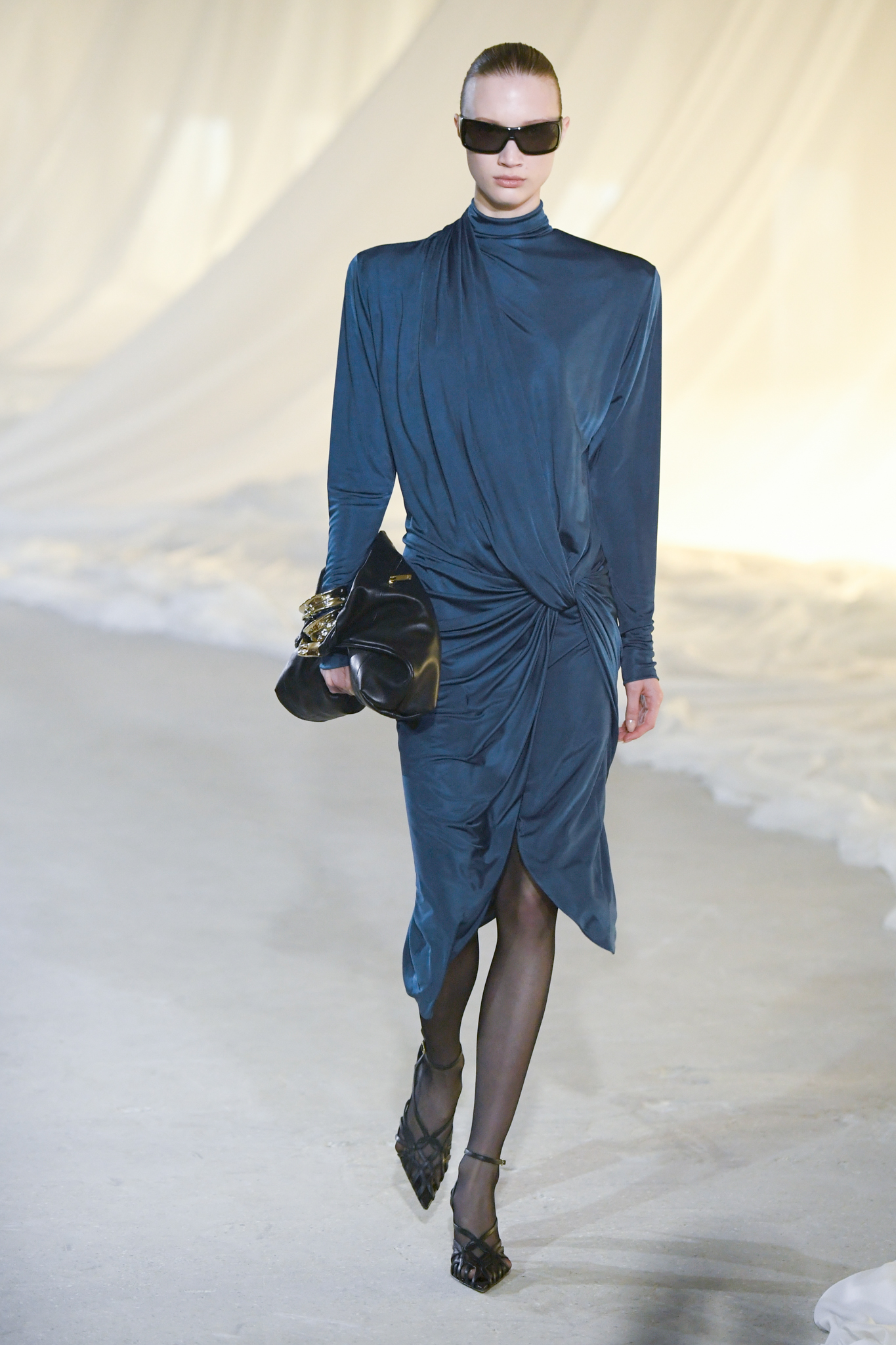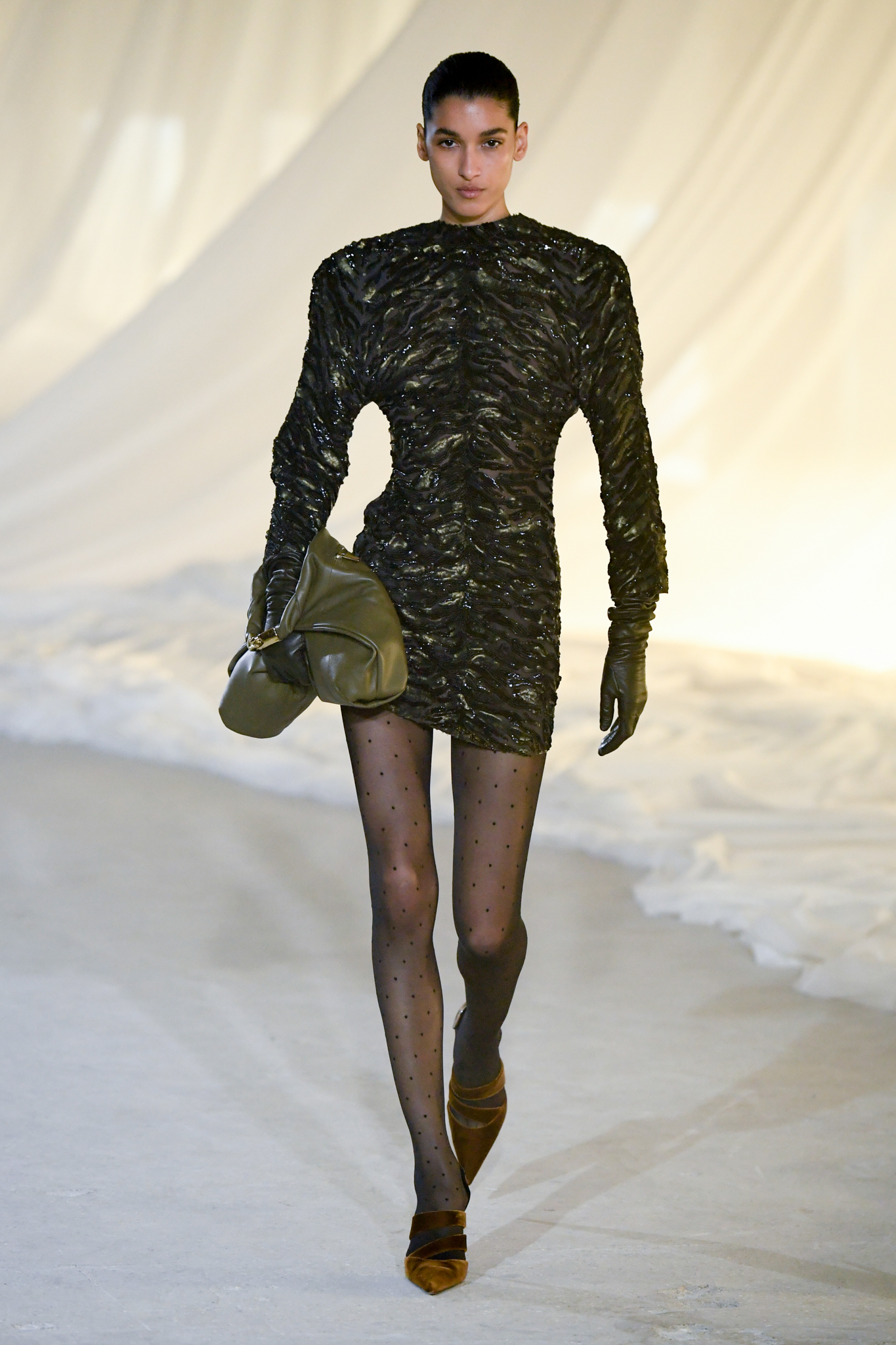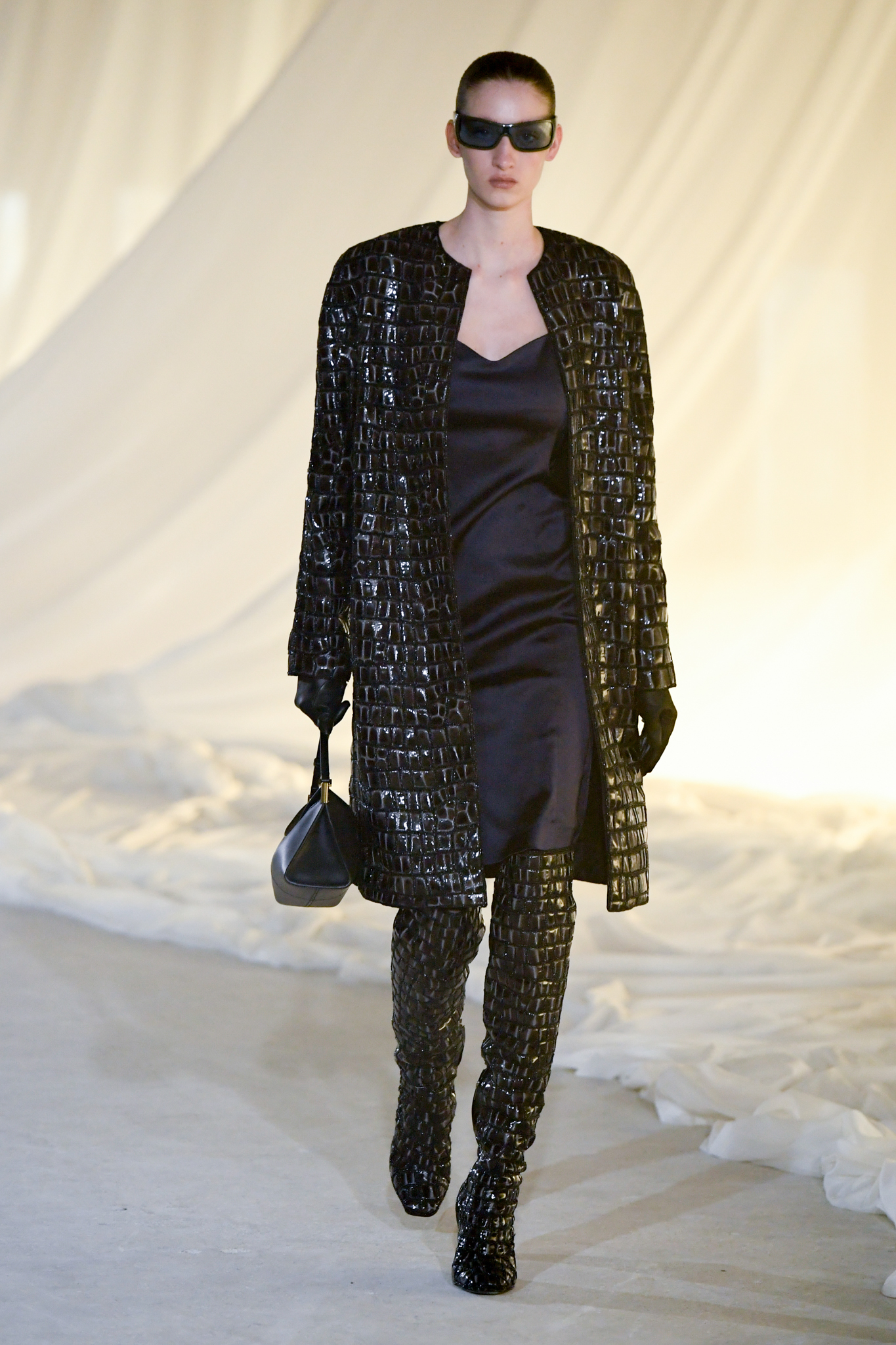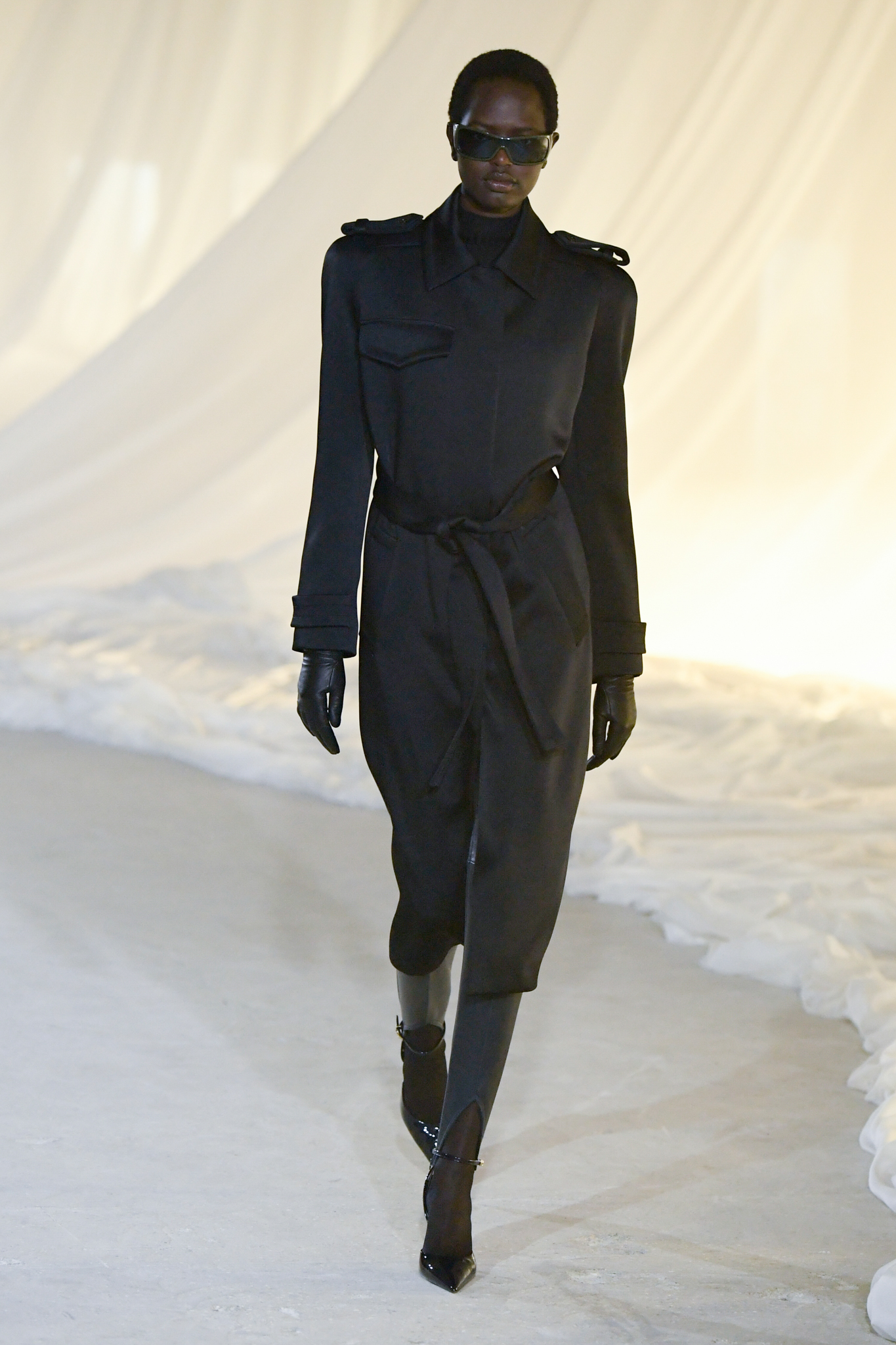 系列灵感版图亦涵盖 Tony Scott 的《The Hunger》与 David Lynch 的《Mulholland Drive》,在光影与情绪之间铺陈出戏剧张力。在延续品牌高订工艺传统的同时,Tron 巧妙交织 Olivier Rousteing 时期的都会性感基因,与自身 Atlein 式极简美学,塑造出更内敛却依旧华丽的风格。深V连身裙以腰线收束,黑色皮革外套搭配锥形裤装拉长比例,奢华光泽面料呼应品牌创立初期的高级质感。1953 年经典豹纹元素则以迷你连身裙形式回归,并以自然毛边细节收尾,在精致与野性之间取得平衡。尽管整体气质更趋冷静克制,Rousteing 时期那种锋利张扬的都市姿态仍若隐若现。而模特发丝向后梳贴,搭配超大黑色墨镜与抛光金属配件,营造出自信强势的现代女性形象。