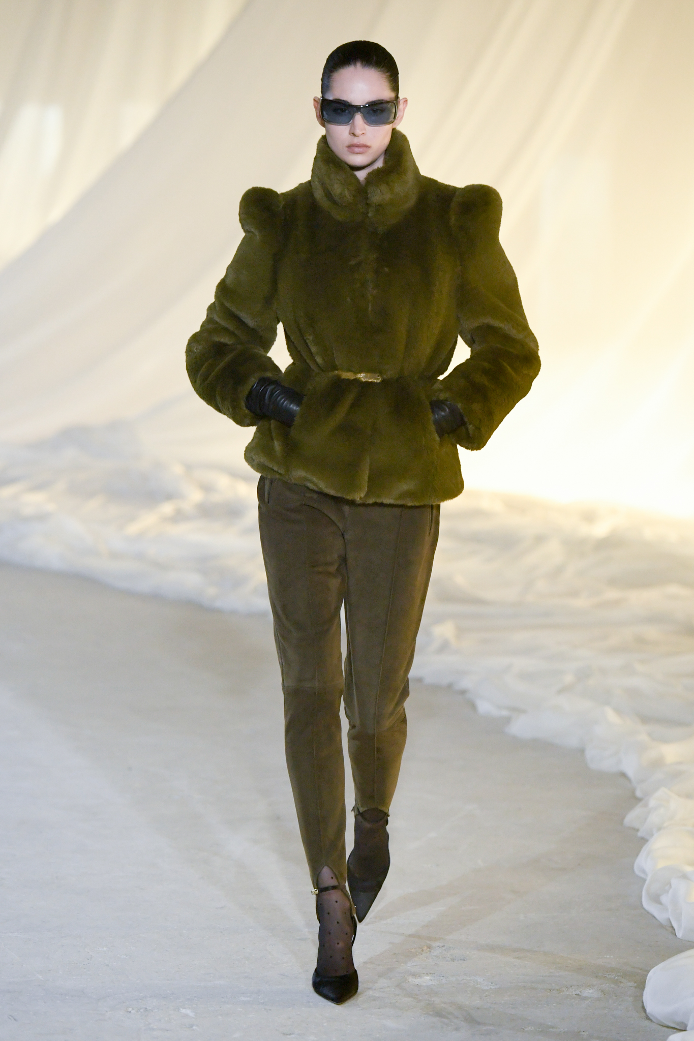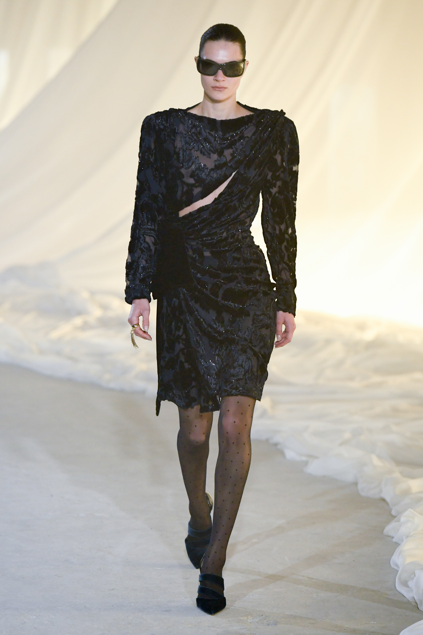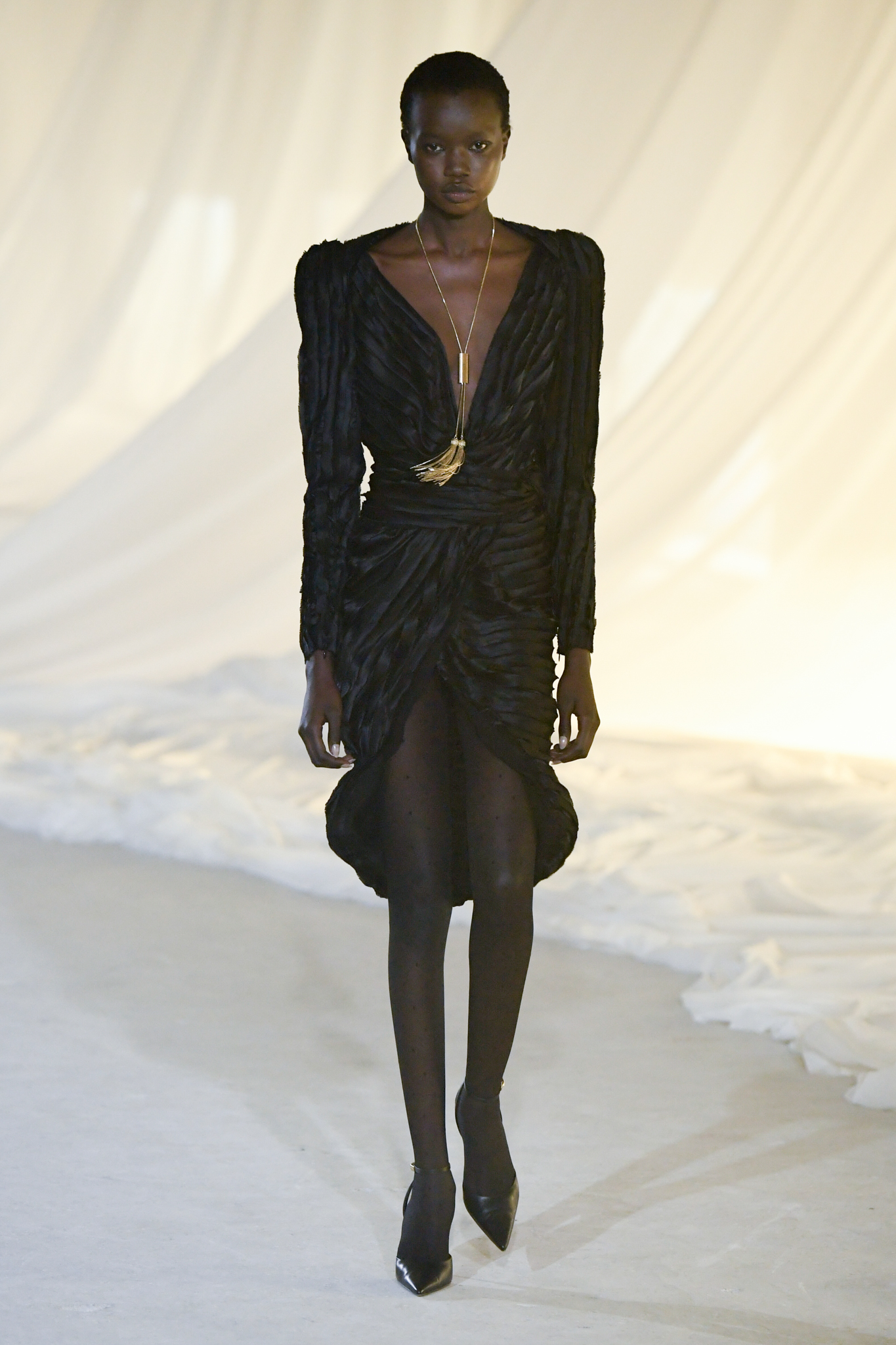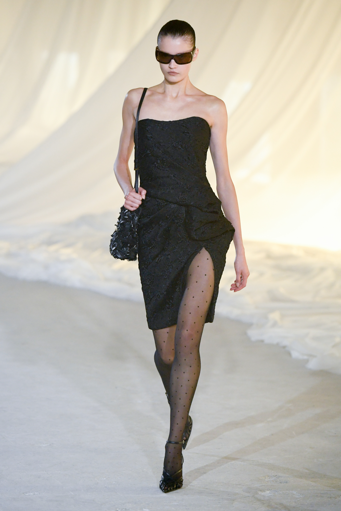 系列灵感版图亦涵盖 Tony Scott 的《The Hunger》与 David Lynch 的《Mulholland Drive》,在光影与情绪之间铺陈出戏剧张力。在延续品牌高订工艺传统的同时,Tron 巧妙交织 Olivier Rousteing 时期的都会性感基因,与自身 Atlein 式极简美学,塑造出更内敛却依旧华丽的风格。深V连身裙以腰线收束,黑色皮革外套搭配锥形裤装拉长比例,奢华光泽面料呼应品牌创立初期的高级质感。1953 年经典豹纹元素则以迷你连身裙形式回归,并以自然毛边细节收尾,在精致与野性之间取得平衡。尽管整体气质更趋冷静克制,Rousteing 时期那种锋利张扬的都市姿态仍若隐若现。而模特发丝向后梳贴,搭配超大黑色墨镜与抛光金属配件,营造出自信强势的现代女性形象。