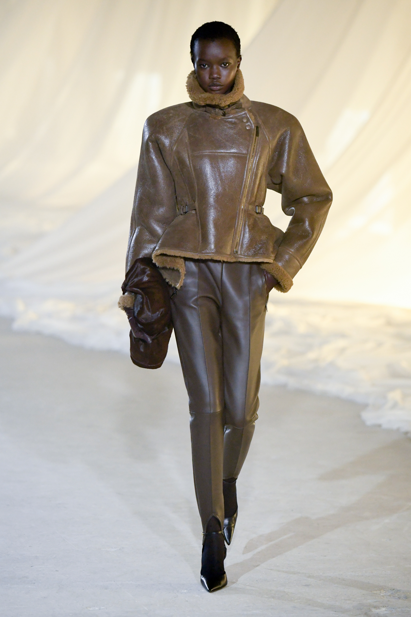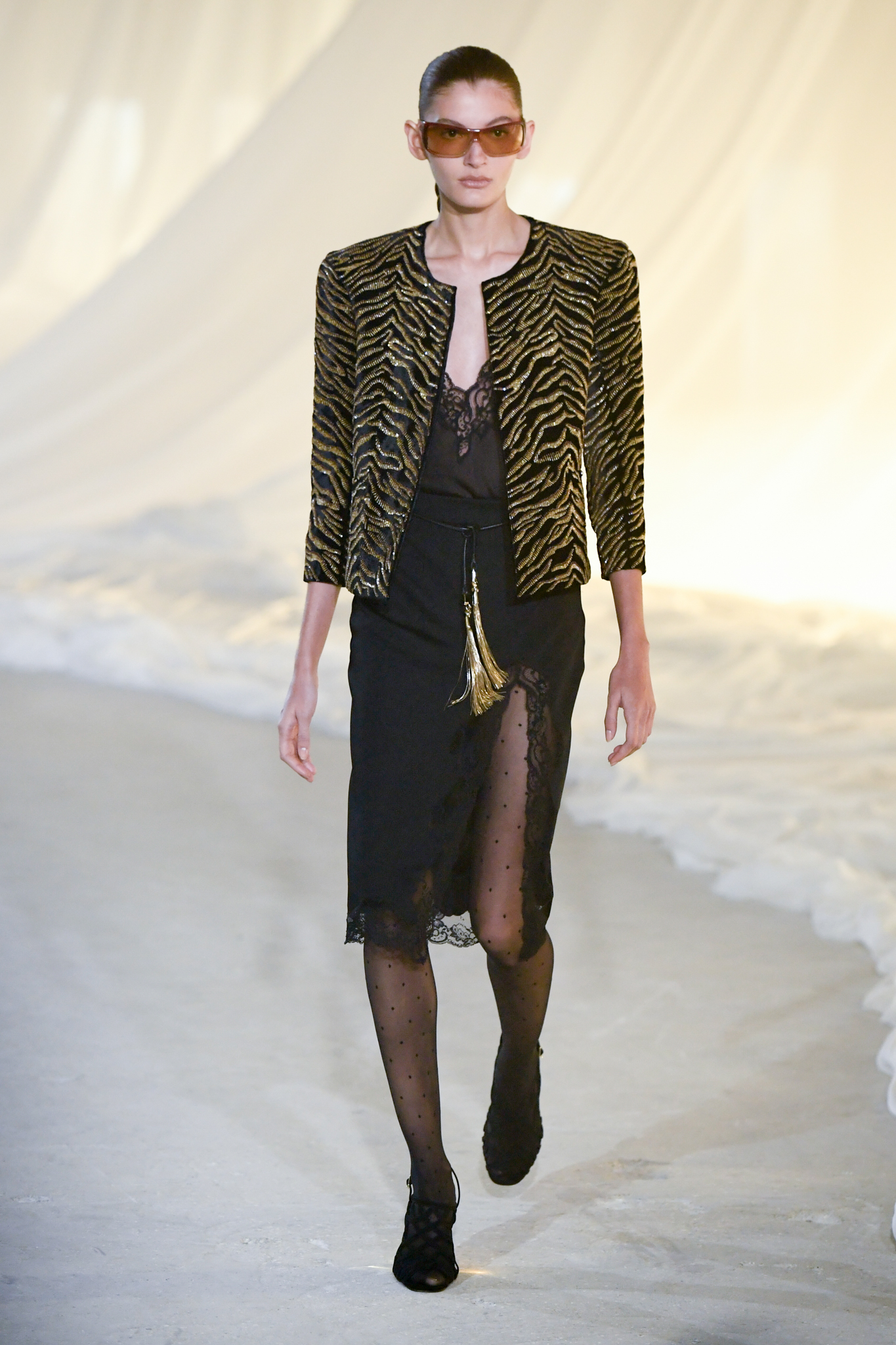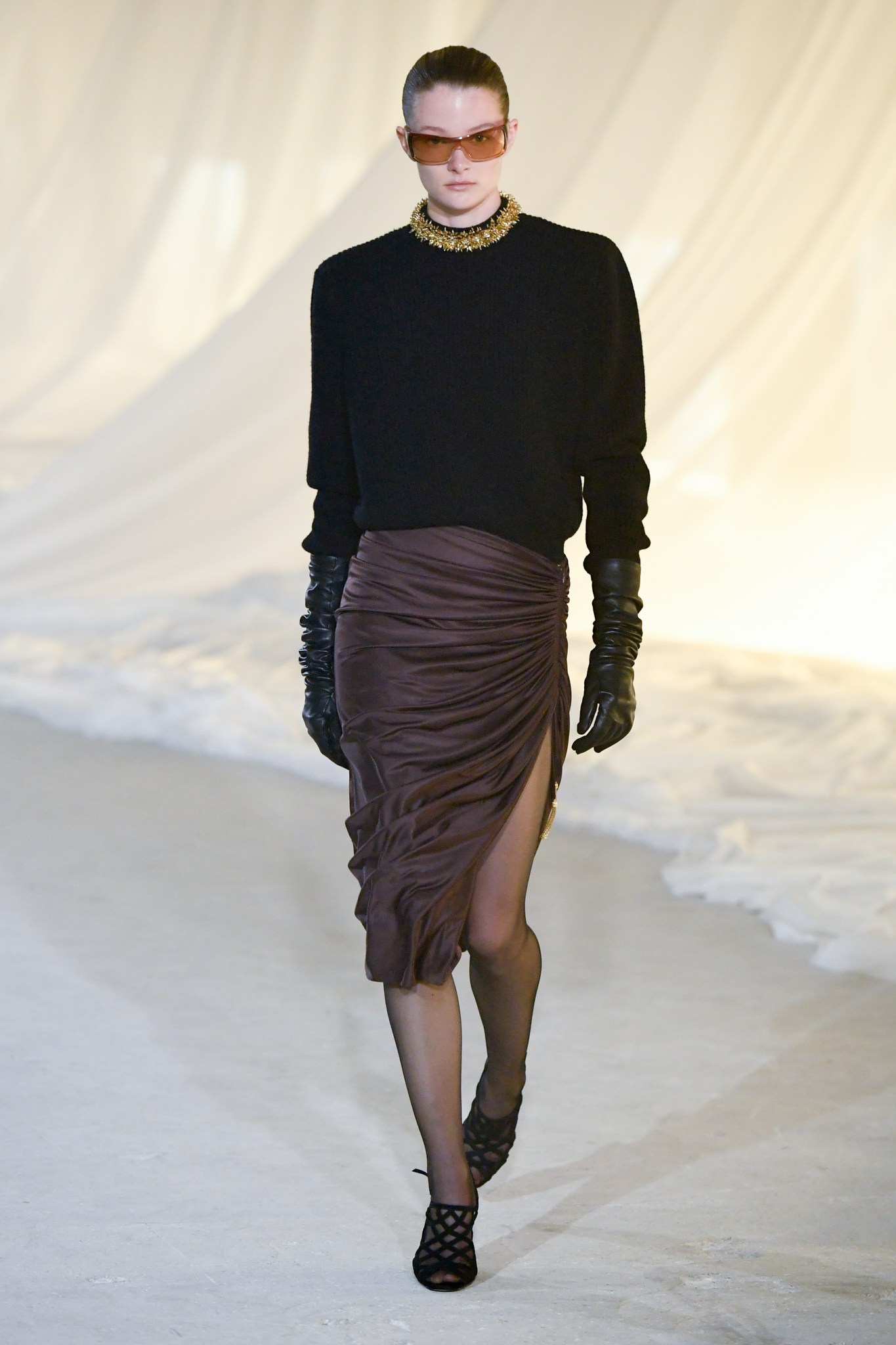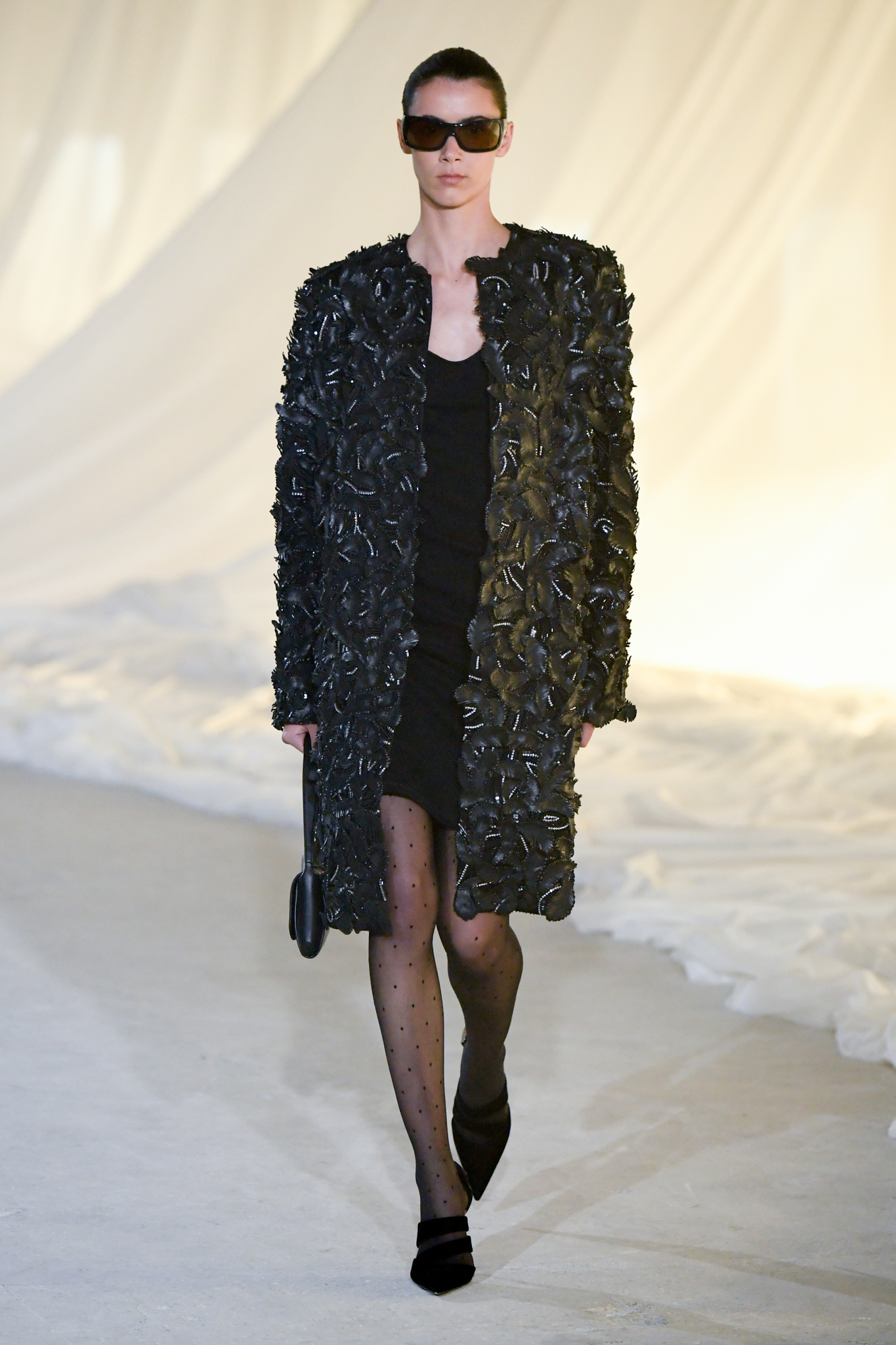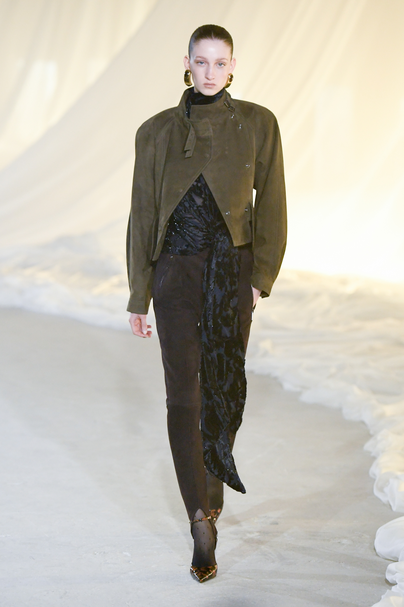系列灵感版图亦涵盖 Tony Scott 的《The Hunger》与 David Lynch 的《Mulholland Drive》,在光影与情绪之间铺陈出戏剧张力。在延续品牌高订工艺传统的同时,Tron 巧妙交织 Olivier Rousteing 时期的都会性感基因,与自身 Atlein 式极简美学,塑造出更内敛却依旧华丽的风格。深V连身裙以腰线收束,黑色皮革外套搭配锥形裤装拉长比例,奢华光泽面料呼应品牌创立初期的高级质感。1953 年经典豹纹元素则以迷你连身裙形式回归,并以自然毛边细节收尾,在精致与野性之间取得平衡。尽管整体气质更趋冷静克制,Rousteing 时期那种锋利张扬的都市姿态仍若隐若现。而模特发丝向后梳贴,搭配超大黑色墨镜与抛光金属配件,营造出自信强势的现代女性形象。