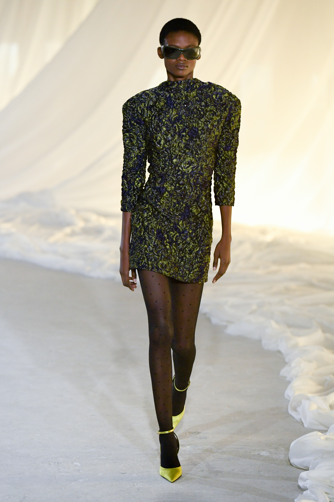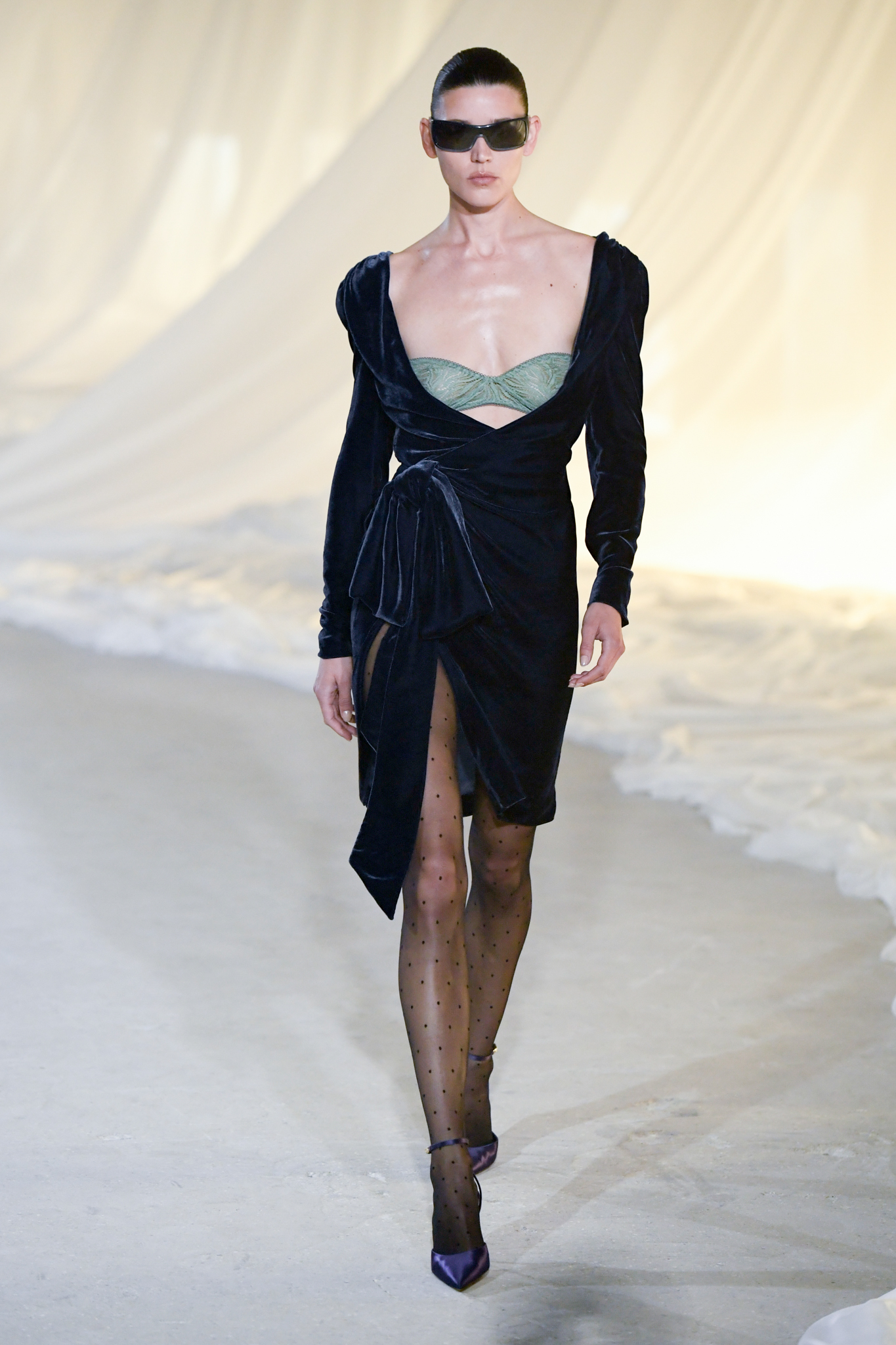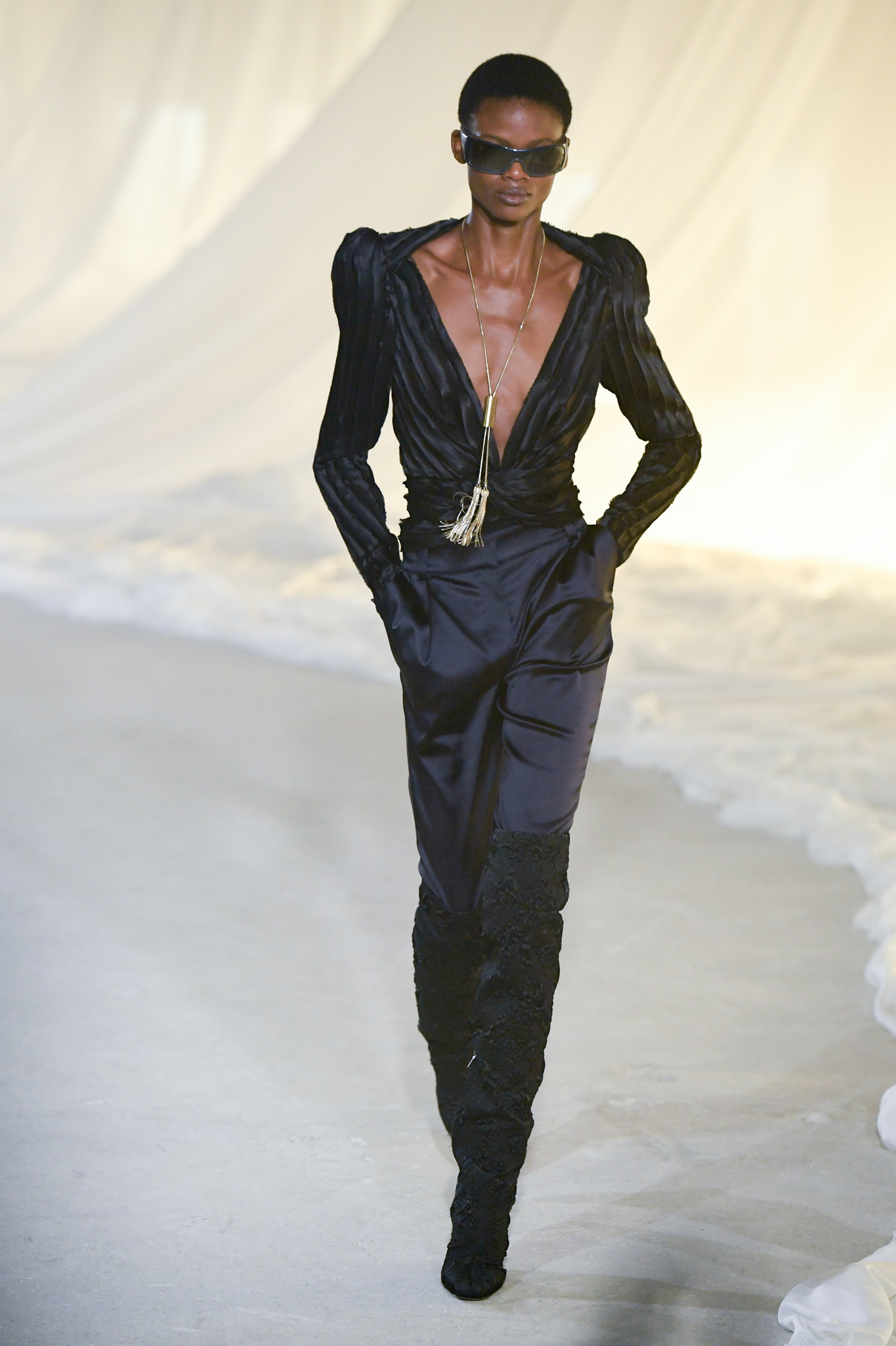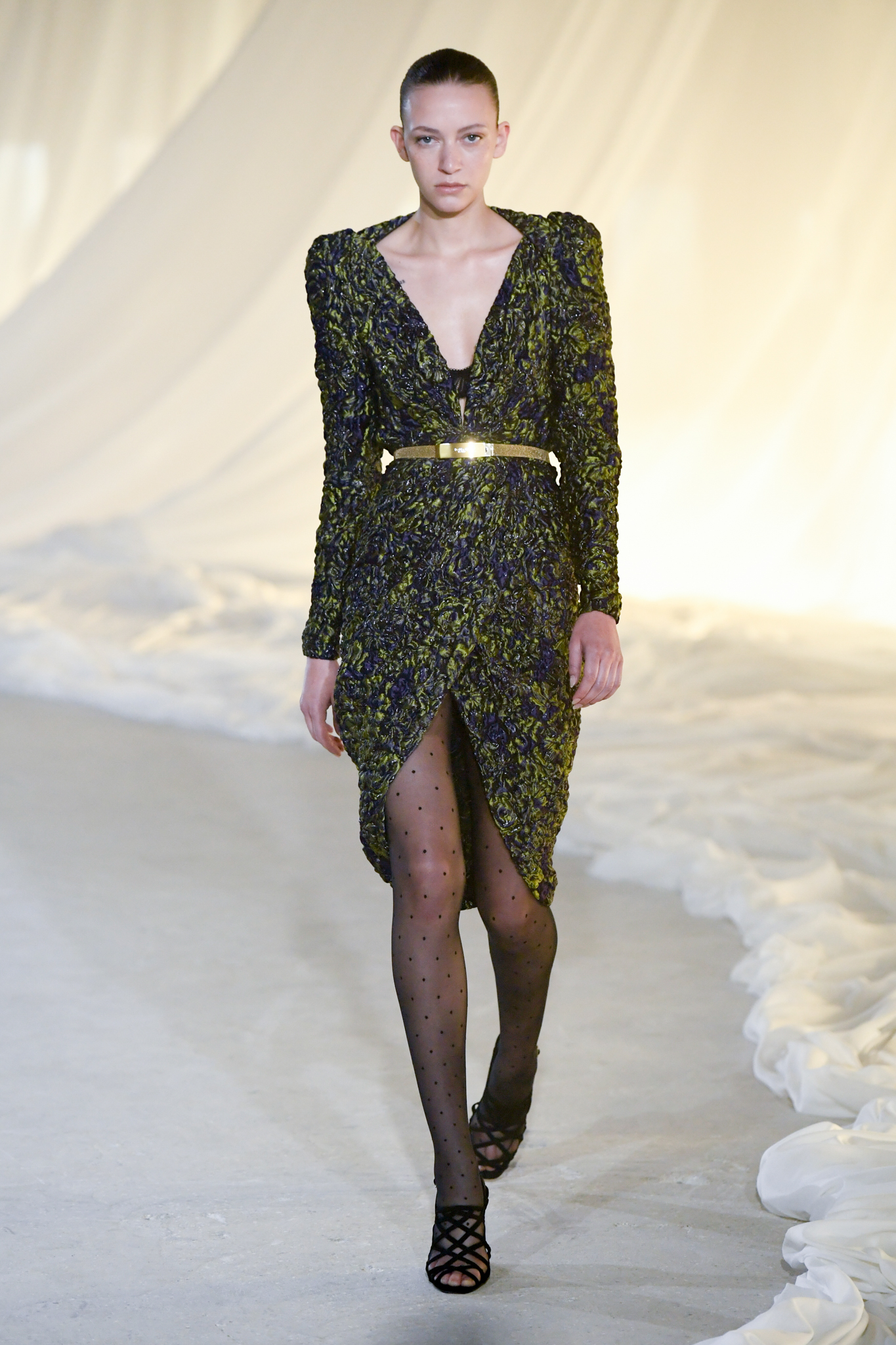 系列灵感版图亦涵盖 Tony Scott 的《The Hunger》与 David Lynch 的《Mulholland Drive》,在光影与情绪之间铺陈出戏剧张力。在延续品牌高订工艺传统的同时,Tron 巧妙交织 Olivier Rousteing 时期的都会性感基因,与自身 Atlein 式极简美学,塑造出更内敛却依旧华丽的风格。深V连身裙以腰线收束,黑色皮革外套搭配锥形裤装拉长比例,奢华光泽面料呼应品牌创立初期的高级质感。1953 年经典豹纹元素则以迷你连身裙形式回归,并以自然毛边细节收尾,在精致与野性之间取得平衡。尽管整体气质更趋冷静克制,Rousteing 时期那种锋利张扬的都市姿态仍若隐若现。而模特发丝向后梳贴,搭配超大黑色墨镜与抛光金属配件,营造出自信强势的现代女性形象。