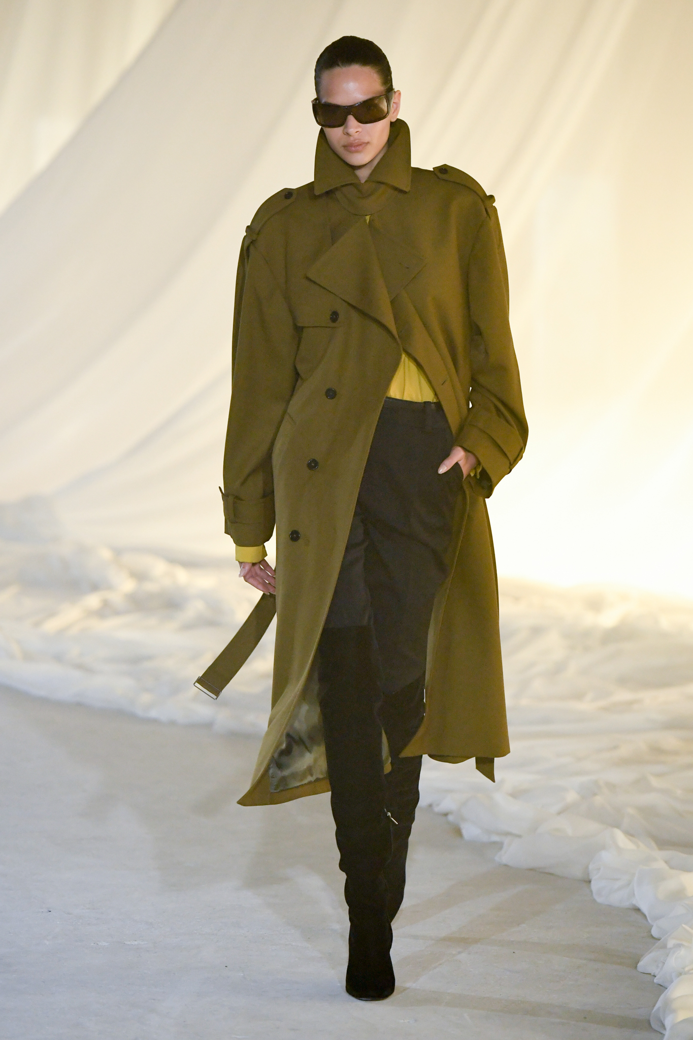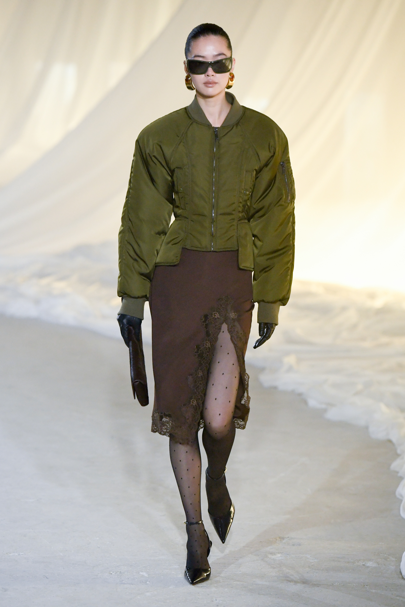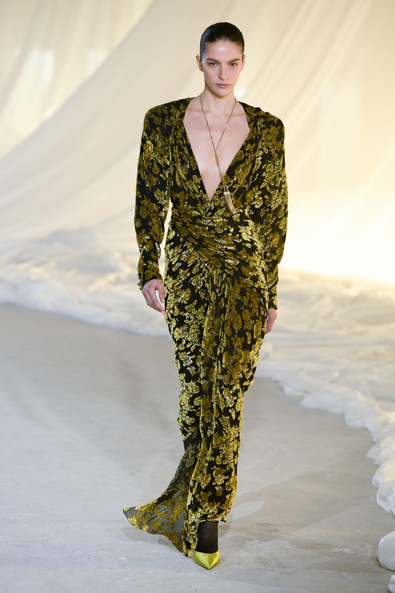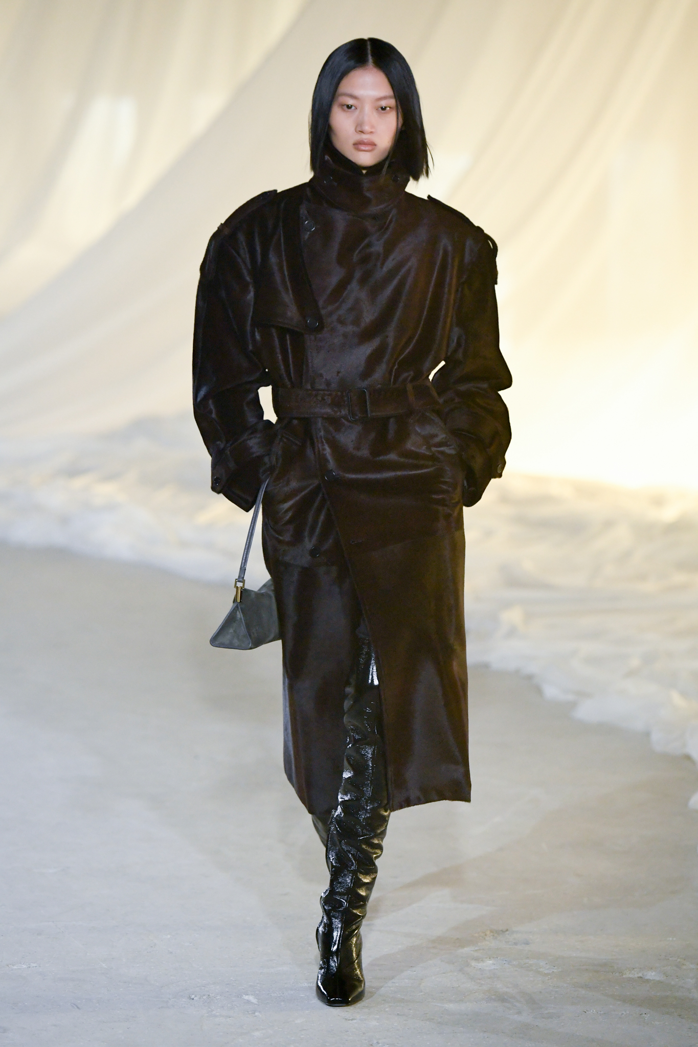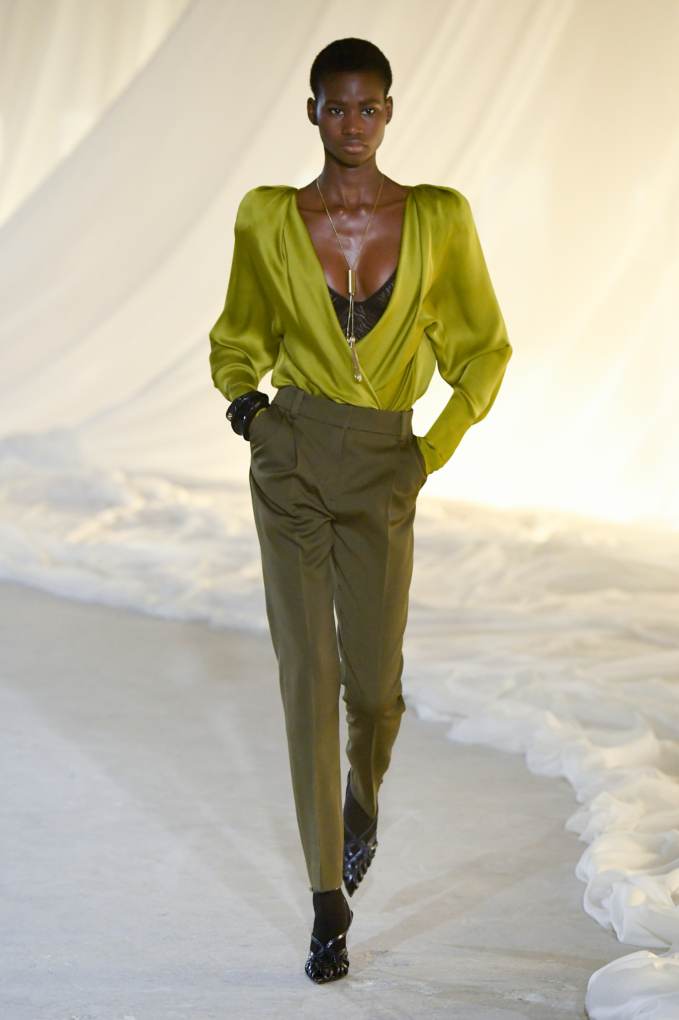 系列灵感版图亦涵盖 Tony Scott 的《The Hunger》与 David Lynch 的《Mulholland Drive》,在光影与情绪之间铺陈出戏剧张力。在延续品牌高订工艺传统的同时,Tron 巧妙交织 Olivier Rousteing 时期的都会性感基因,与自身 Atlein 式极简美学,塑造出更内敛却依旧华丽的风格。深V连身裙以腰线收束,黑色皮革外套搭配锥形裤装拉长比例,奢华光泽面料呼应品牌创立初期的高级质感。1953 年经典豹纹元素则以迷你连身裙形式回归,并以自然毛边细节收尾,在精致与野性之间取得平衡。尽管整体气质更趋冷静克制,Rousteing 时期那种锋利张扬的都市姿态仍若隐若现。而模特发丝向后梳贴,搭配超大黑色墨镜与抛光金属配件,营造出自信强势的现代女性形象。