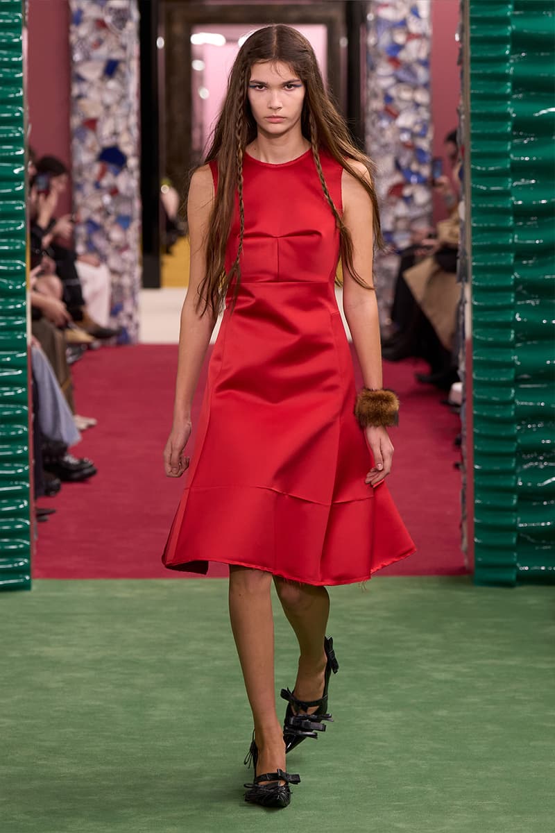 设计细节方面,传统图案被打散重组:Prince of Wales 格纹在比例与色调中游移,技术缎面上绽放宛如壁毯的绣球花图案,动物纹理被高度抽象化。超长真丝围巾印有 Paul Kooiker「art school」系列放大肖像,强化品牌与艺术社群的联系。配饰则以弯曲尖头高跟鞋、毛绒细节弹性长靴稳住造型重心,并推出结构感单柄硬挺手袋及回归的 Camero weekender 尺寸。