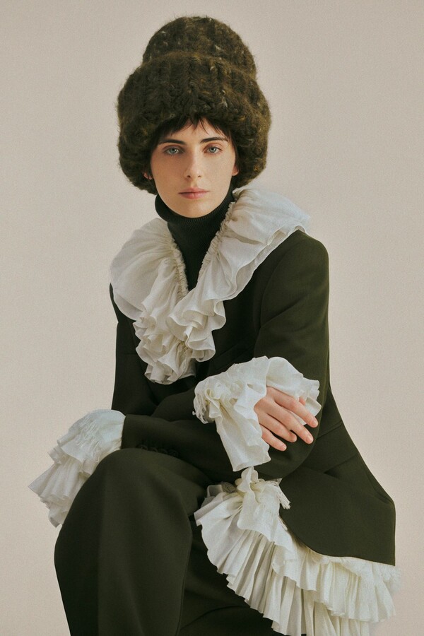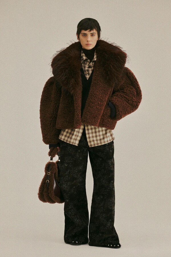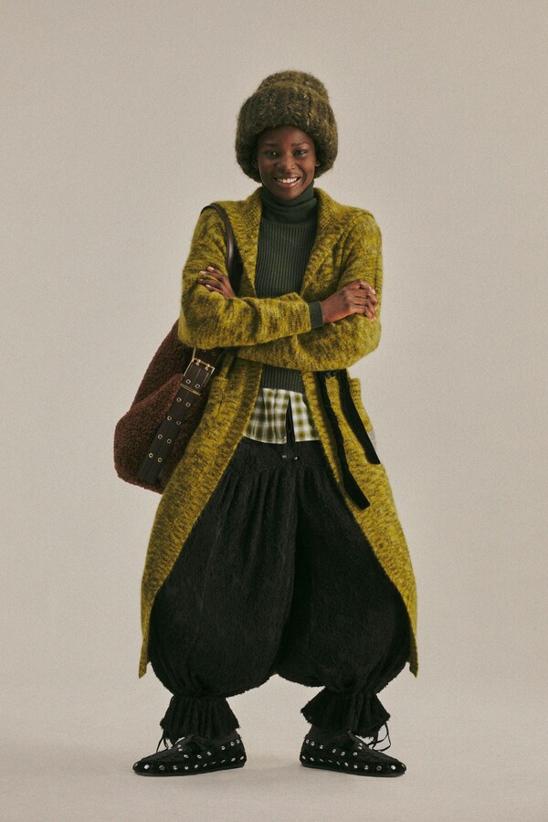 牛仔面料呈现出一种建筑般的质感——高腰、略带硬挺的版型为轻盈飘逸的内搭增添了厚重感。粗花呢和厚实的针织面料则赋予了服装重量感,无论是在实际还是视觉上都为整体注入了触感上的沉稳。