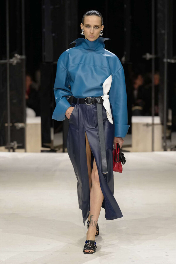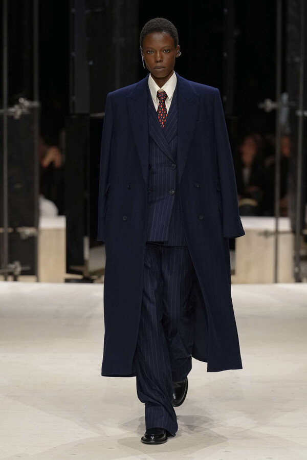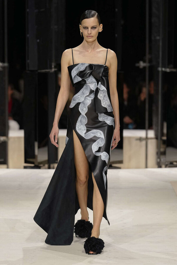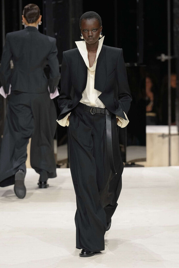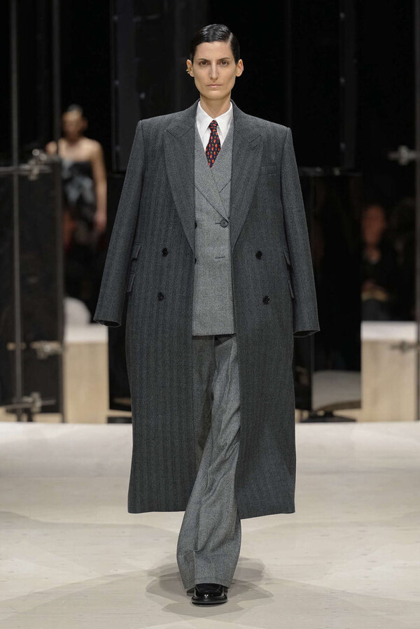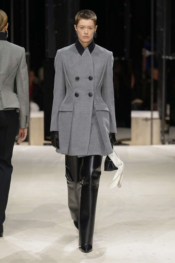剪裁是这一季的支柱。开场造型是剪裁利落的燕尾服外搭一件男士风大衣,沉稳内敛。Spencer 夹克贯穿了整个系列,其收腰设计搭配雕塑感十足的裙摆,巧妙地勾勒出曼妙的身姿。这些精准的廓形为整体奠定了基调,接下来是则更流畅的线条——包括斜裁丝绒吊带裙、搭配质感针织衫的窄款皮裙,以及既如长袍般舒适包裹身形又保持优雅线条的大衣。