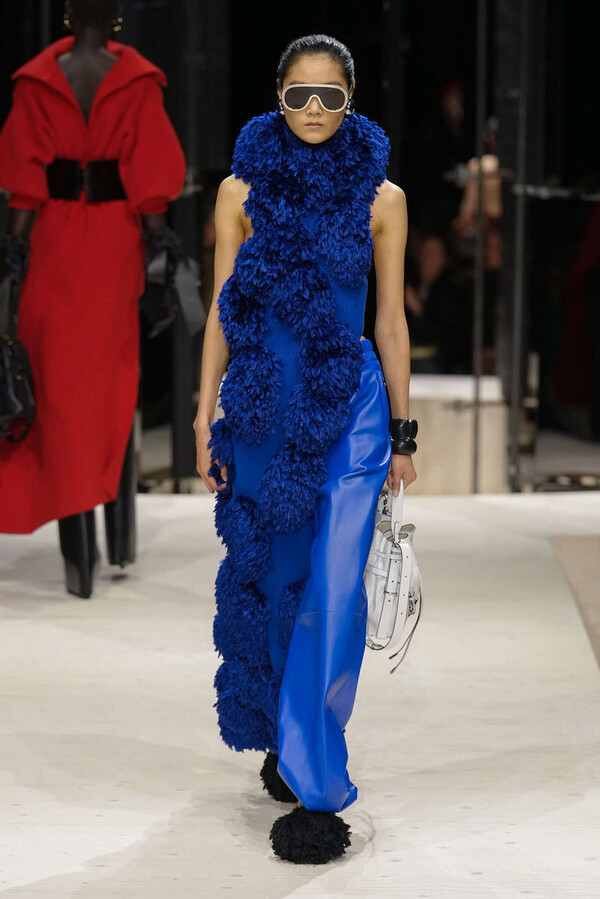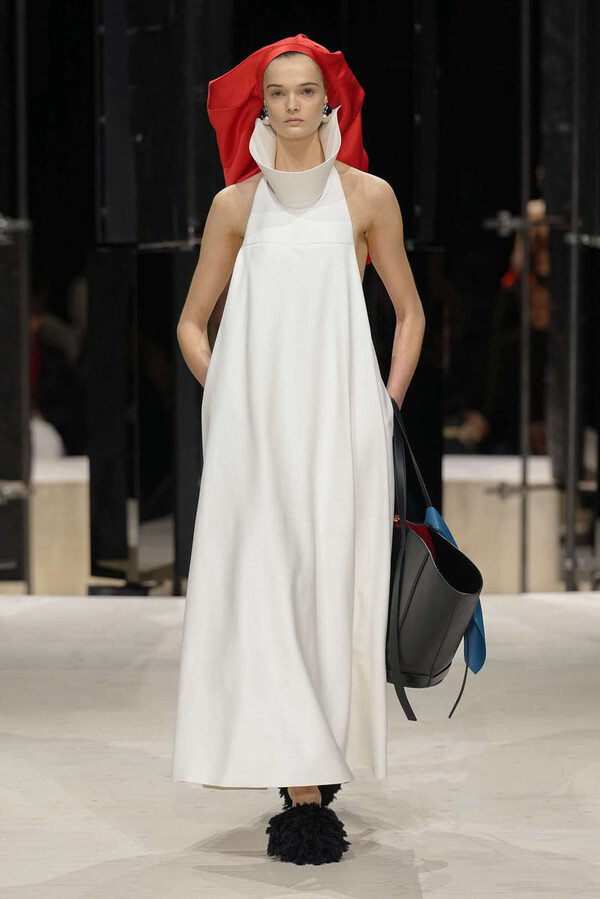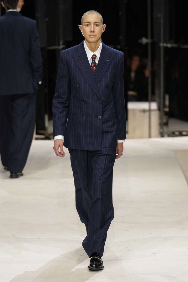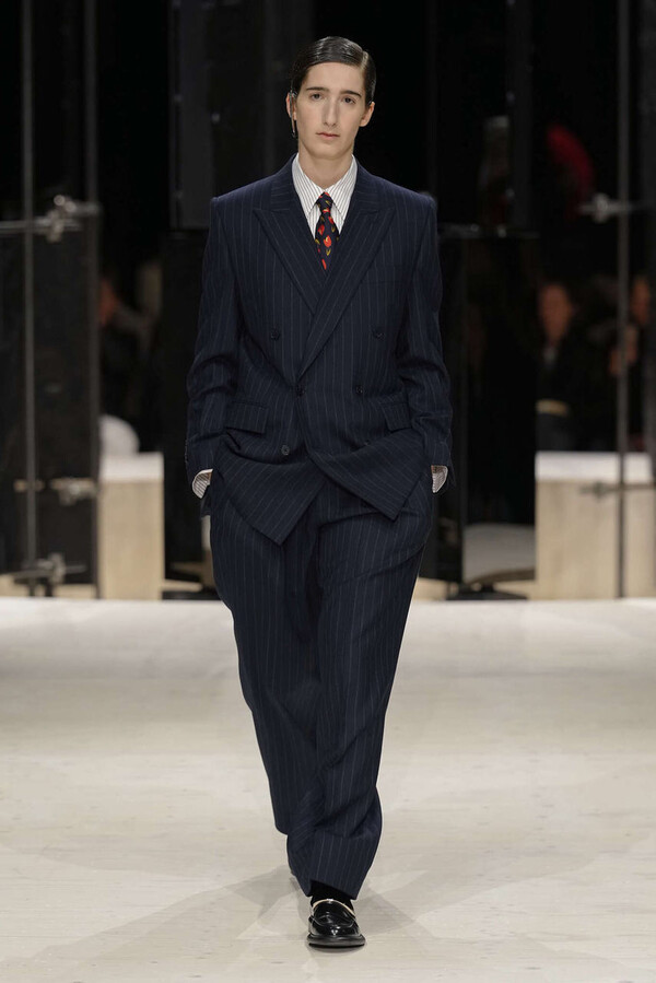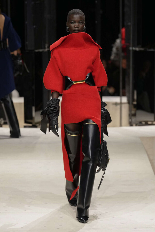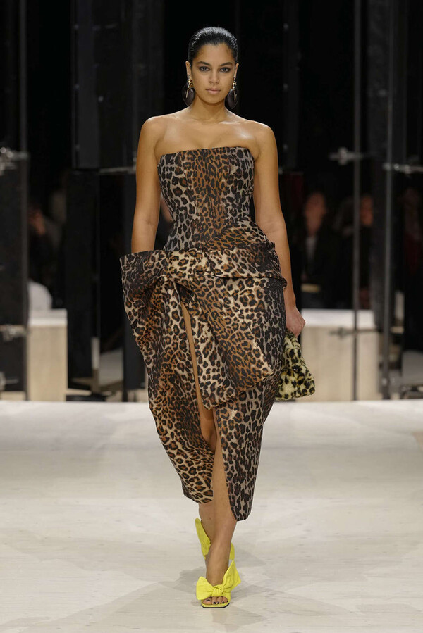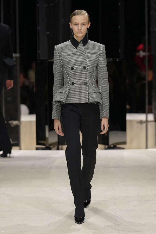 剪裁是这一季的支柱。开场造型是剪裁利落的燕尾服外搭一件男士风大衣,沉稳内敛。Spencer 夹克贯穿了整个系列,其收腰设计搭配雕塑感十足的裙摆,巧妙地勾勒出曼妙的身姿。这些精准的廓形为整体奠定了基调,接下来是则更流畅的线条——包括斜裁丝绒吊带裙、搭配质感针织衫的窄款皮裙,以及既如长袍般舒适包裹身形又保持优雅线条的大衣。