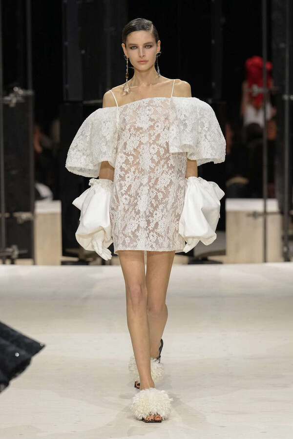 在其他部分,Sarah Burton 展现了一种更为自由、近乎绘画般的感性。一件晚礼服以层叠的方式饰以绘画、刺绣、撕裂和流苏装饰,令人联想起 Flemish 的静物画。设计师还将她初到巴黎时购入的一件破旧古董和服融入设计,其丝绸图案以一种略显不规则的方式被运用到新的服装中。一切仿佛在诉说:服装不仅是装饰品,更是情感的载体。