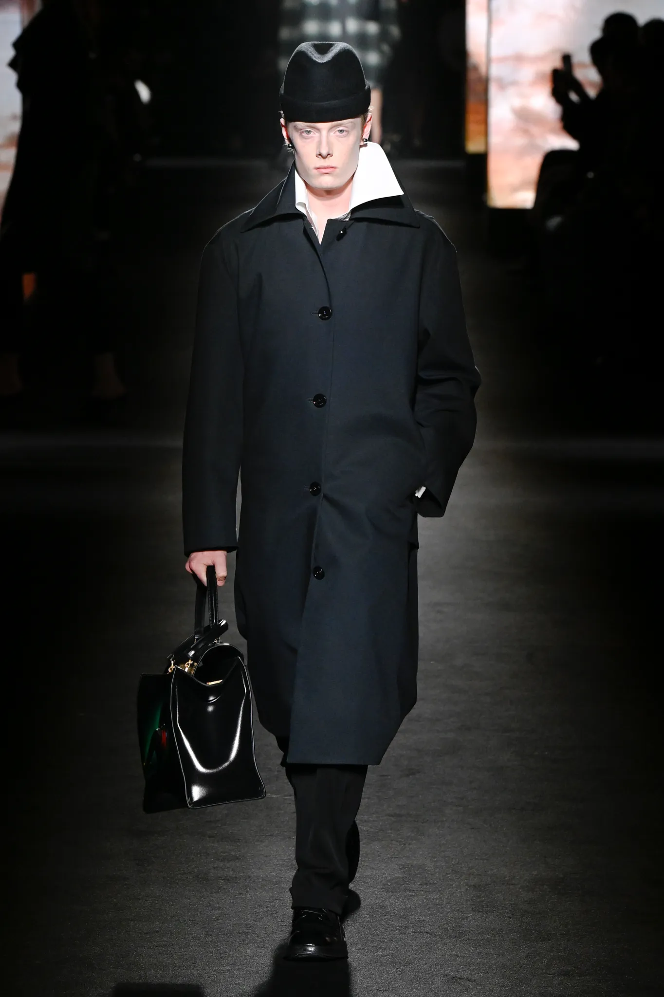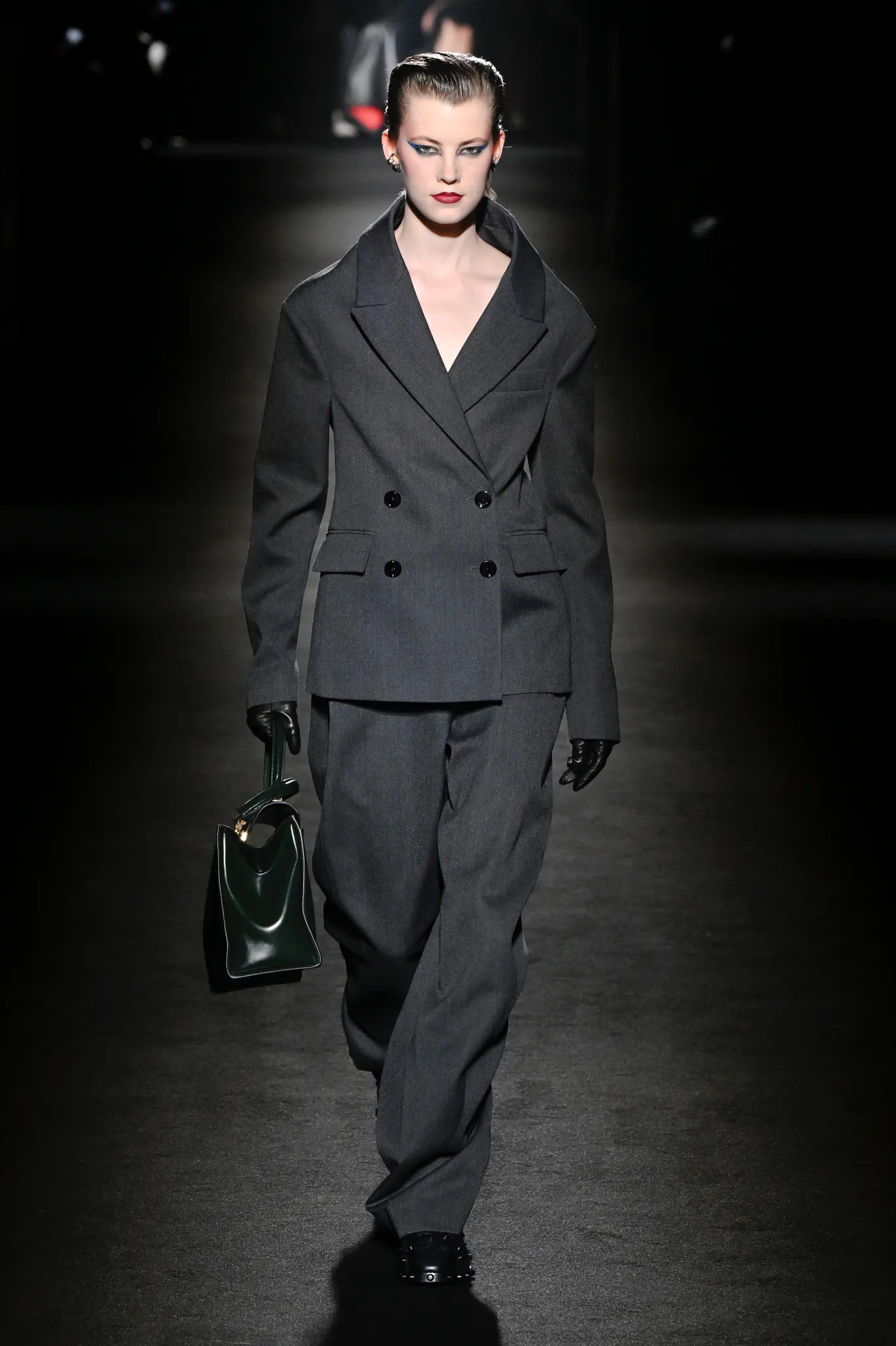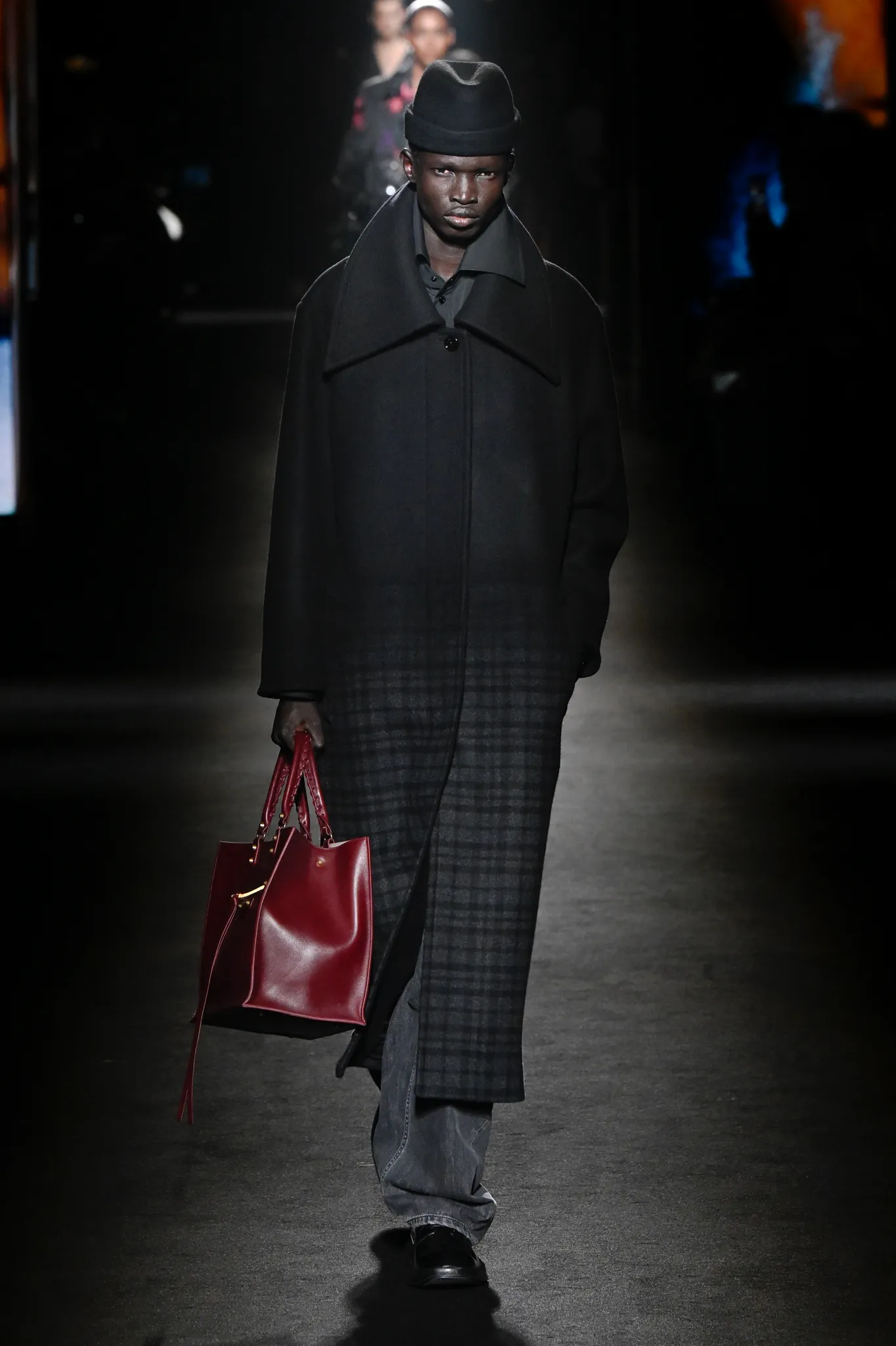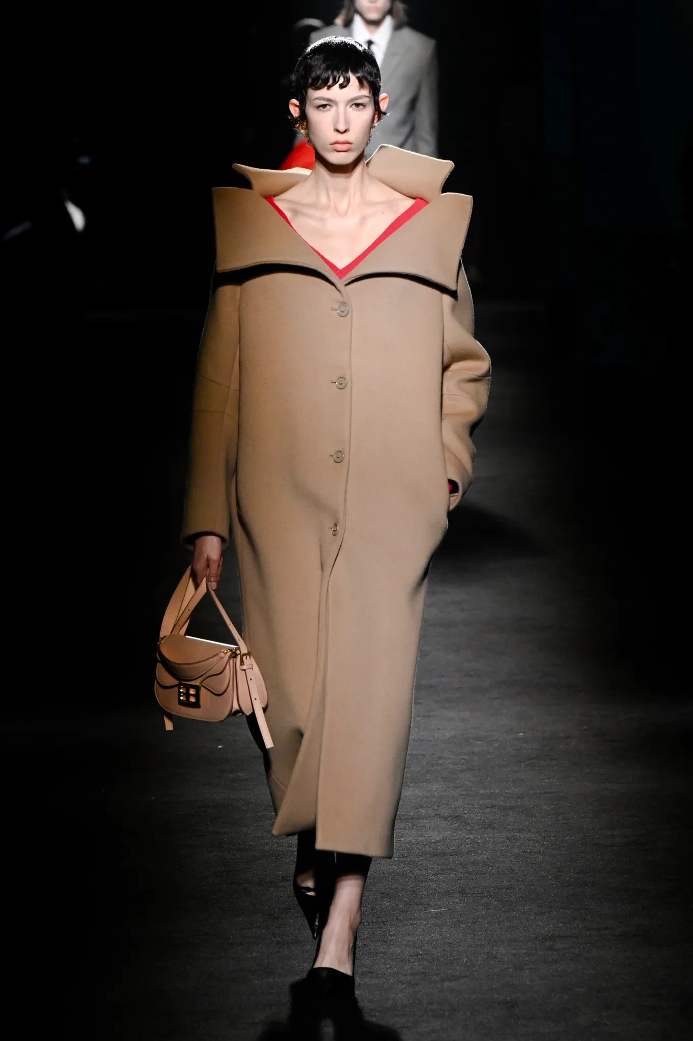 然而,Piccioli 并未完全偏向年轻化。模特选择更具多样性,无论年龄还是体型都包容在内;他利用明暗对比展现意大利风情,丝绒与针织面料的垂坠礼服交错搭配修身剪裁,兼顾成熟女性审美。男装同样加入帕克大衣、茧形大衣等款式,更适合成熟男士。