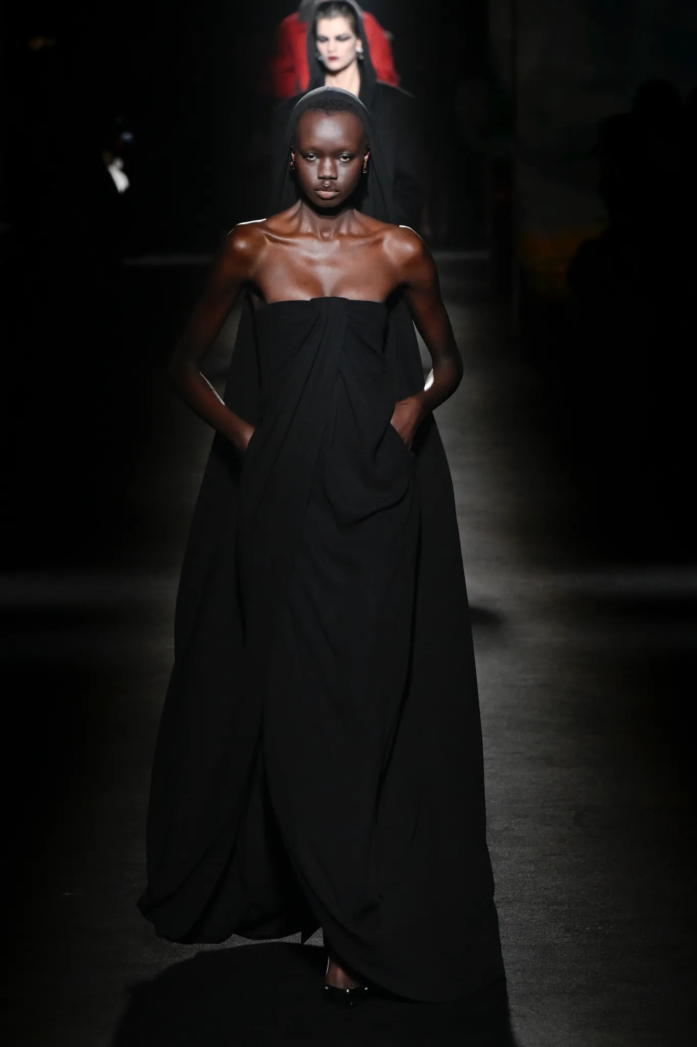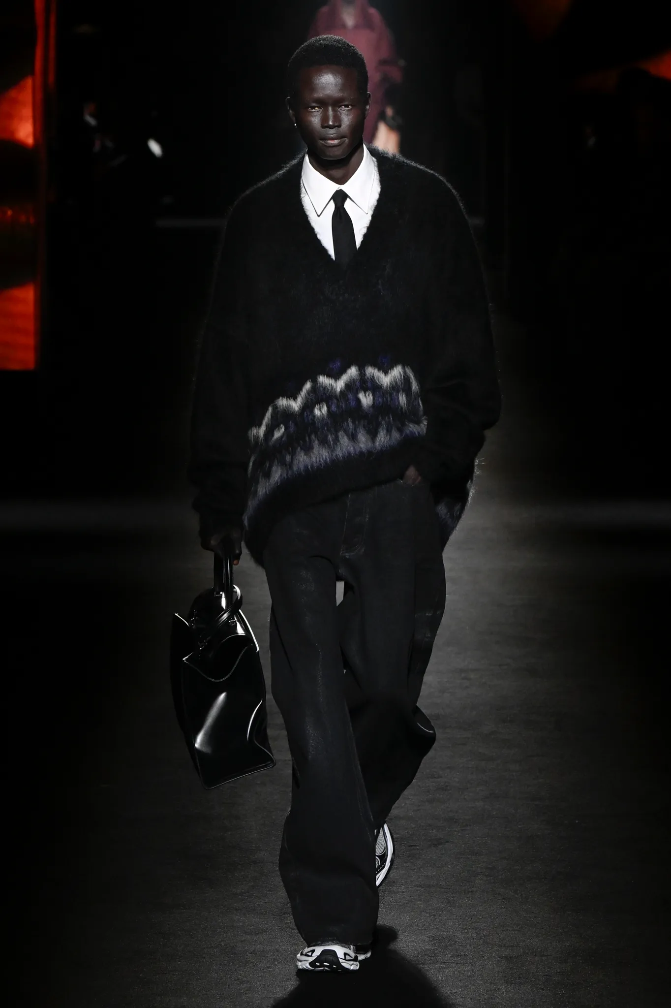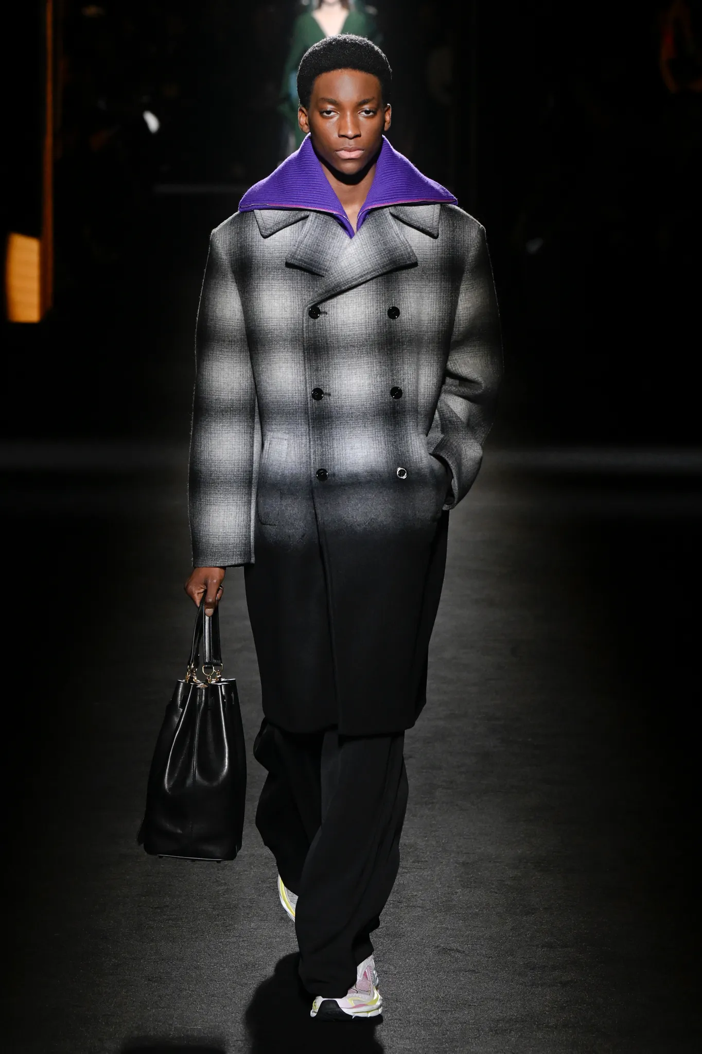 然而,Piccioli 并未完全偏向年轻化。模特选择更具多样性,无论年龄还是体型都包容在内;他利用明暗对比展现意大利风情,丝绒与针织面料的垂坠礼服交错搭配修身剪裁,兼顾成熟女性审美。男装同样加入帕克大衣、茧形大衣等款式,更适合成熟男士。