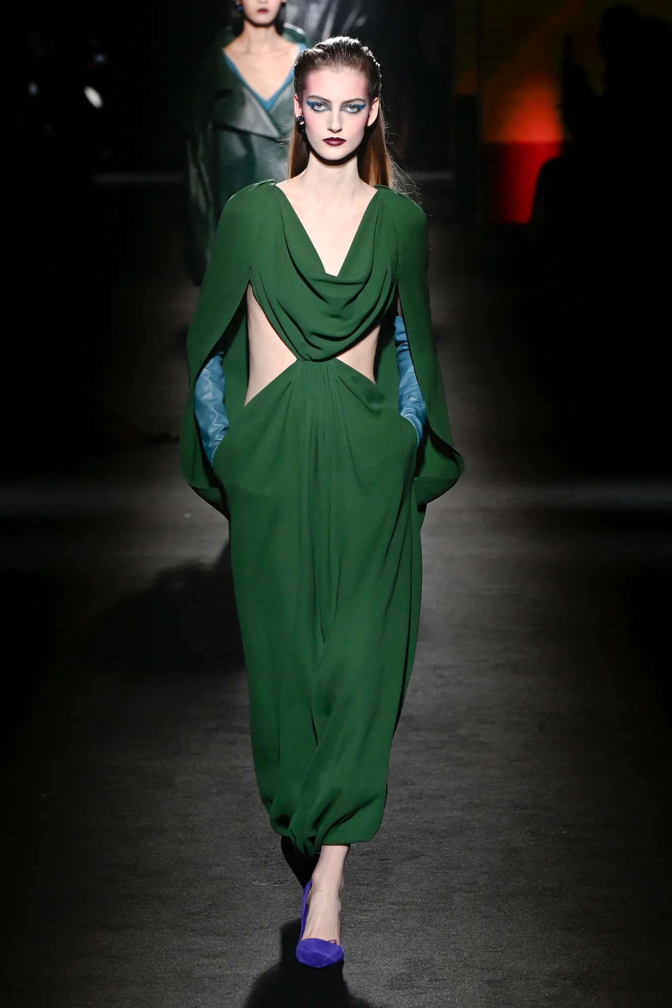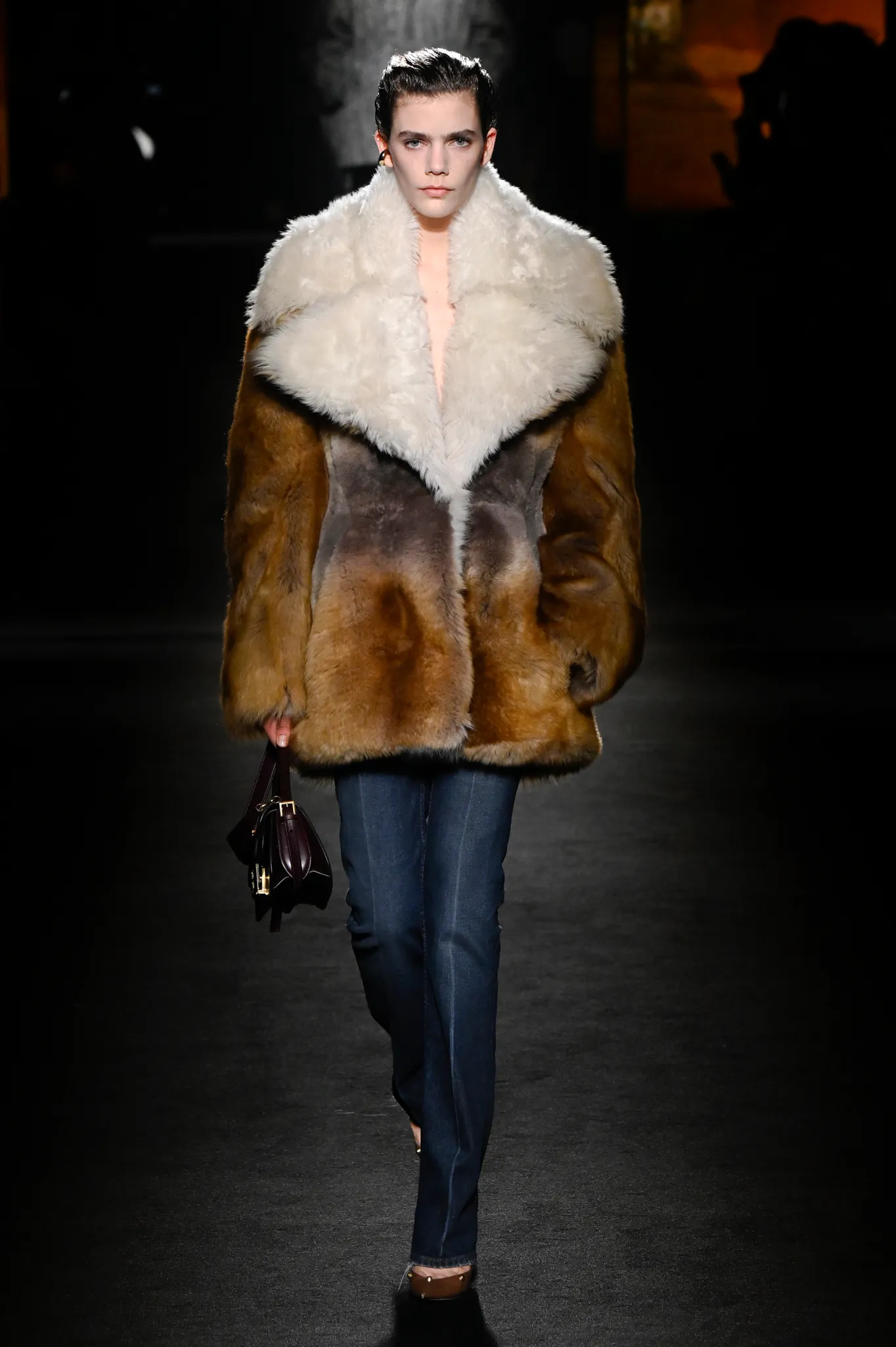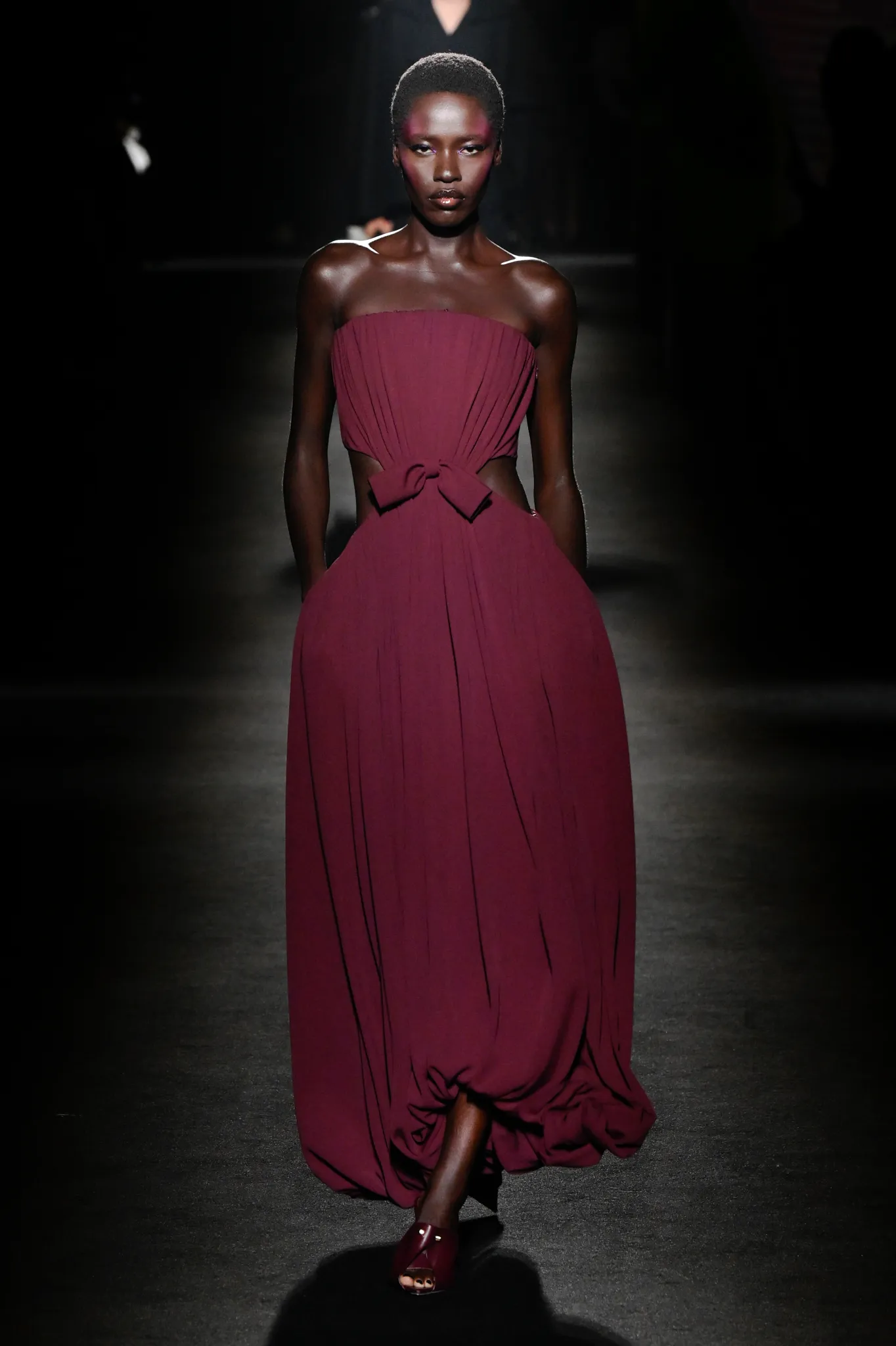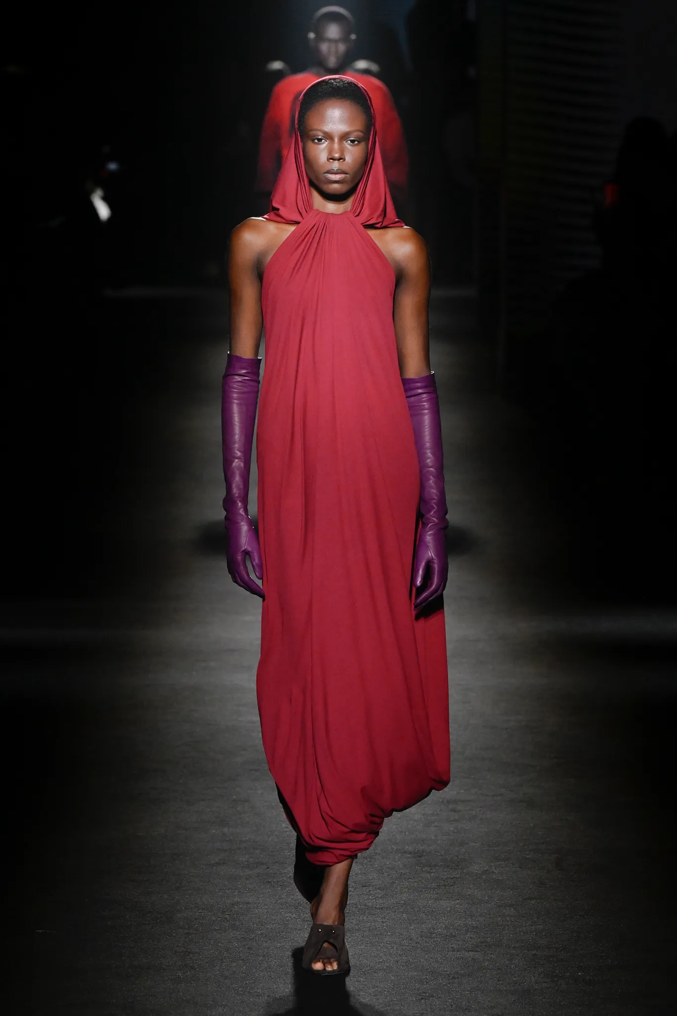 然而,Piccioli 并未完全偏向年轻化。模特选择更具多样性,无论年龄还是体型都包容在内;他利用明暗对比展现意大利风情,丝绒与针织面料的垂坠礼服交错搭配修身剪裁,兼顾成熟女性审美。男装同样加入帕克大衣、茧形大衣等款式,更适合成熟男士。