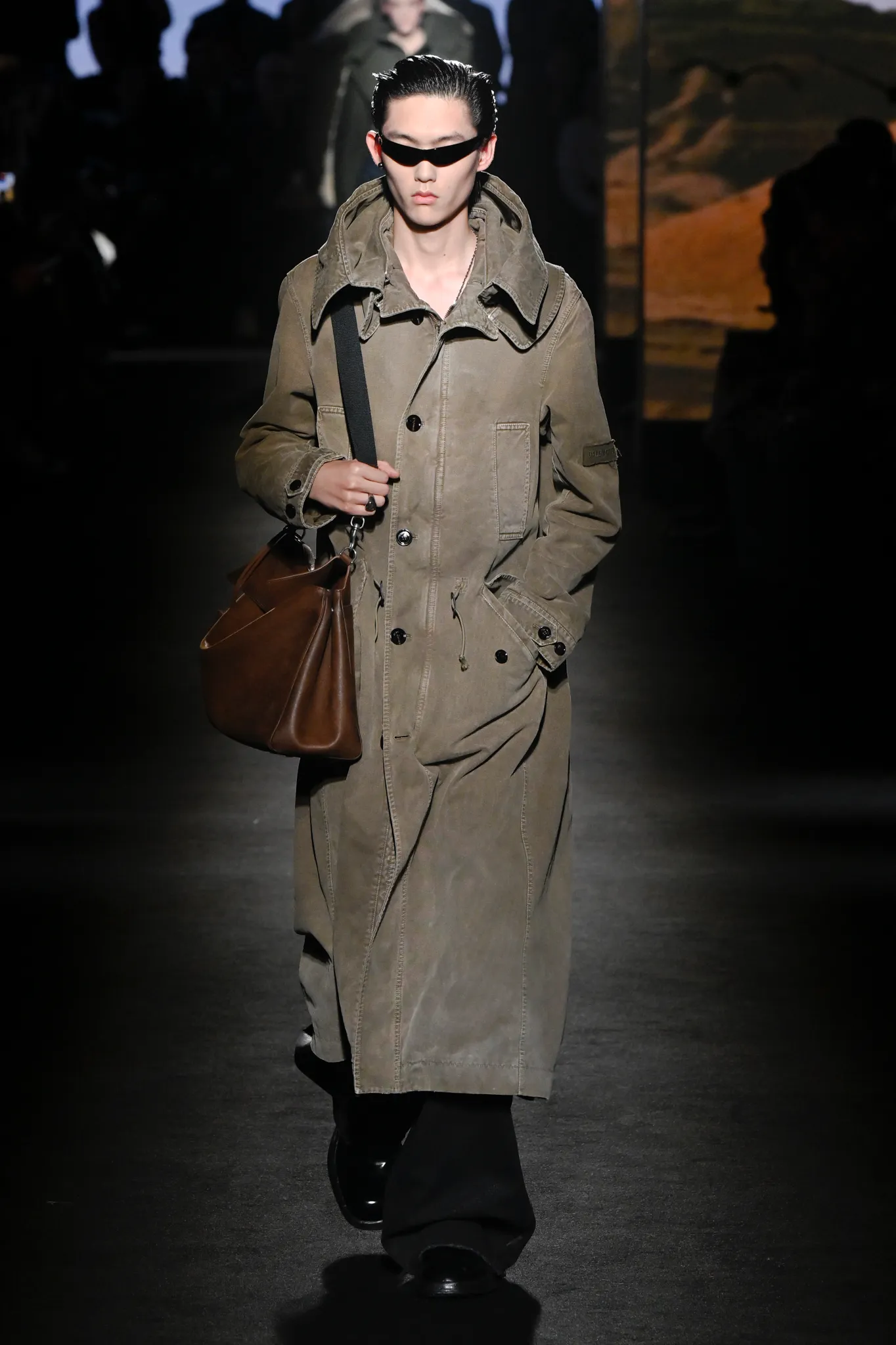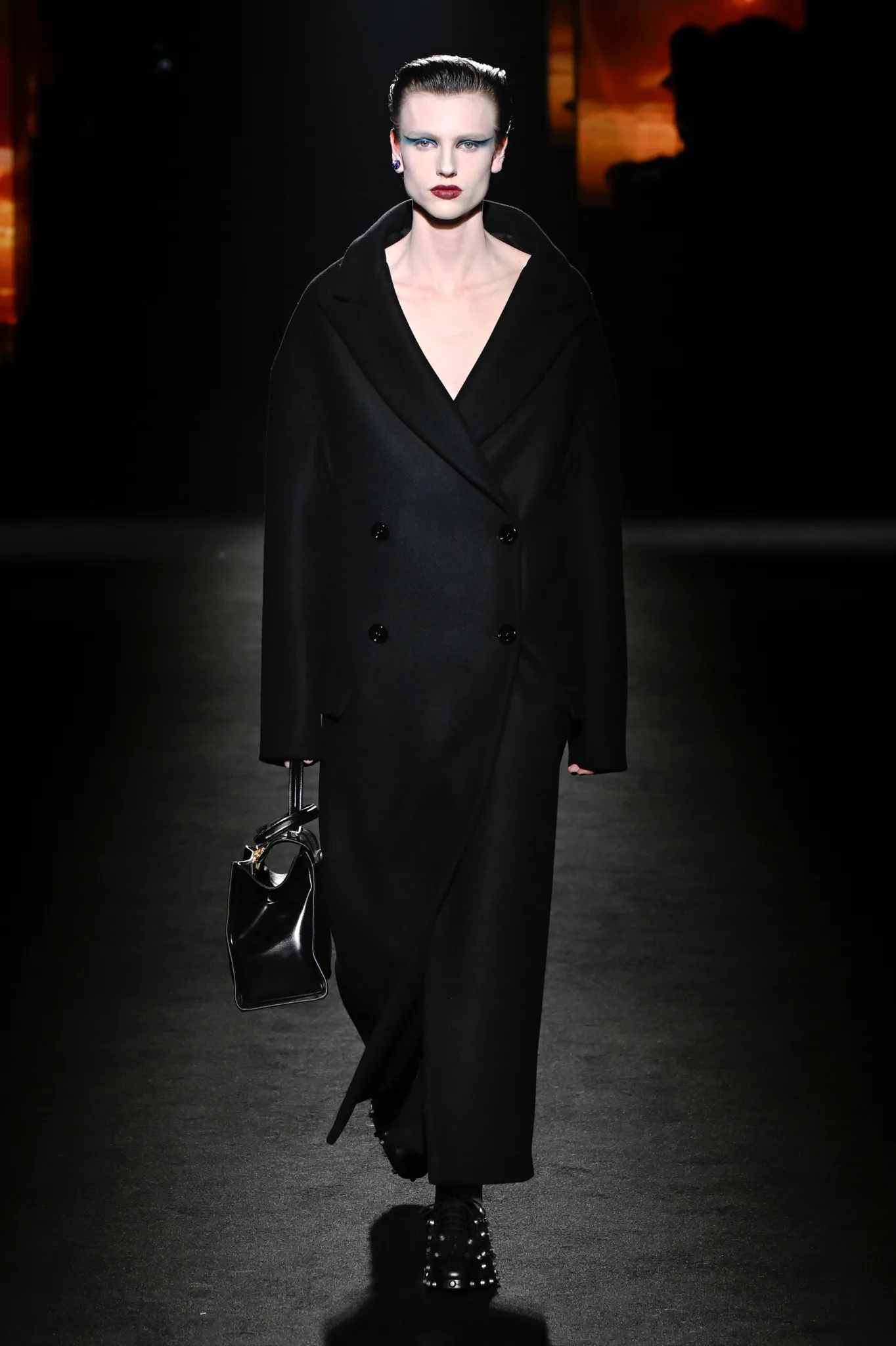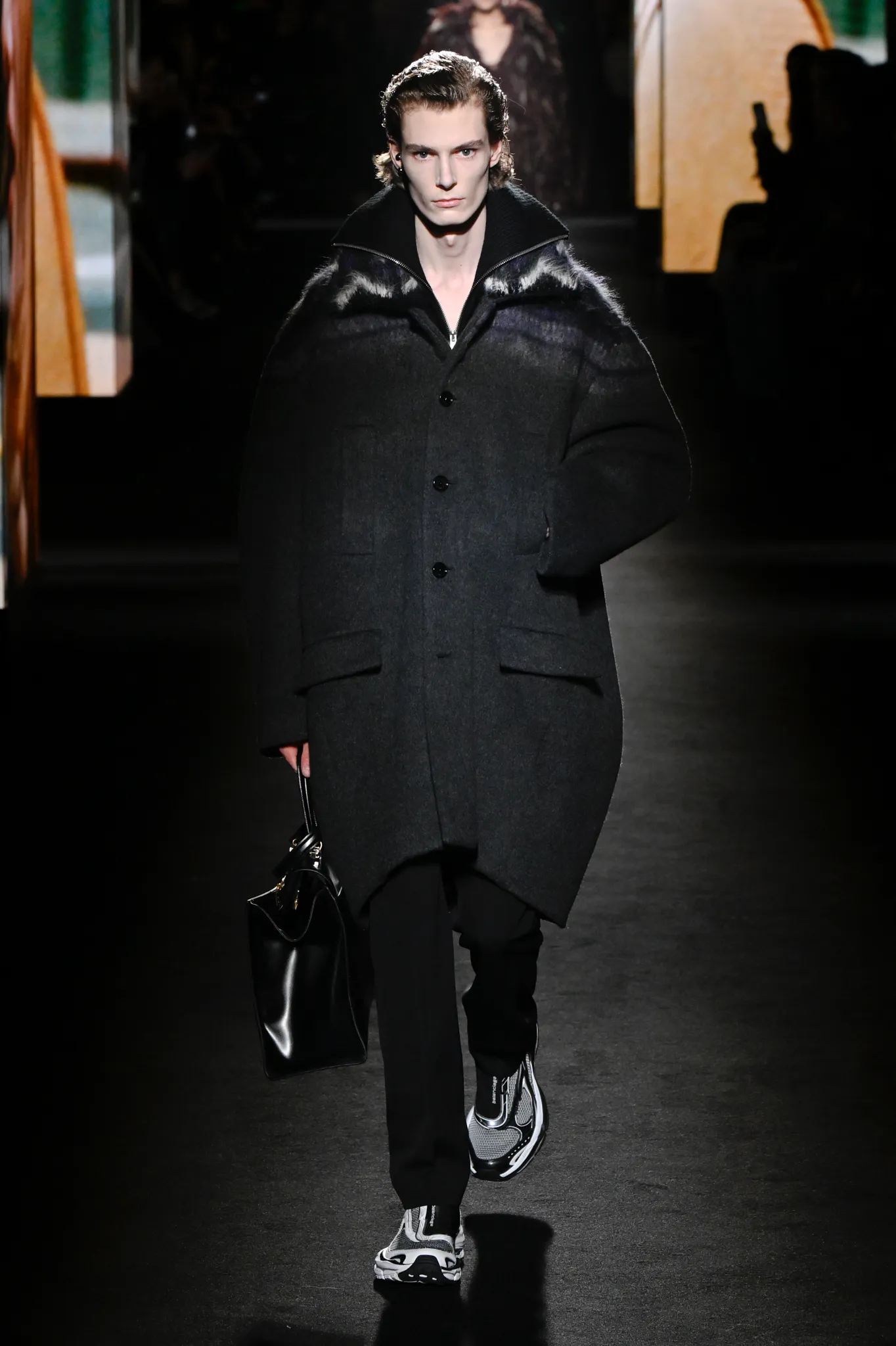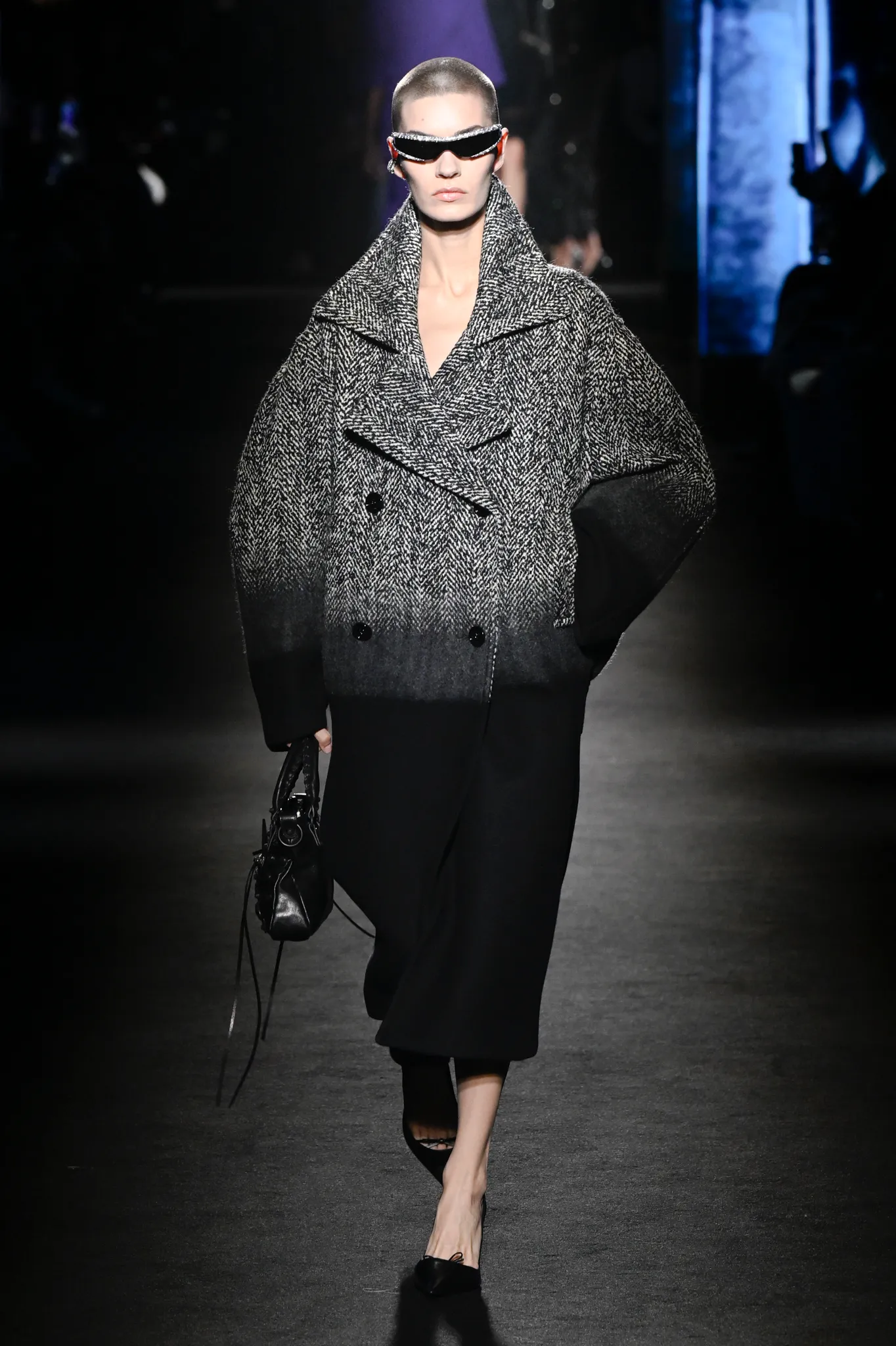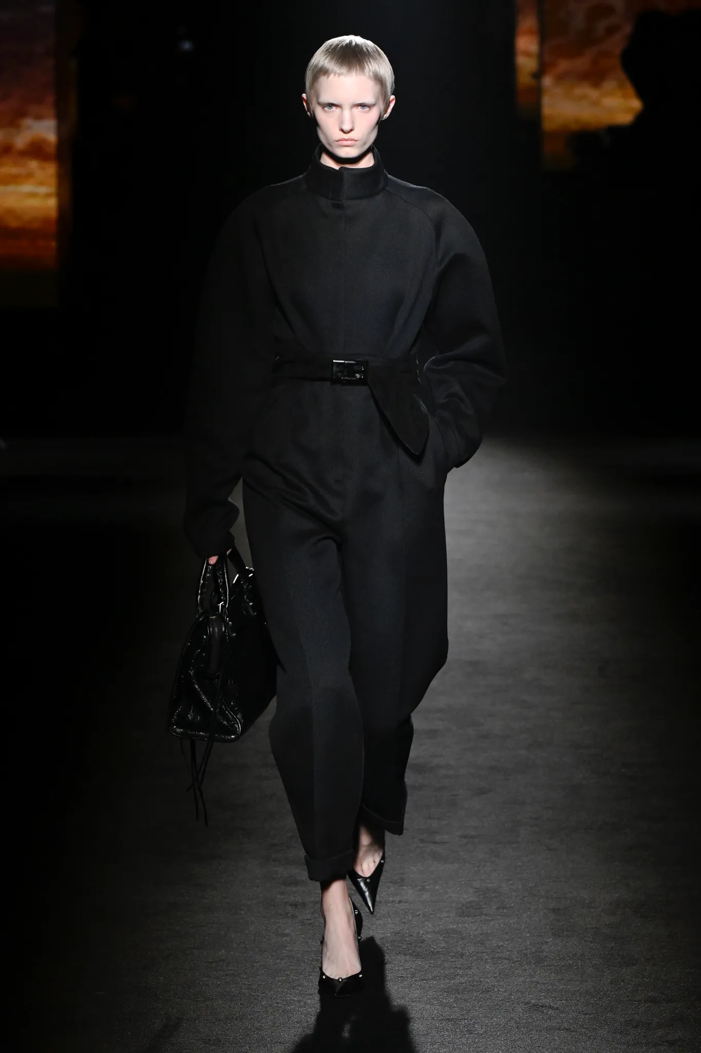本季,Pierpaolo Piccioli 选择强化 Demna 此前那种颓废、青年亚文化的氛围,而非延续上季高定的精致感,邀请《Euphoria》创作者 Sam Levinson 共同为秀场布景。空间被黑色地毯与舞台灯光包裹,数十块视频屏幕循环播放加州风景、狼群、空旷酒吧以及新一季演员的表情片段,包括 Danielle Deadwyler 紧张眨眼的画面,营造出强烈的沉浸感。模特沿着微弱光线走出,服装以精致的外套为核心,多数呈现夸张的背部廓形或茧形轮廓,呼应创始人 Cristóbal Balenciaga 的标志性剪影。