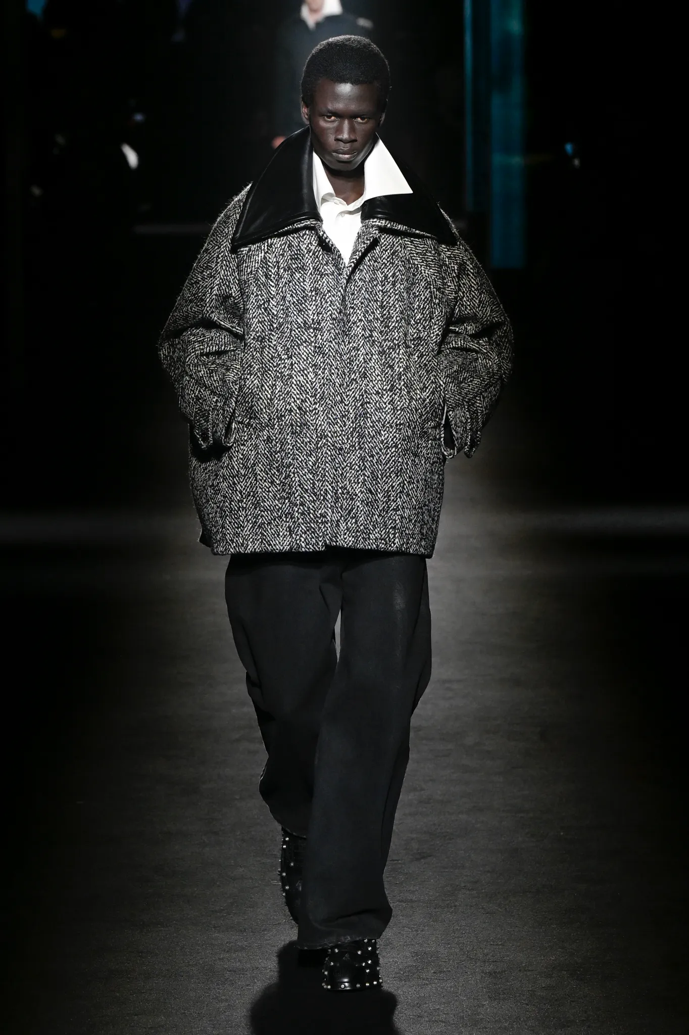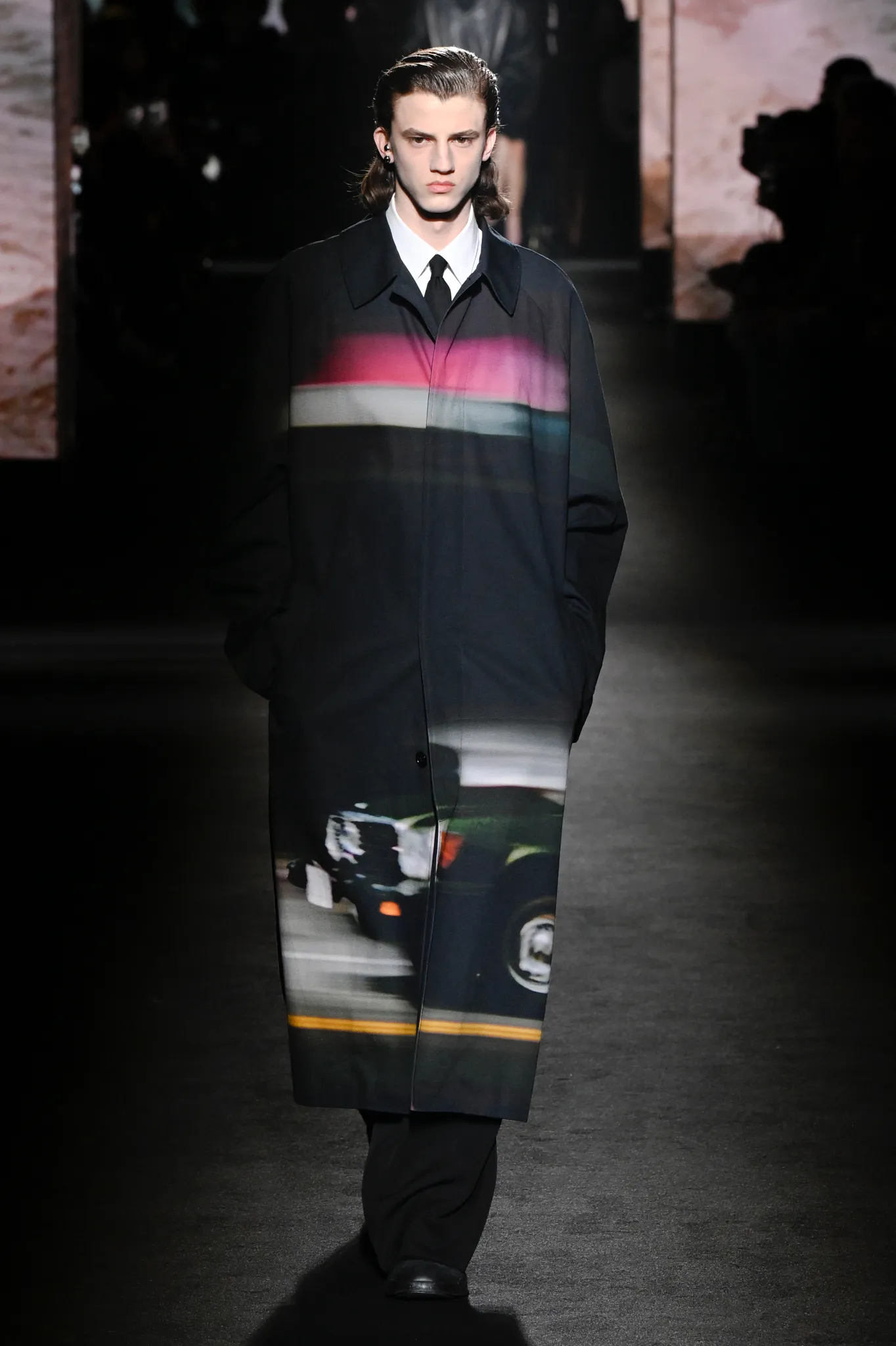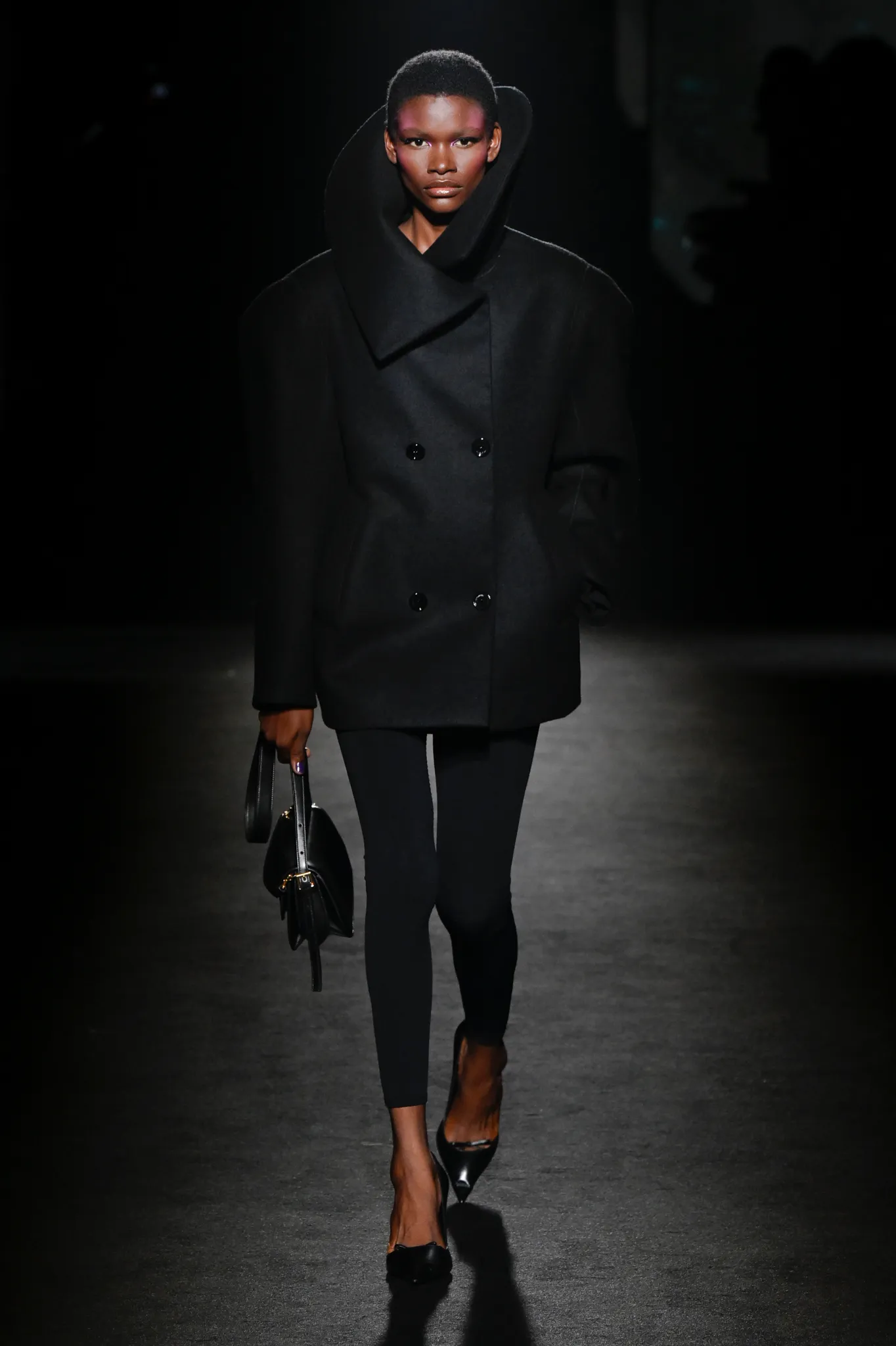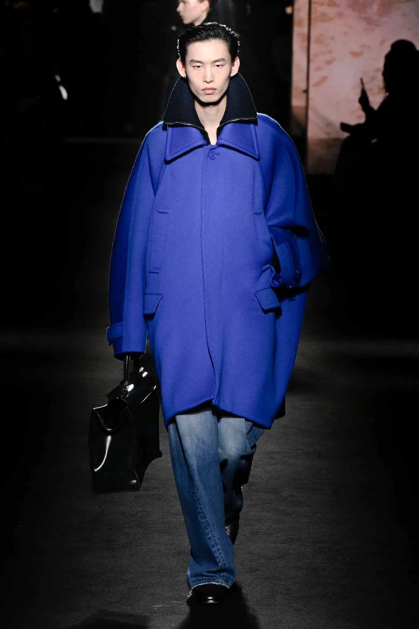 本季,Pierpaolo Piccioli 选择强化 Demna 此前那种颓废、青年亚文化的氛围,而非延续上季高定的精致感,邀请《Euphoria》创作者 Sam Levinson 共同为秀场布景。空间被黑色地毯与舞台灯光包裹,数十块视频屏幕循环播放加州风景、狼群、空旷酒吧以及新一季演员的表情片段,包括 Danielle Deadwyler 紧张眨眼的画面,营造出强烈的沉浸感。模特沿着微弱光线走出,服装以精致的外套为核心,多数呈现夸张的背部廓形或茧形轮廓,呼应创始人 Cristóbal Balenciaga 的标志性剪影。