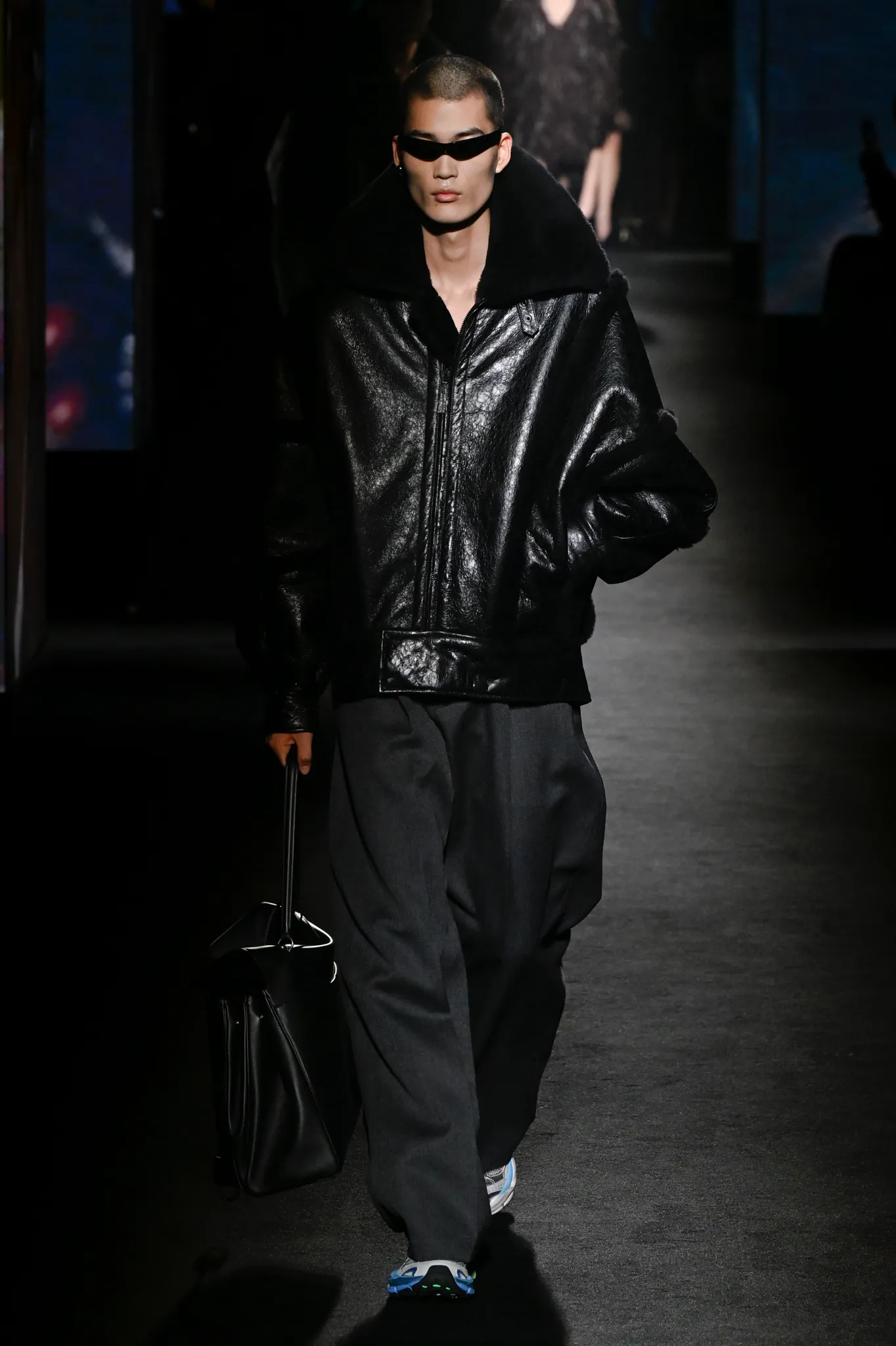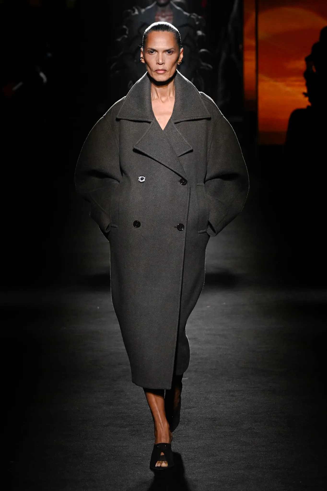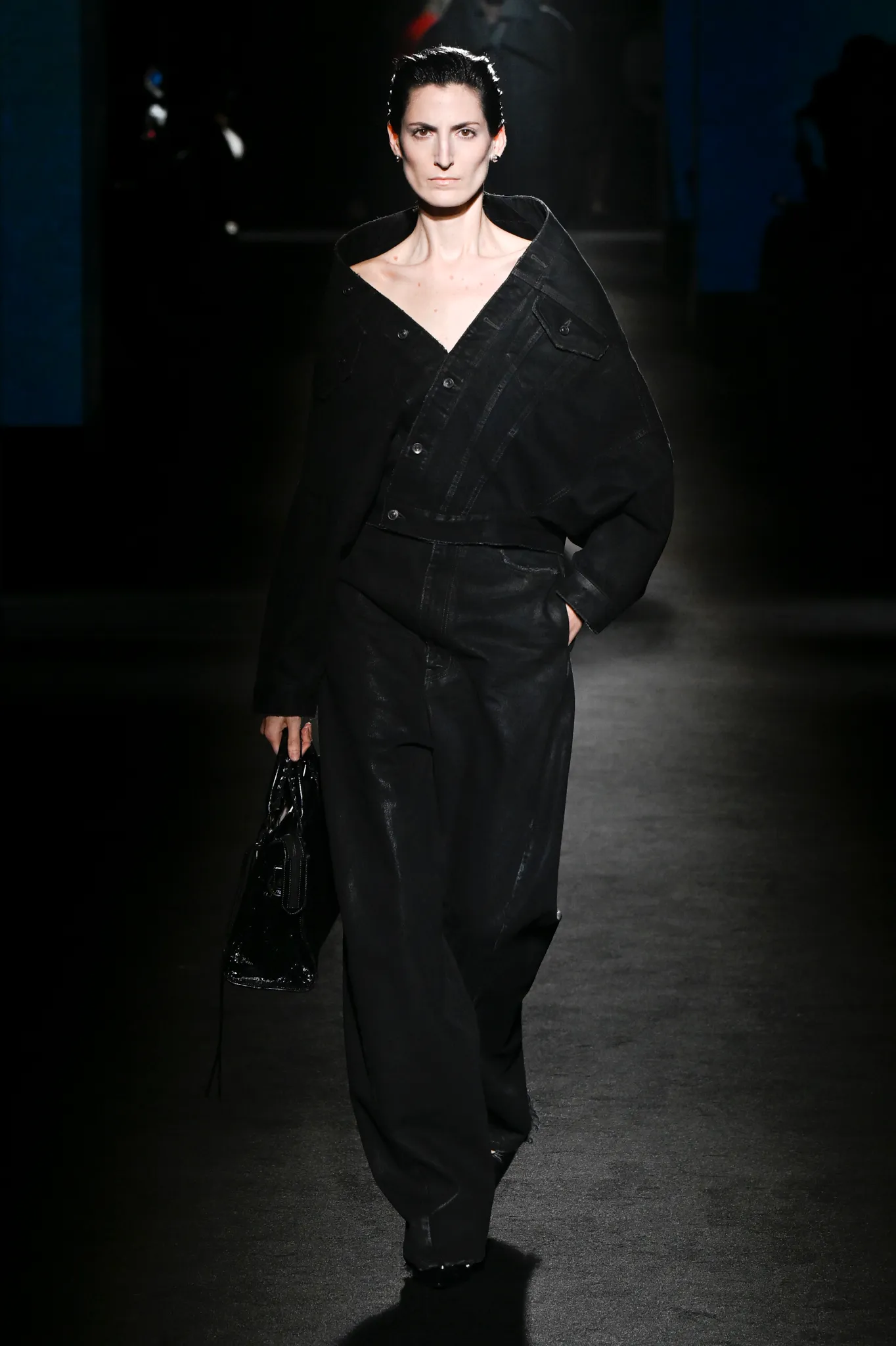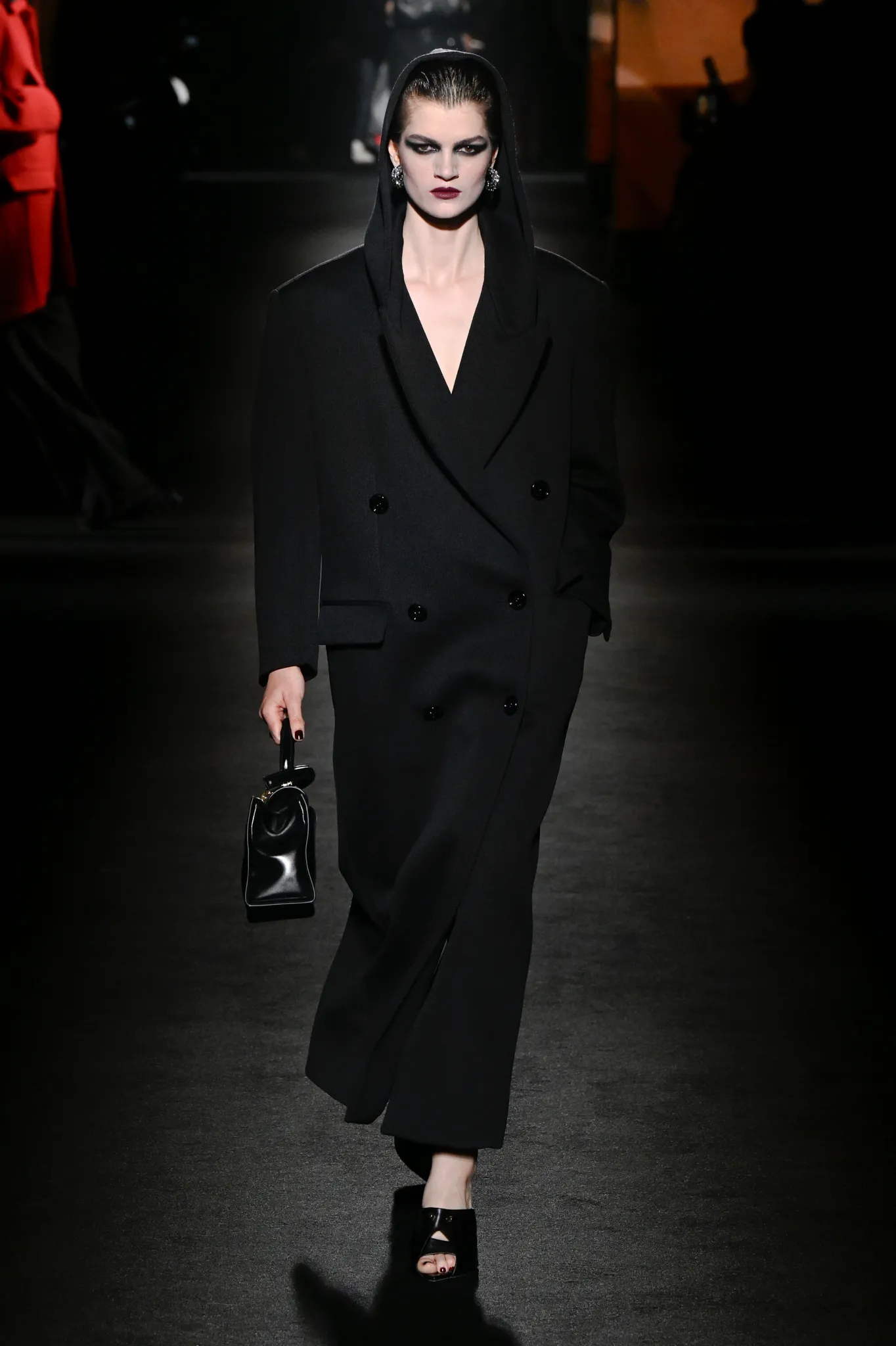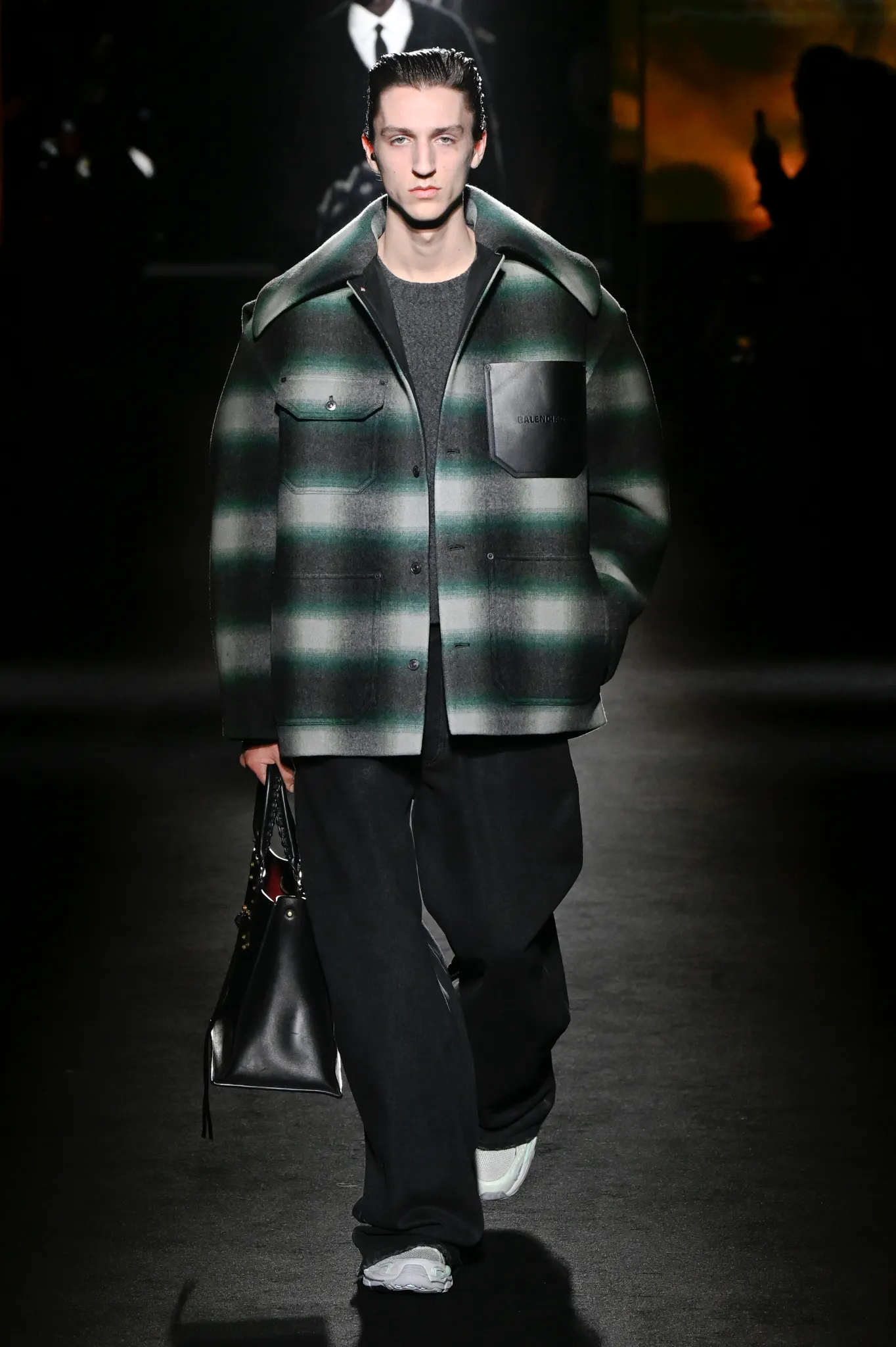 本季,Pierpaolo Piccioli 选择强化 Demna 此前那种颓废、青年亚文化的氛围,而非延续上季高定的精致感,邀请《Euphoria》创作者 Sam Levinson 共同为秀场布景。空间被黑色地毯与舞台灯光包裹,数十块视频屏幕循环播放加州风景、狼群、空旷酒吧以及新一季演员的表情片段,包括 Danielle Deadwyler 紧张眨眼的画面,营造出强烈的沉浸感。模特沿着微弱光线走出,服装以精致的外套为核心,多数呈现夸张的背部廓形或茧形轮廓,呼应创始人 Cristóbal Balenciaga 的标志性剪影。
