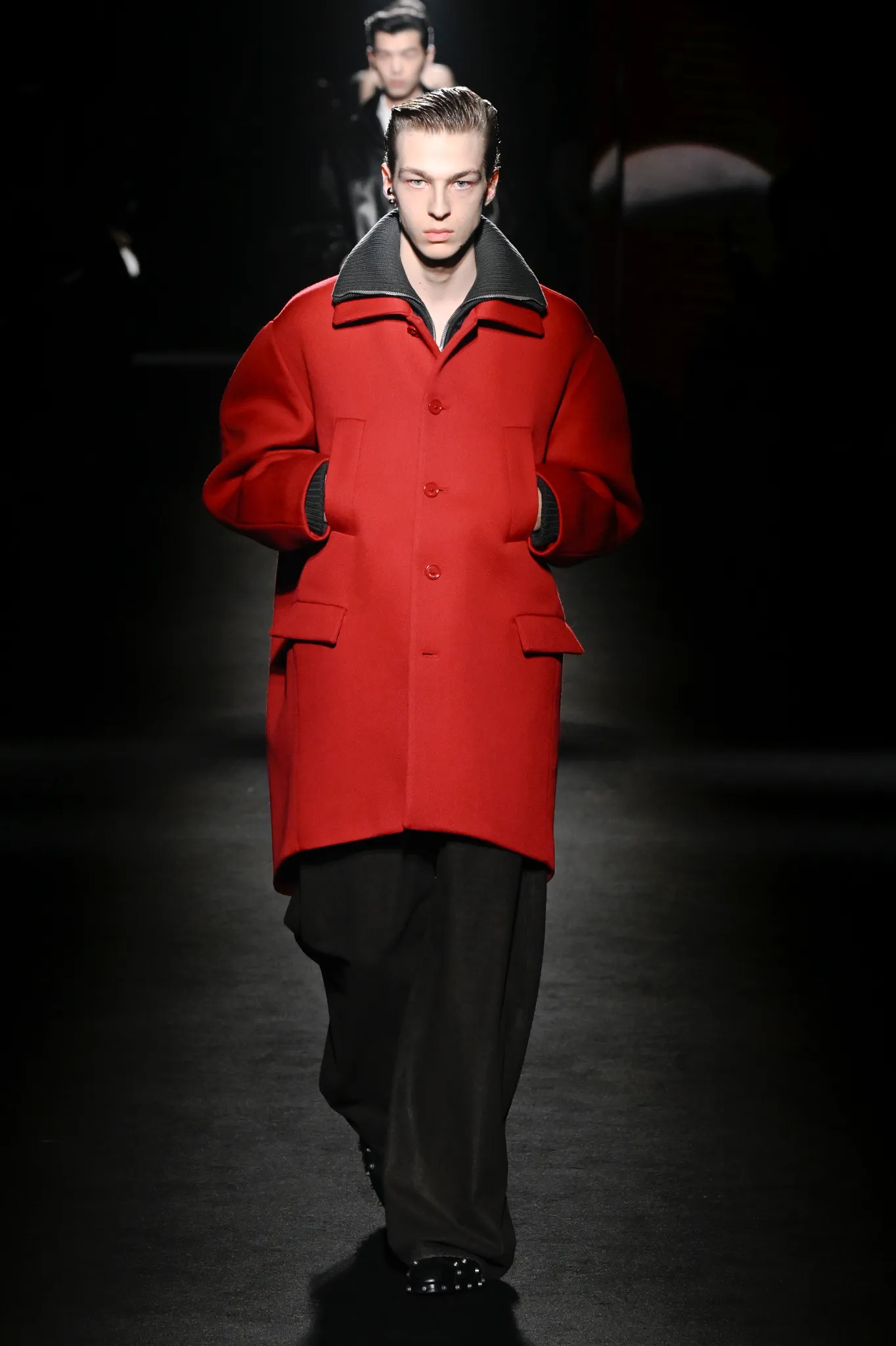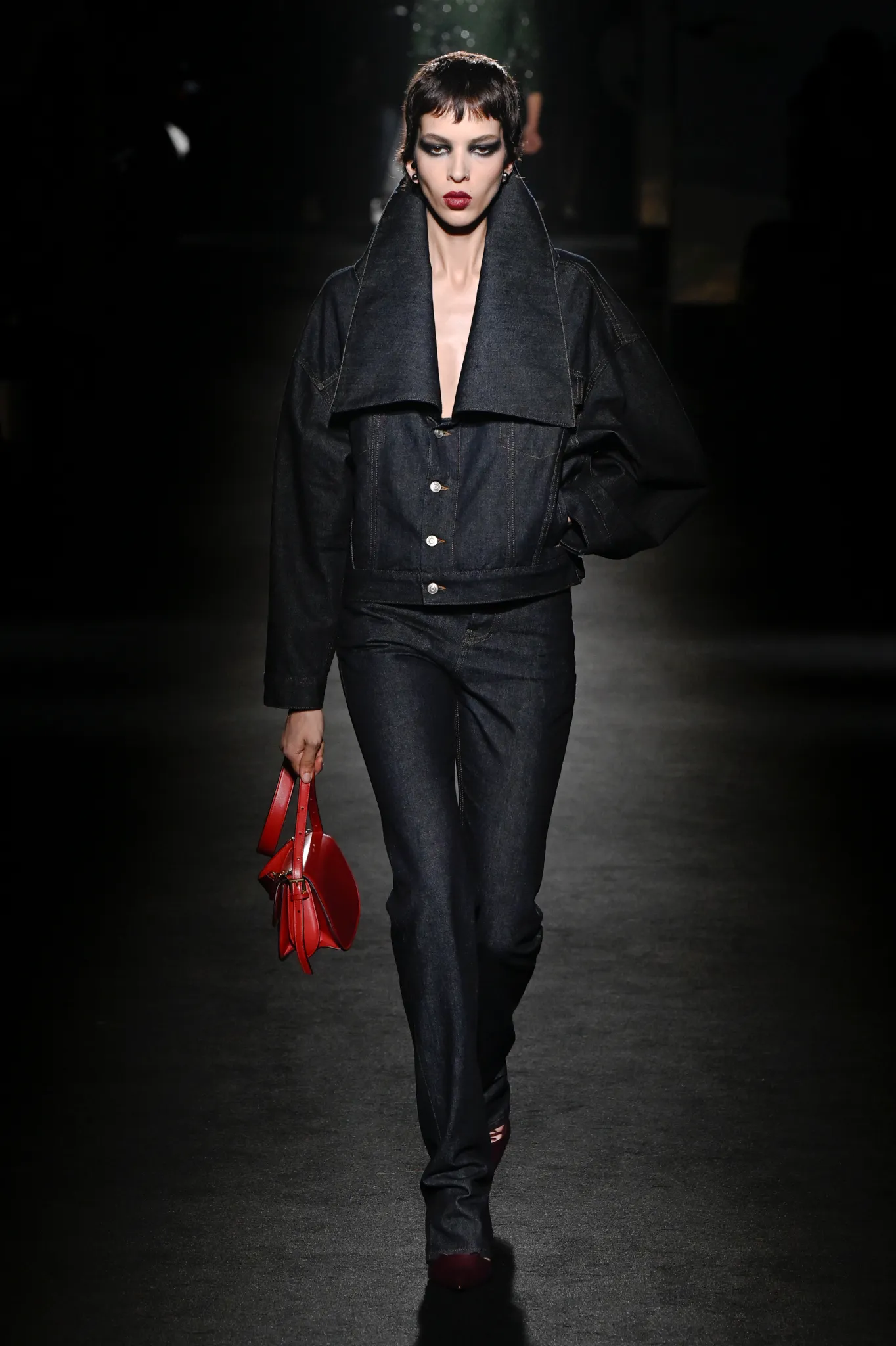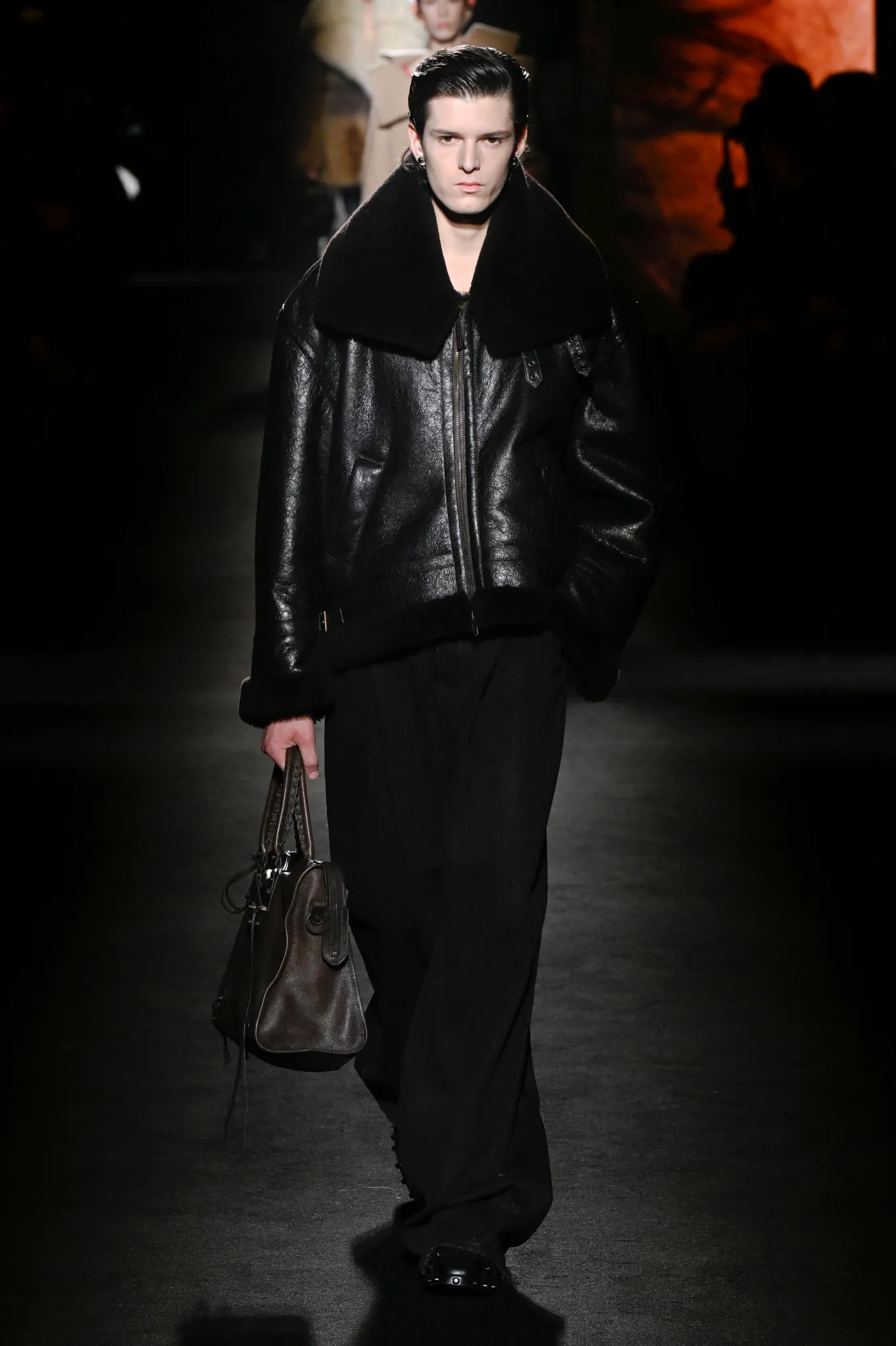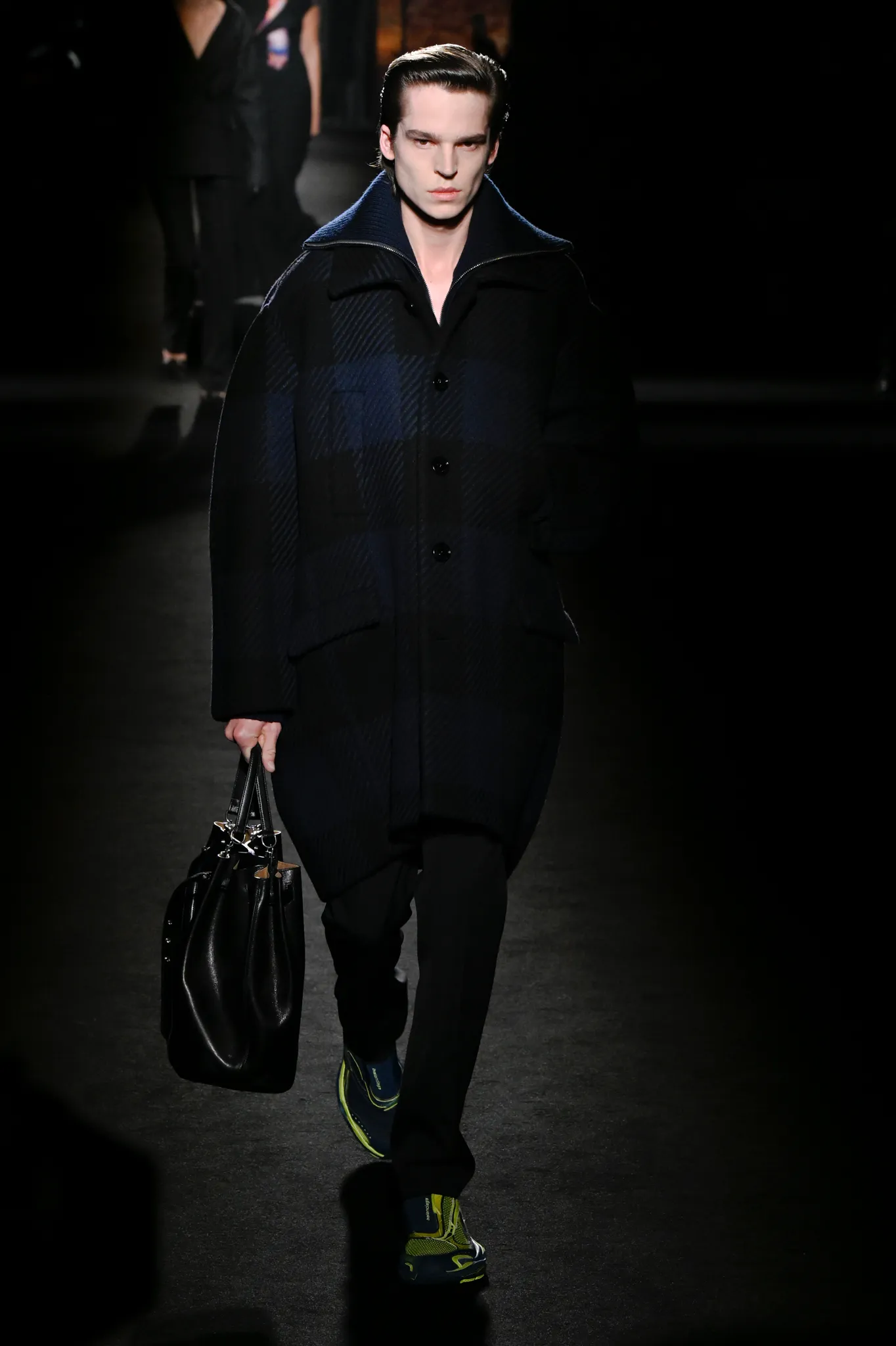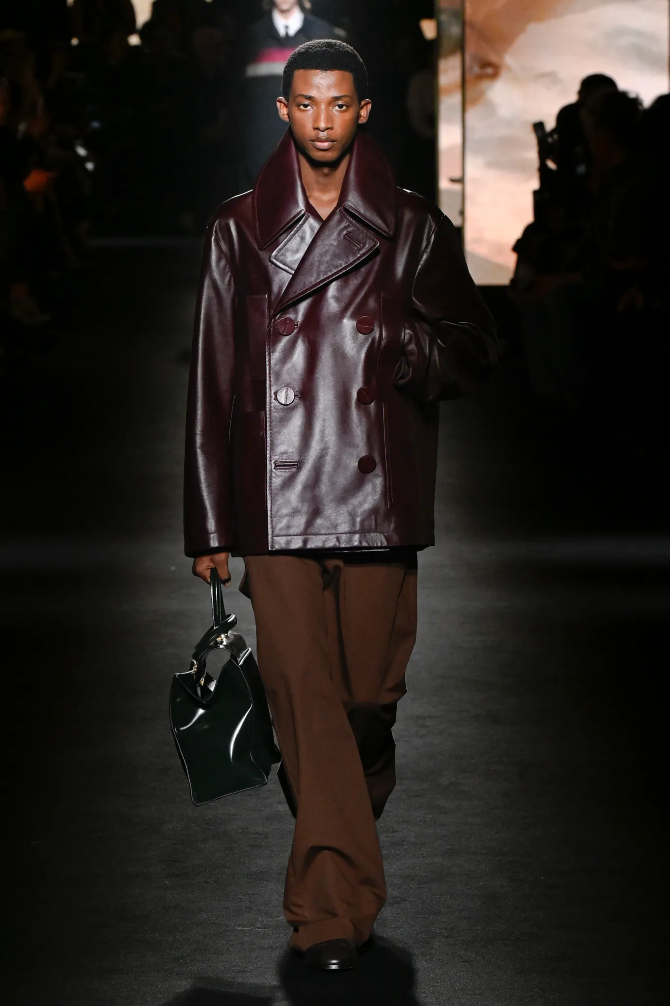 本季,Pierpaolo Piccioli 选择强化 Demna 此前那种颓废、青年亚文化的氛围,而非延续上季高定的精致感,邀请《Euphoria》创作者 Sam Levinson 共同为秀场布景。空间被黑色地毯与舞台灯光包裹,数十块视频屏幕循环播放加州风景、狼群、空旷酒吧以及新一季演员的表情片段,包括 Danielle Deadwyler 紧张眨眼的画面,营造出强烈的沉浸感。模特沿着微弱光线走出,服装以精致的外套为核心,多数呈现夸张的背部廓形或茧形轮廓,呼应创始人 Cristóbal Balenciaga 的标志性剪影。