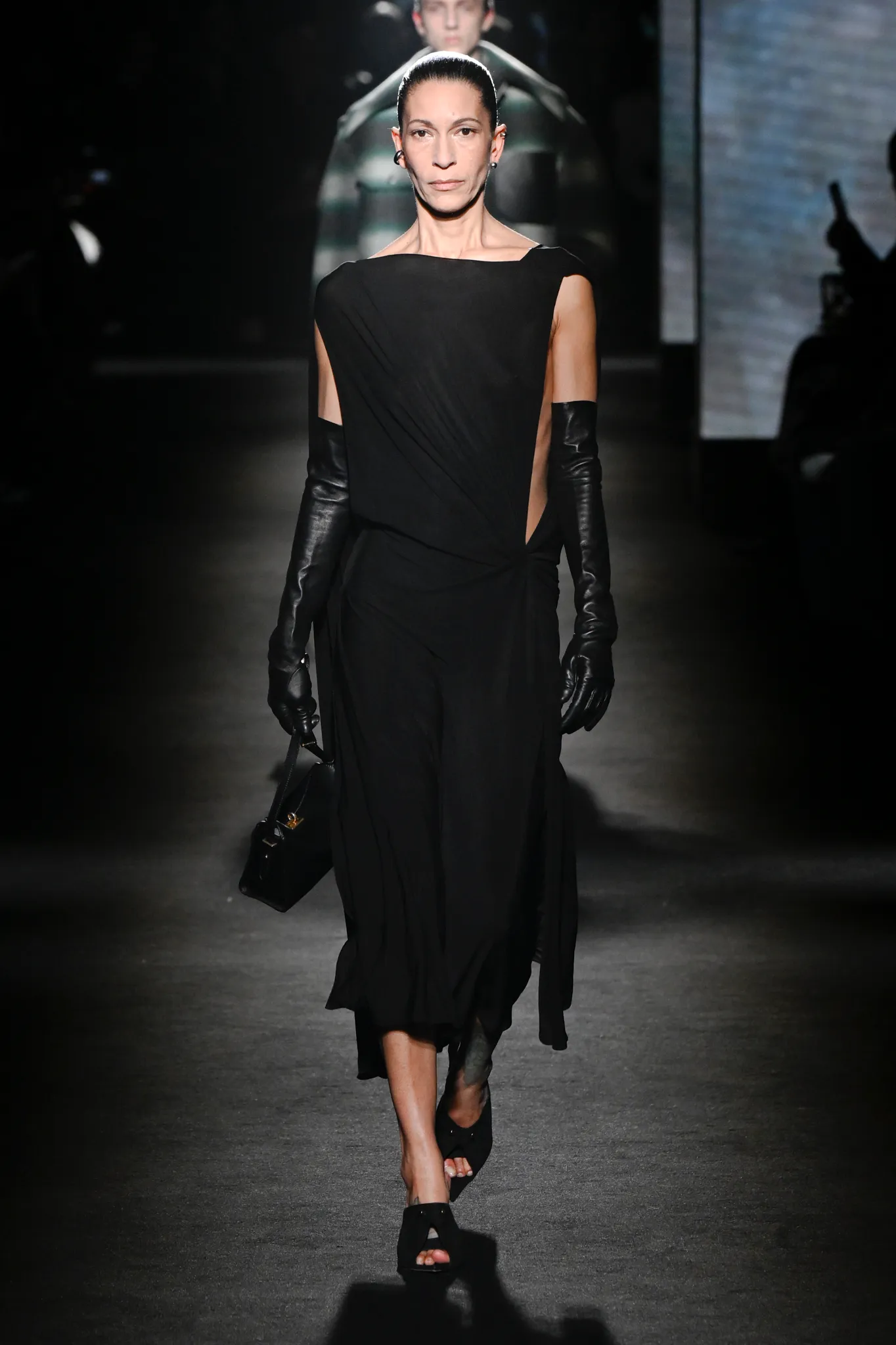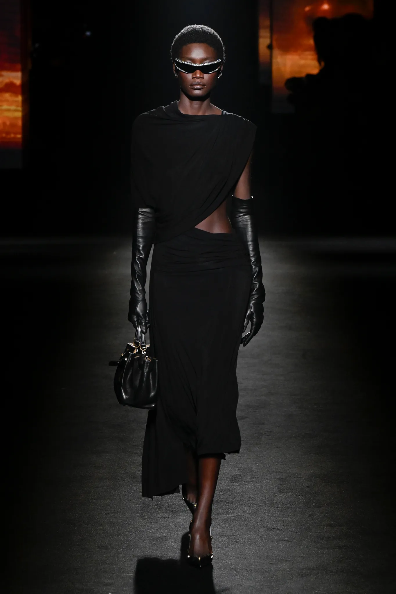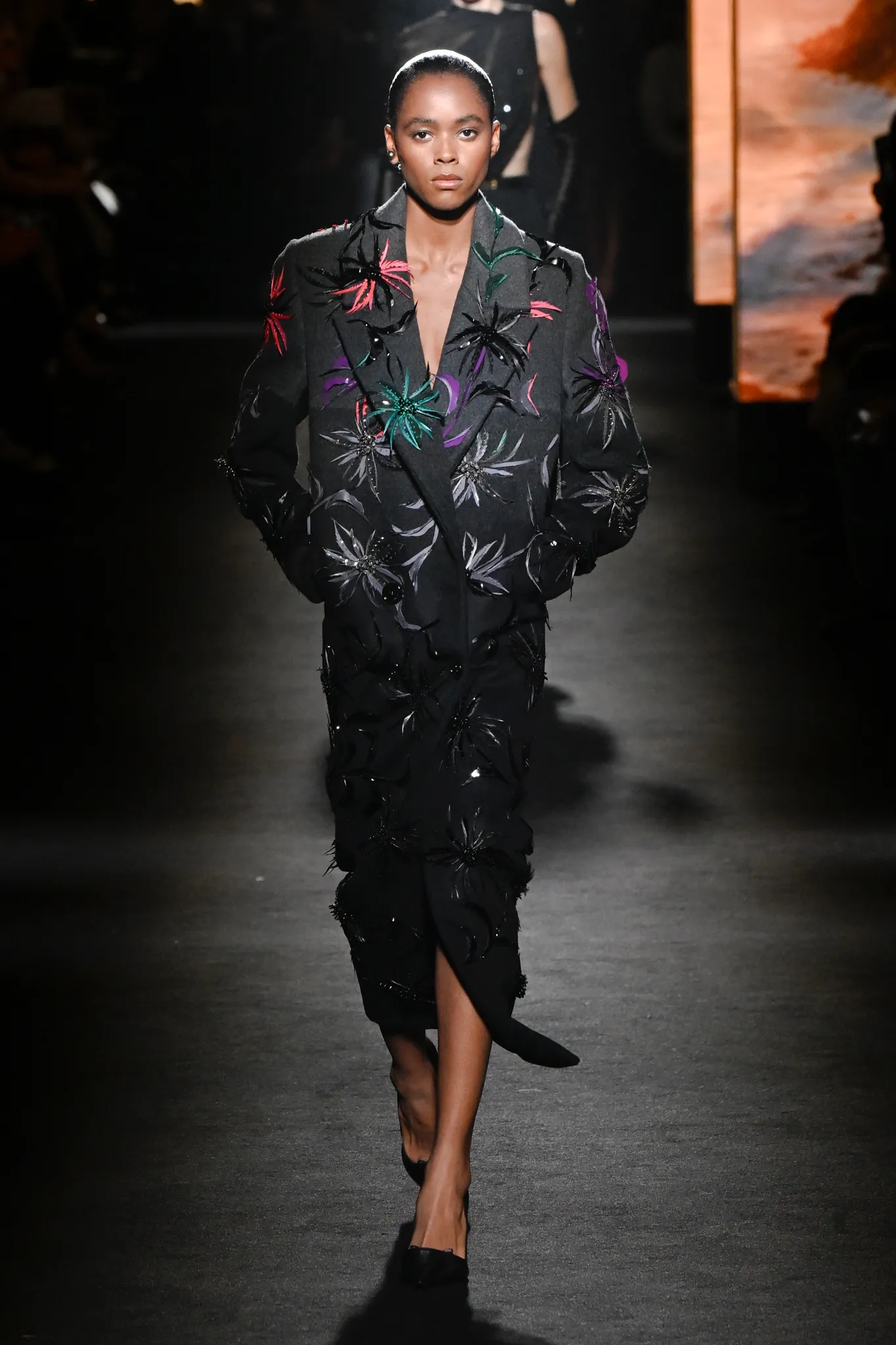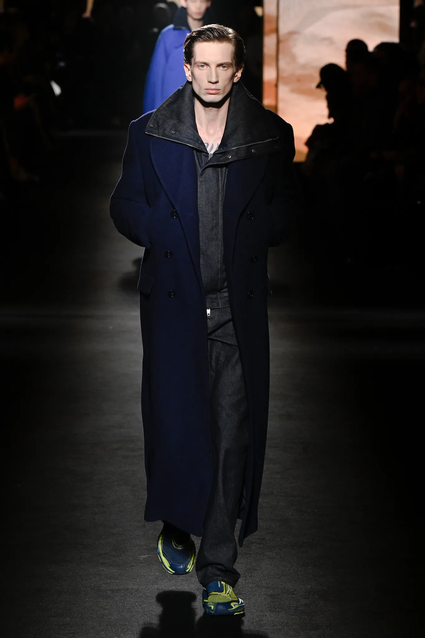 本季,Pierpaolo Piccioli 选择强化 Demna 此前那种颓废、青年亚文化的氛围,而非延续上季高定的精致感,邀请《Euphoria》创作者 Sam Levinson 共同为秀场布景。空间被黑色地毯与舞台灯光包裹,数十块视频屏幕循环播放加州风景、狼群、空旷酒吧以及新一季演员的表情片段,包括 Danielle Deadwyler 紧张眨眼的画面,营造出强烈的沉浸感。模特沿着微弱光线走出,服装以精致的外套为核心,多数呈现夸张的背部廓形或茧形轮廓,呼应创始人 Cristóbal Balenciaga 的标志性剪影。