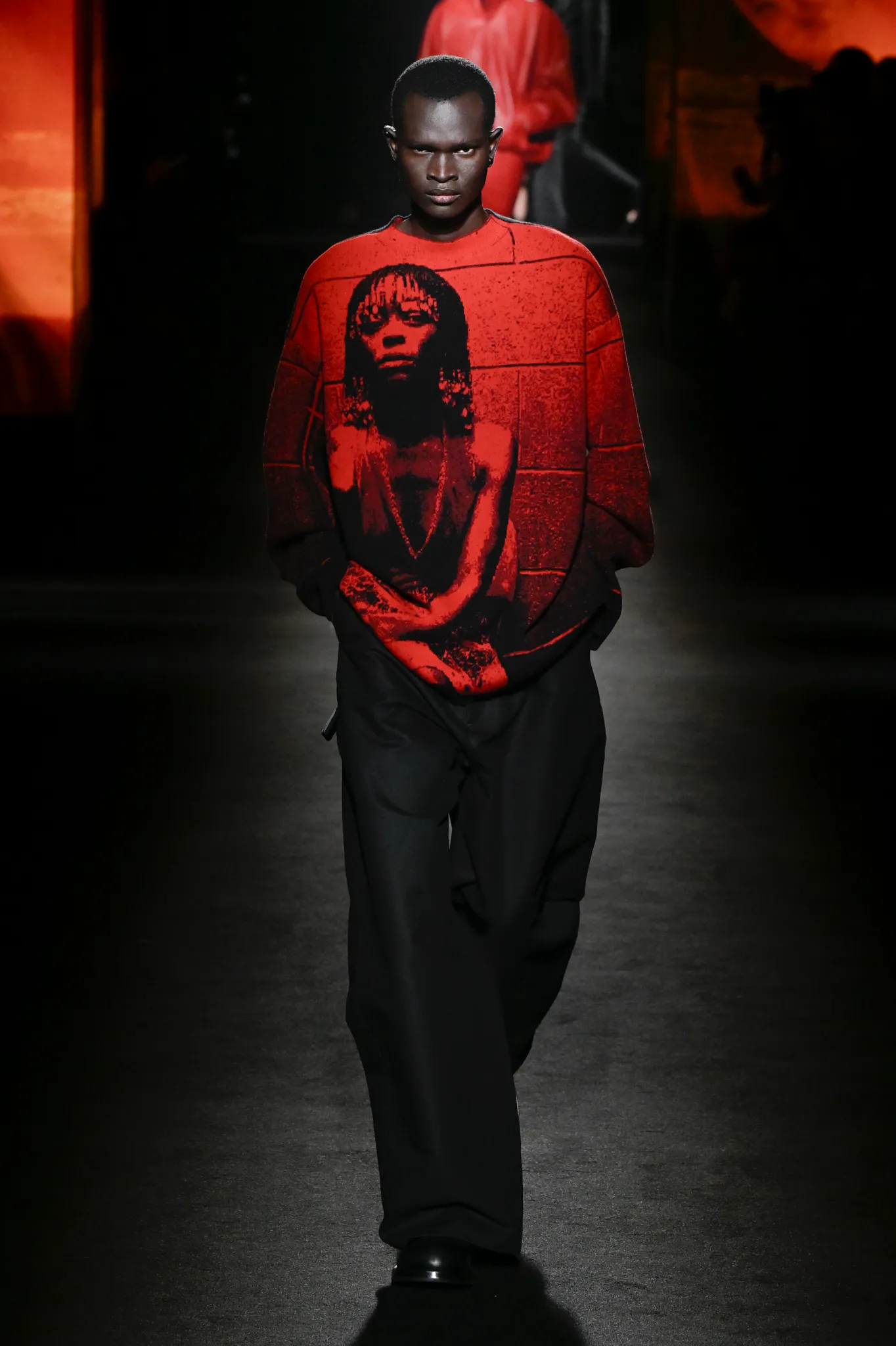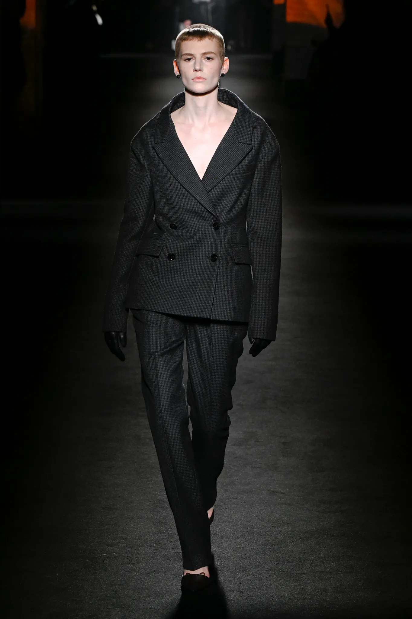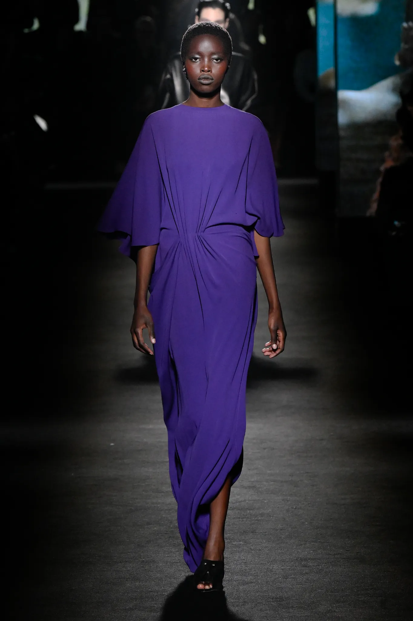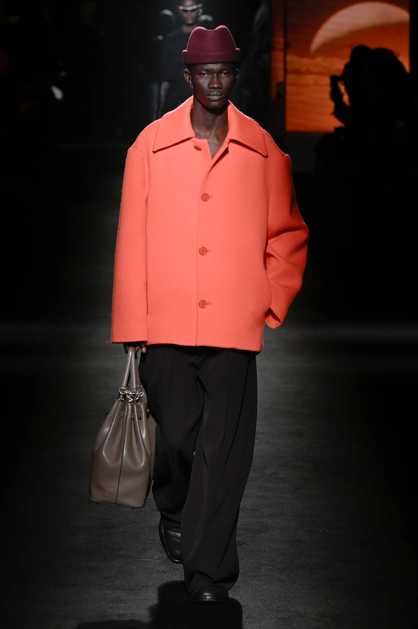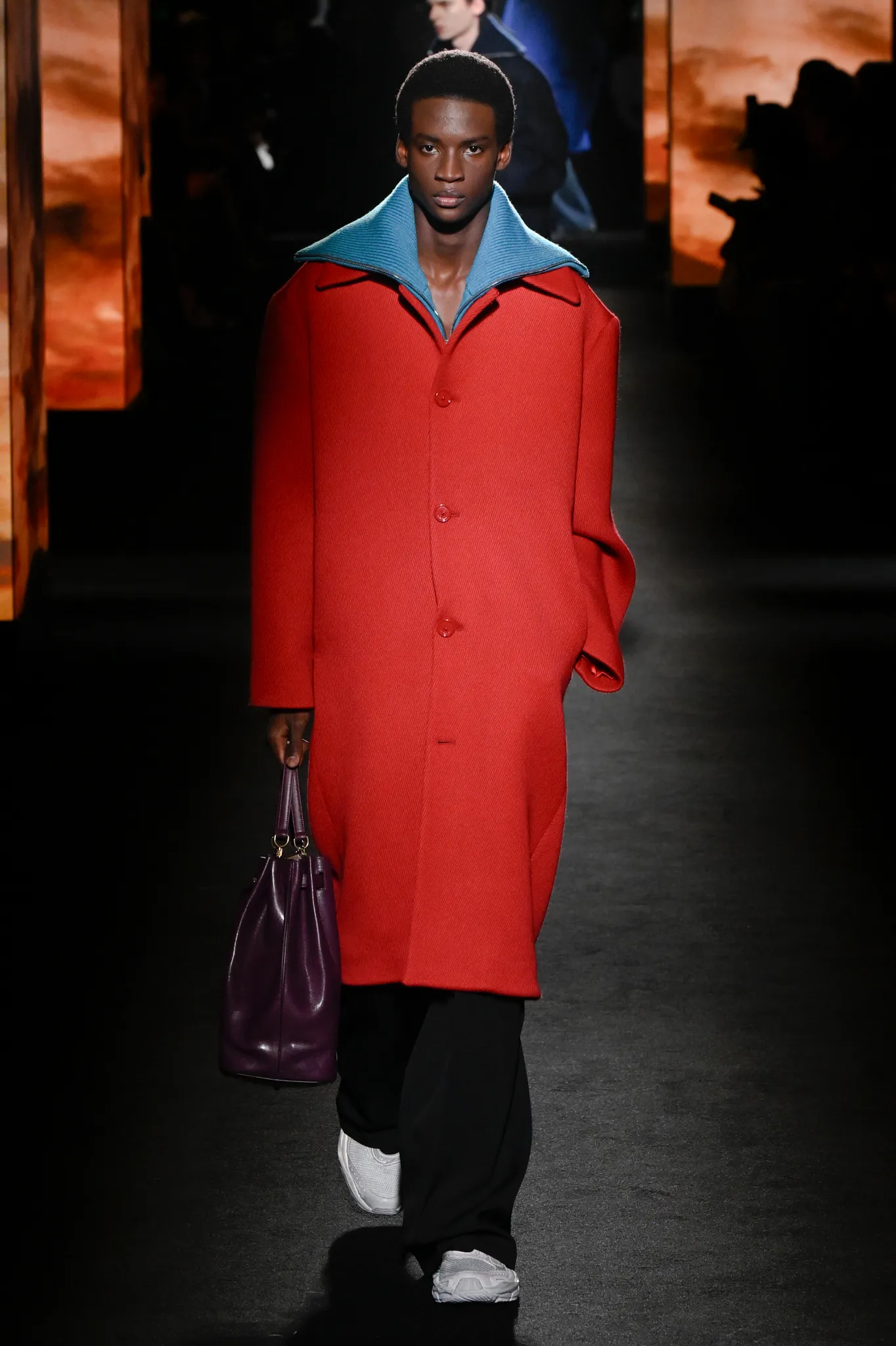 本季,Pierpaolo Piccioli 选择强化 Demna 此前那种颓废、青年亚文化的氛围,而非延续上季高定的精致感,邀请《Euphoria》创作者 Sam Levinson 共同为秀场布景。空间被黑色地毯与舞台灯光包裹,数十块视频屏幕循环播放加州风景、狼群、空旷酒吧以及新一季演员的表情片段,包括 Danielle Deadwyler 紧张眨眼的画面,营造出强烈的沉浸感。模特沿着微弱光线走出,服装以精致的外套为核心,多数呈现夸张的背部廓形或茧形轮廓,呼应创始人 Cristóbal Balenciaga 的标志性剪影。