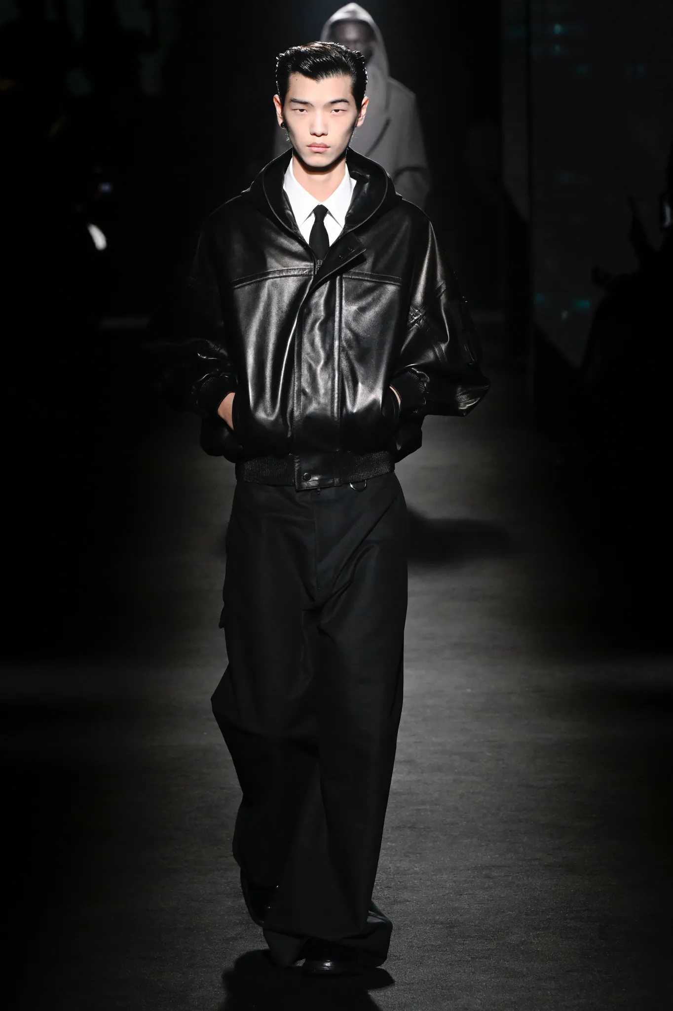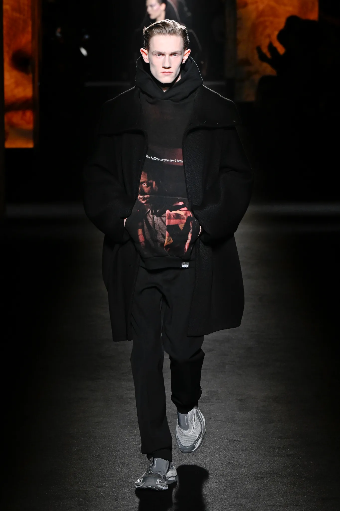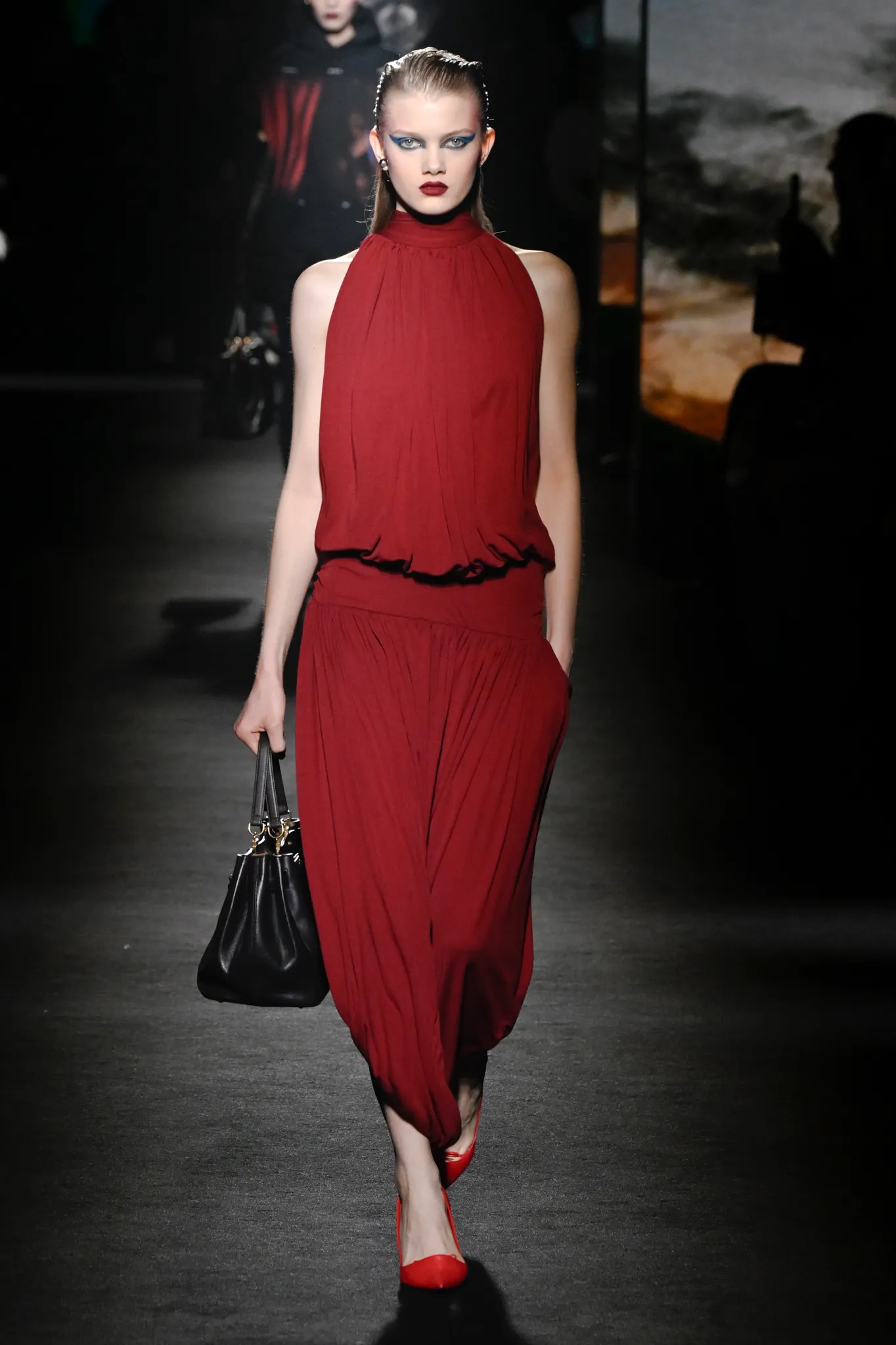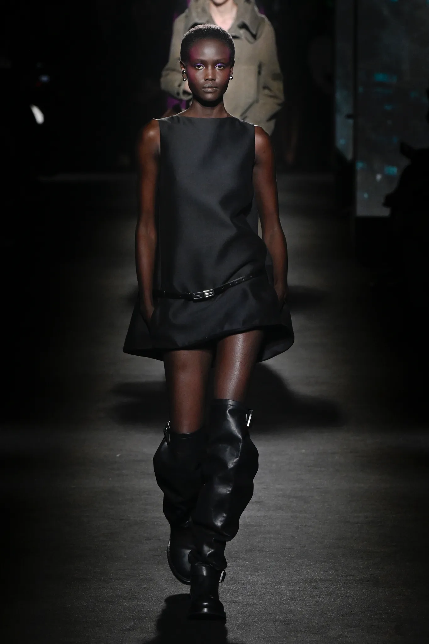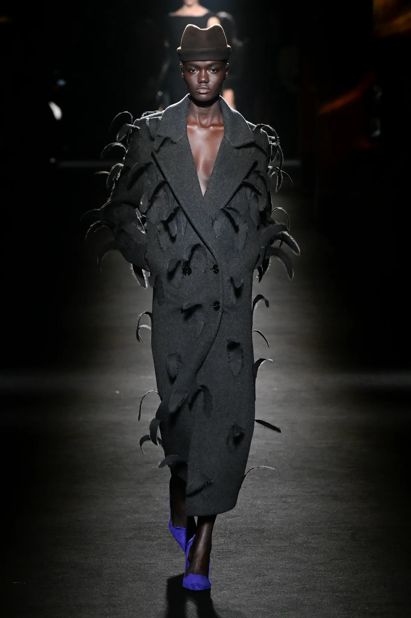 本季,Pierpaolo Piccioli 选择强化 Demna 此前那种颓废、青年亚文化的氛围,而非延续上季高定的精致感,邀请《Euphoria》创作者 Sam Levinson 共同为秀场布景。空间被黑色地毯与舞台灯光包裹,数十块视频屏幕循环播放加州风景、狼群、空旷酒吧以及新一季演员的表情片段,包括 Danielle Deadwyler 紧张眨眼的画面,营造出强烈的沉浸感。模特沿着微弱光线走出,服装以精致的外套为核心,多数呈现夸张的背部廓形或茧形轮廓,呼应创始人 Cristóbal Balenciaga 的标志性剪影。