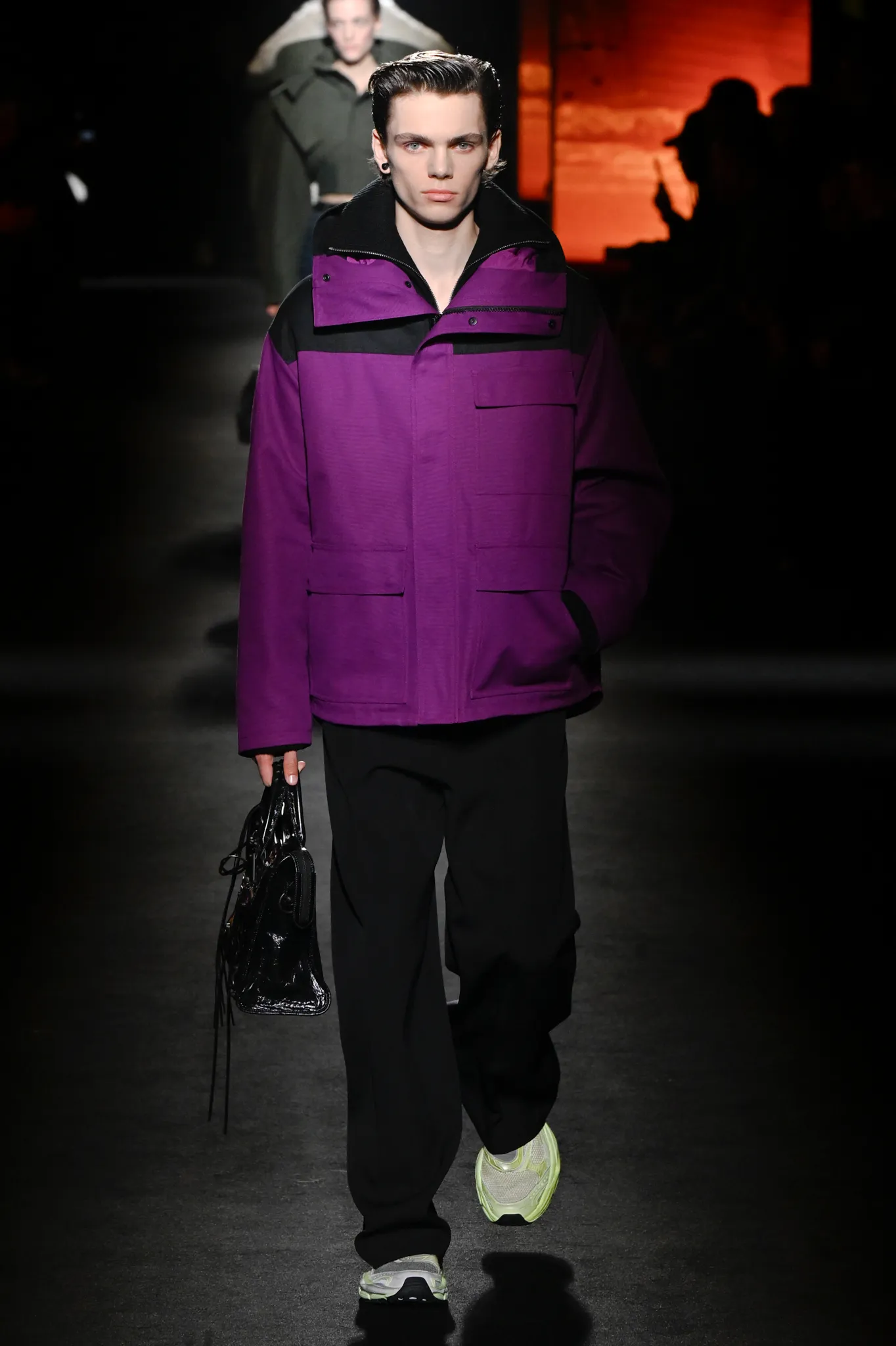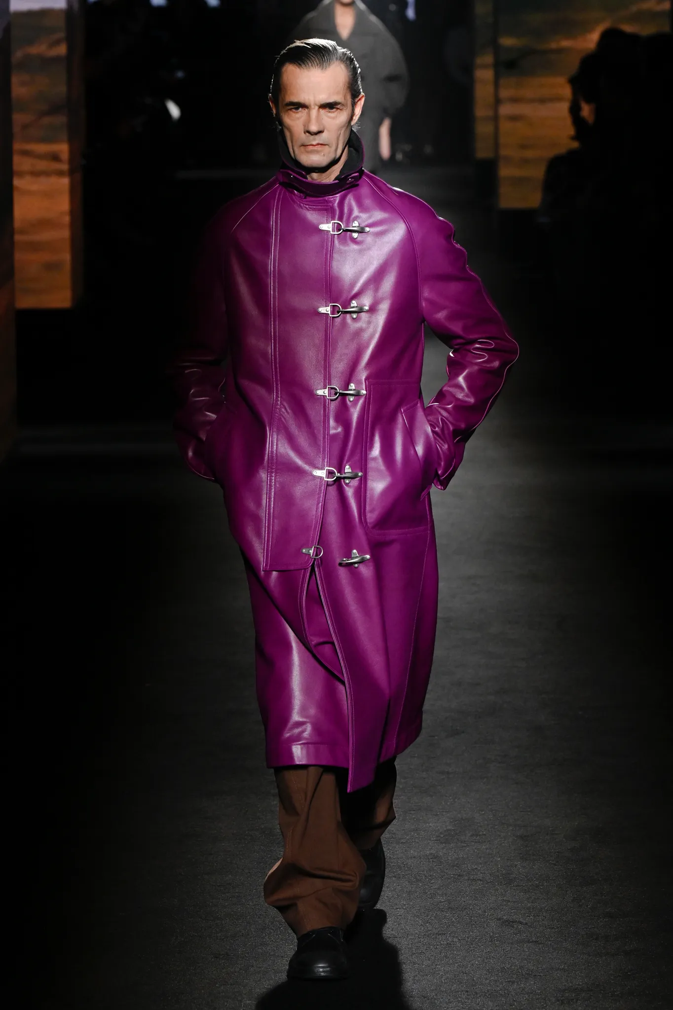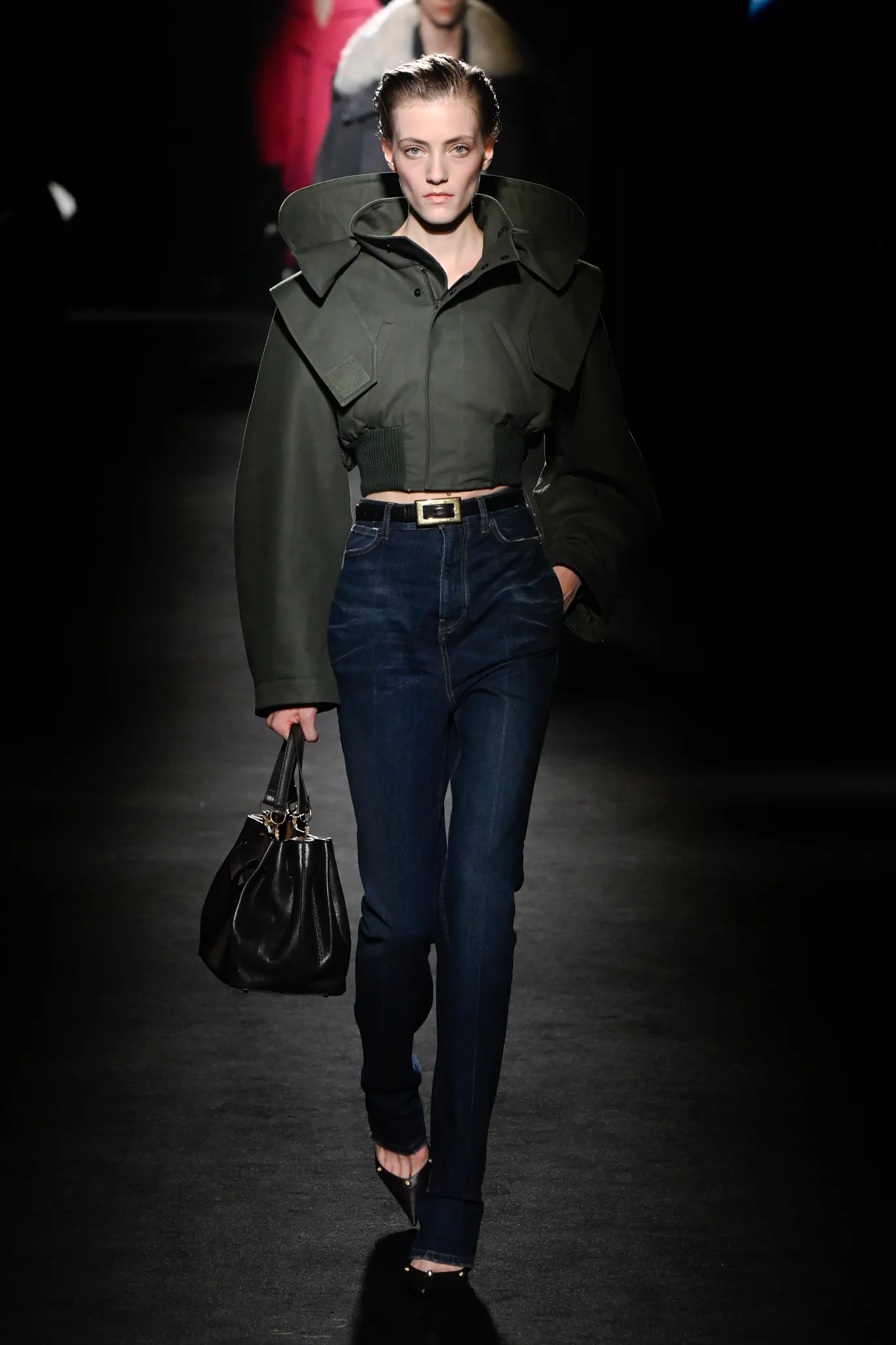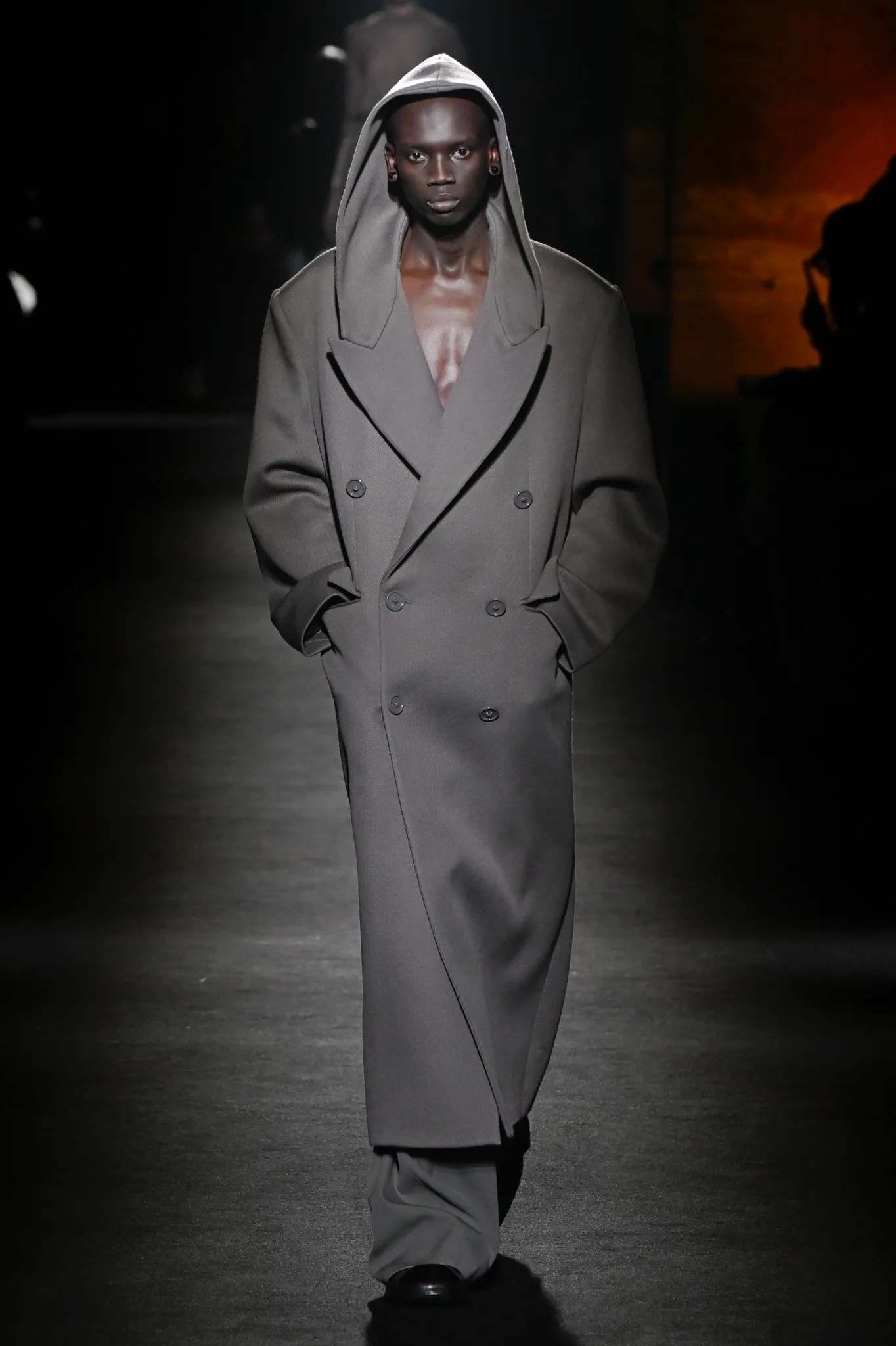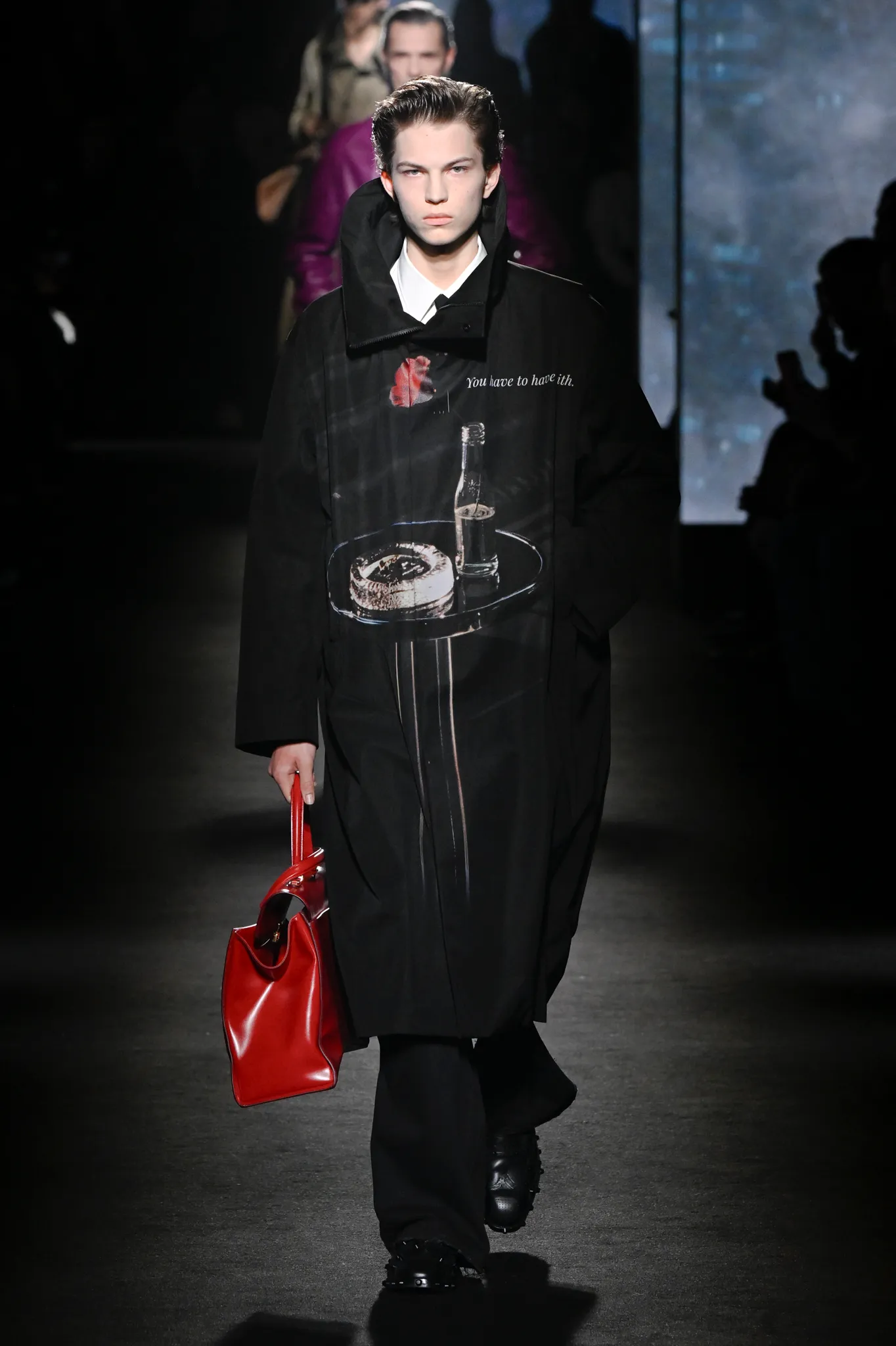 本季,Pierpaolo Piccioli 选择强化 Demna 此前那种颓废、青年亚文化的氛围,而非延续上季高定的精致感,邀请《Euphoria》创作者 Sam Levinson 共同为秀场布景。空间被黑色地毯与舞台灯光包裹,数十块视频屏幕循环播放加州风景、狼群、空旷酒吧以及新一季演员的表情片段,包括 Danielle Deadwyler 紧张眨眼的画面,营造出强烈的沉浸感。模特沿着微弱光线走出,服装以精致的外套为核心,多数呈现夸张的背部廓形或茧形轮廓,呼应创始人 Cristóbal Balenciaga 的标志性剪影。