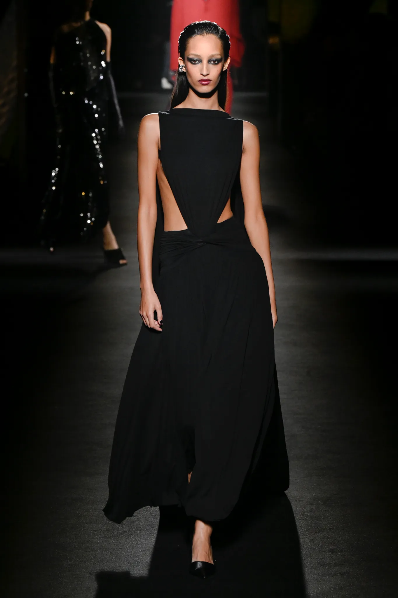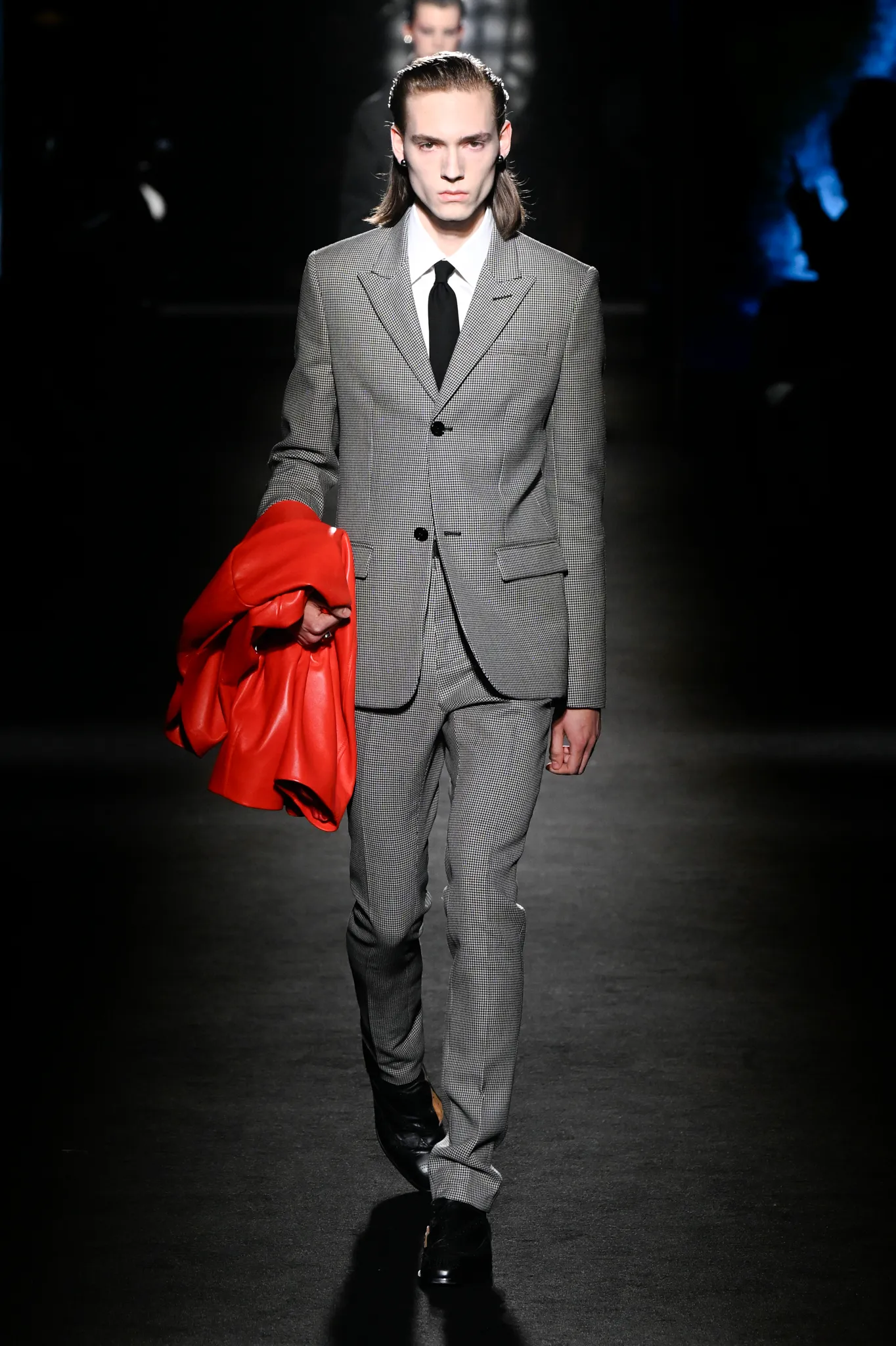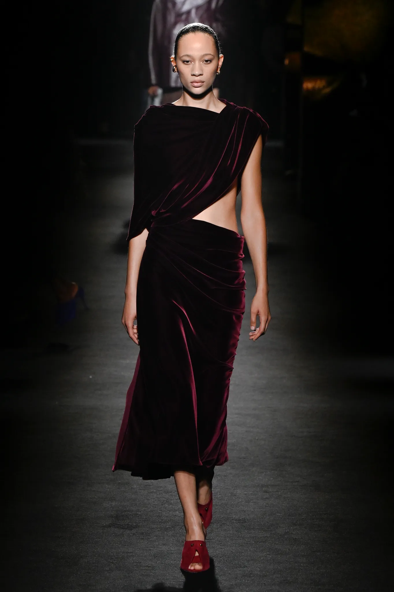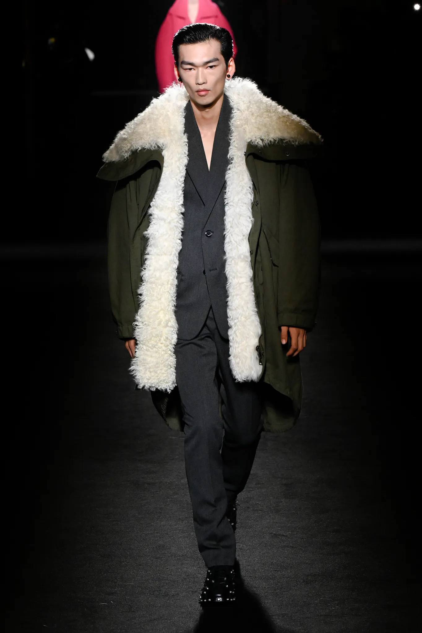本季,Pierpaolo Piccioli 选择强化 Demna 此前那种颓废、青年亚文化的氛围,而非延续上季高定的精致感,邀请《Euphoria》创作者 Sam Levinson 共同为秀场布景。空间被黑色地毯与舞台灯光包裹,数十块视频屏幕循环播放加州风景、狼群、空旷酒吧以及新一季演员的表情片段,包括 Danielle Deadwyler 紧张眨眼的画面,营造出强烈的沉浸感。模特沿着微弱光线走出,服装以精致的外套为核心,多数呈现夸张的背部廓形或茧形轮廓,呼应创始人 Cristóbal Balenciaga 的标志性剪影。