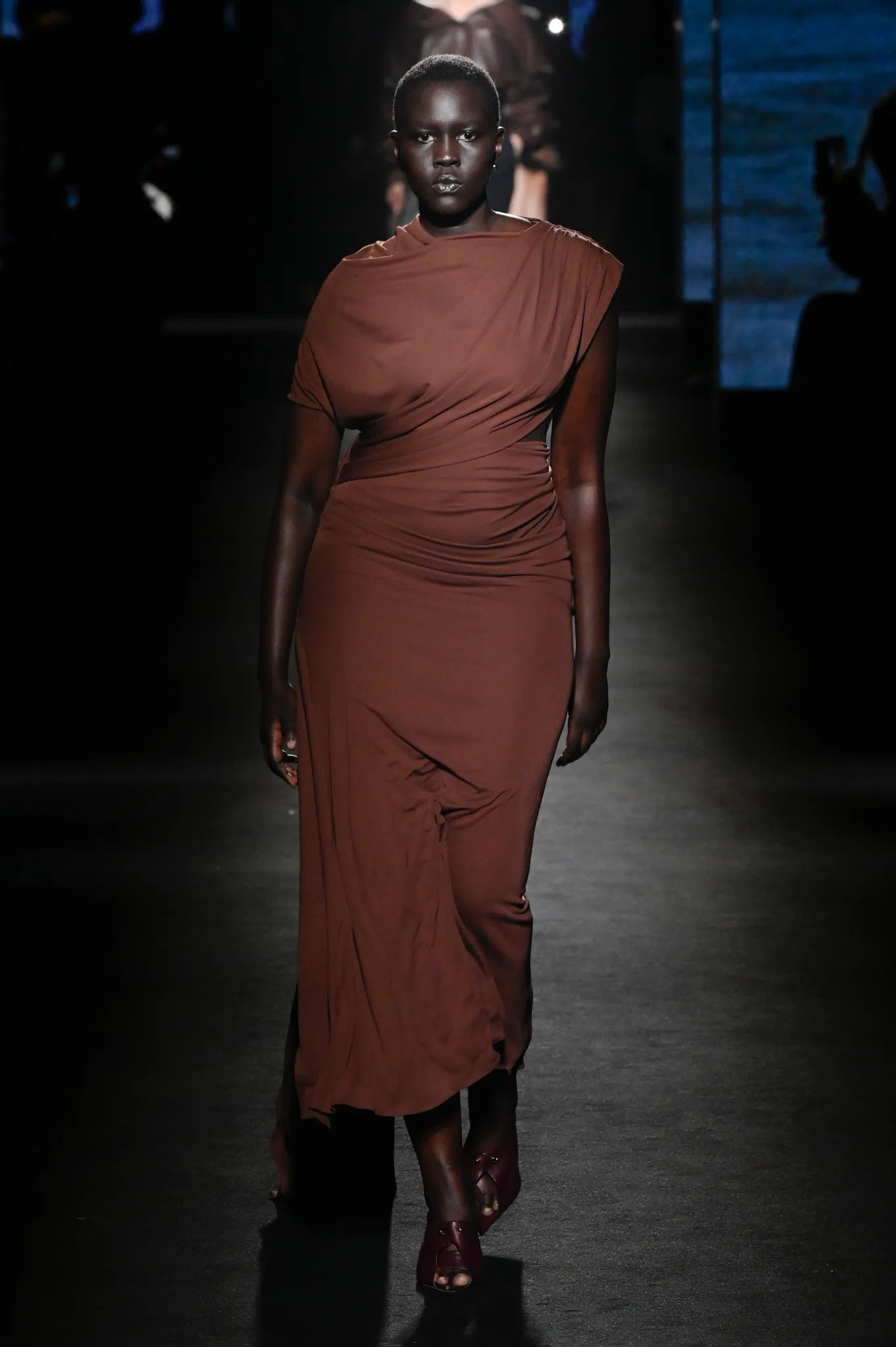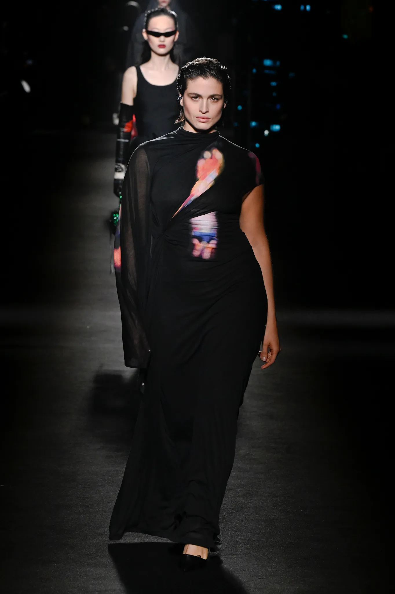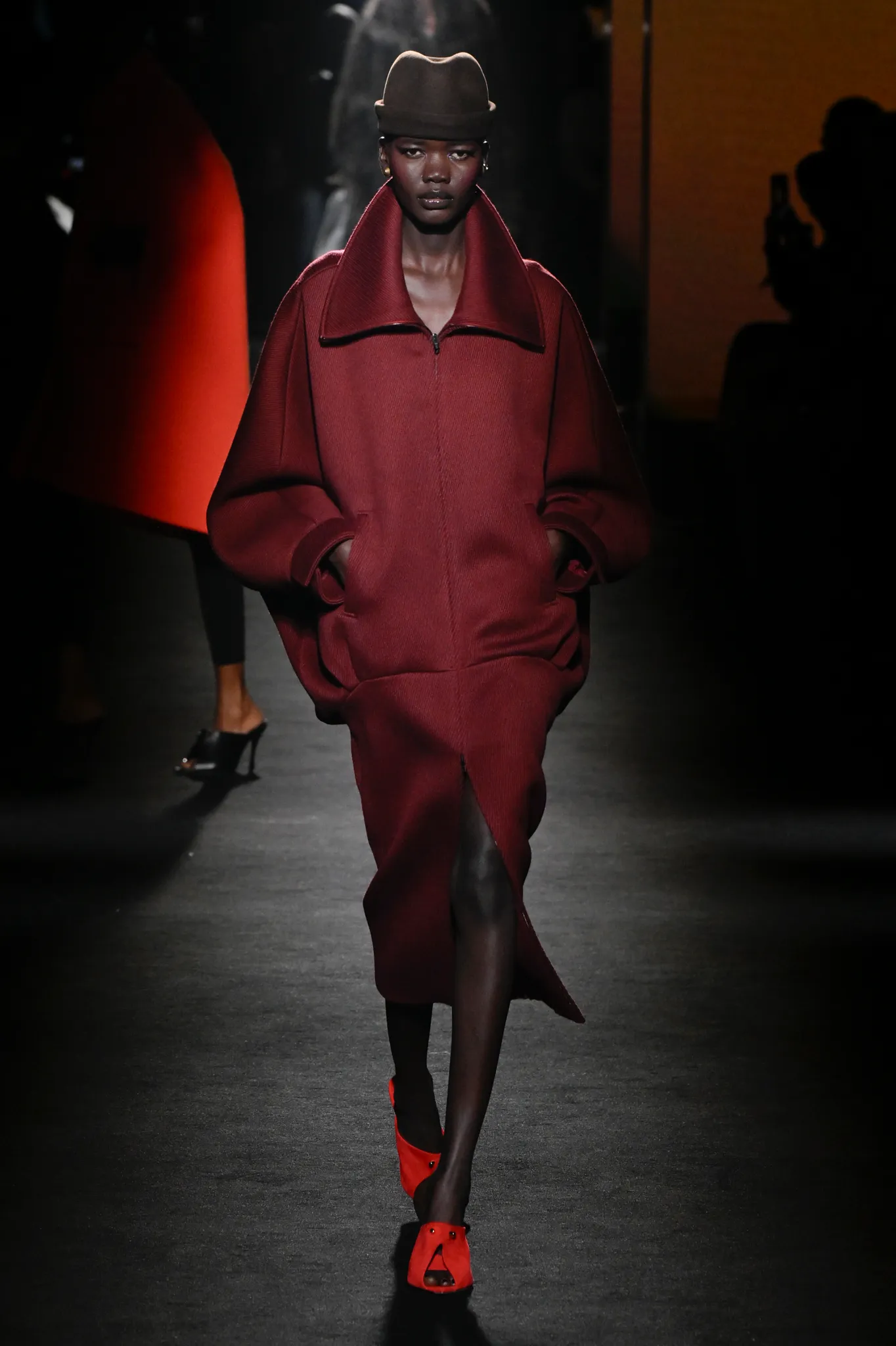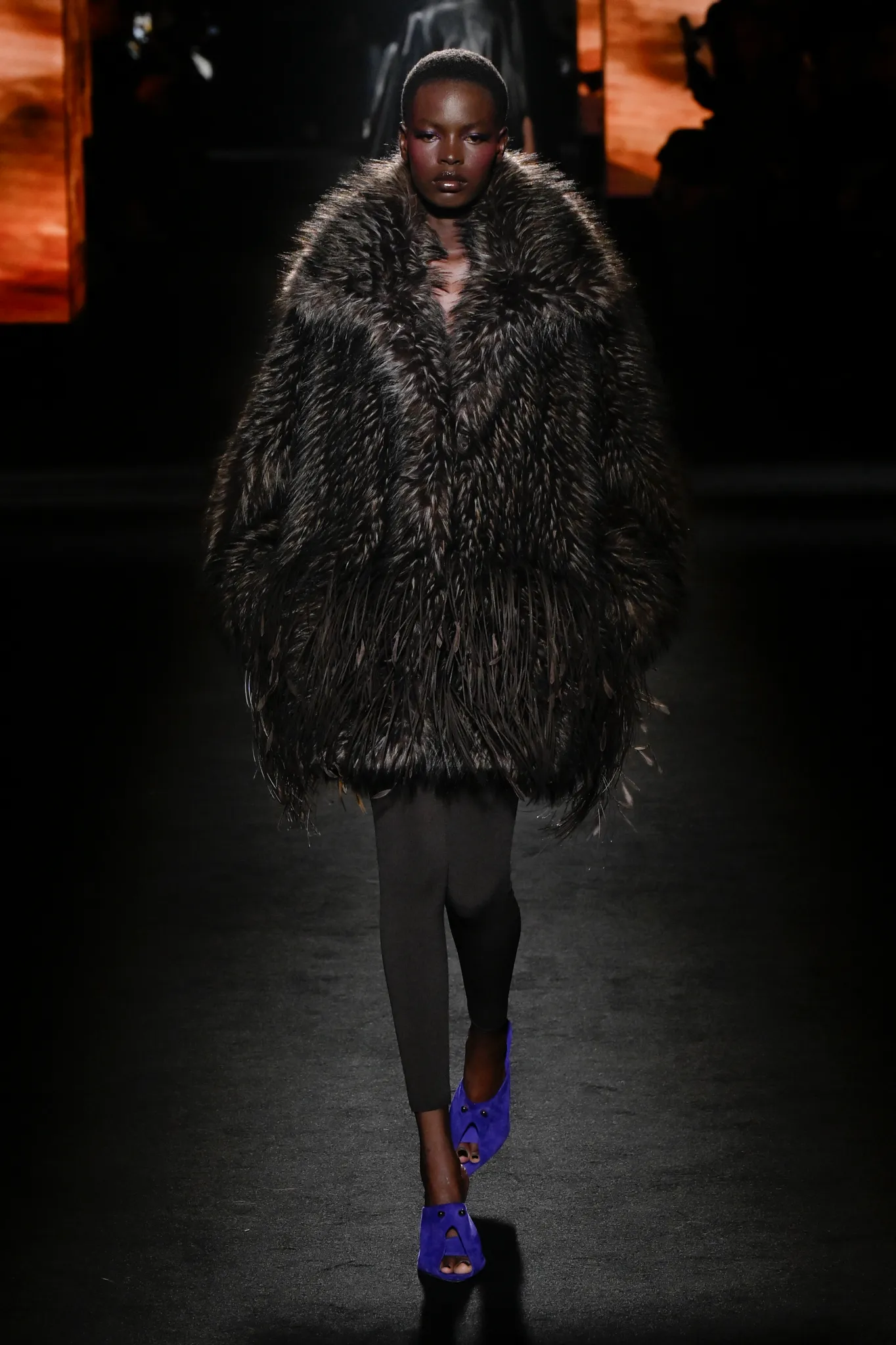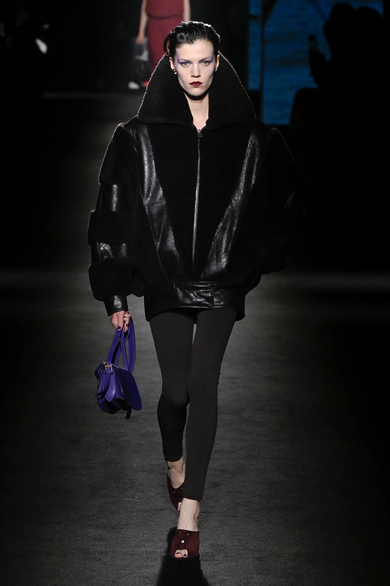 本季,Pierpaolo Piccioli 选择强化 Demna 此前那种颓废、青年亚文化的氛围,而非延续上季高定的精致感,邀请《Euphoria》创作者 Sam Levinson 共同为秀场布景。空间被黑色地毯与舞台灯光包裹,数十块视频屏幕循环播放加州风景、狼群、空旷酒吧以及新一季演员的表情片段,包括 Danielle Deadwyler 紧张眨眼的画面,营造出强烈的沉浸感。模特沿着微弱光线走出,服装以精致的外套为核心,多数呈现夸张的背部廓形或茧形轮廓,呼应创始人 Cristóbal Balenciaga 的标志性剪影。