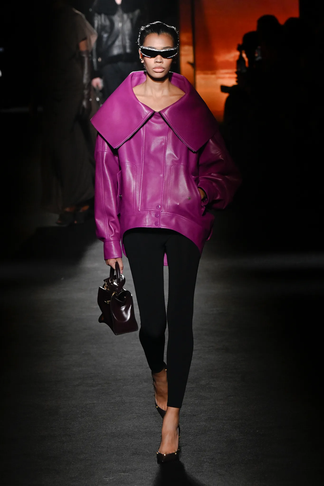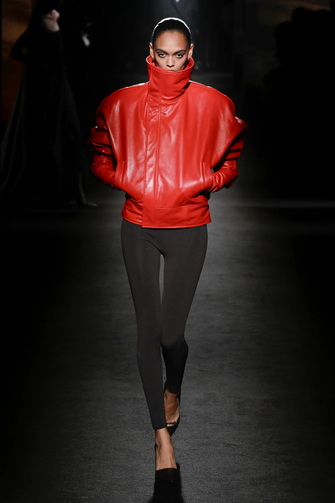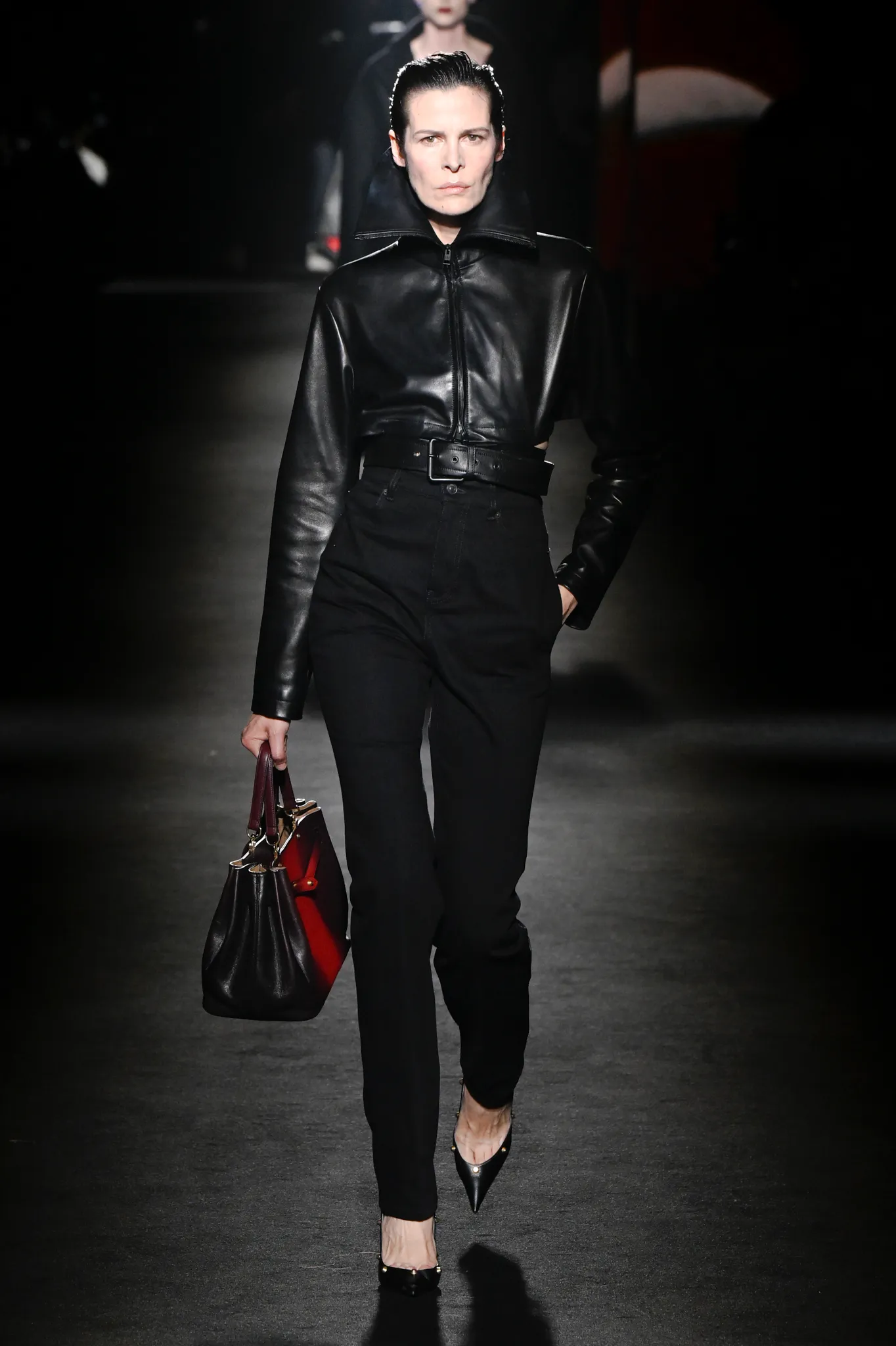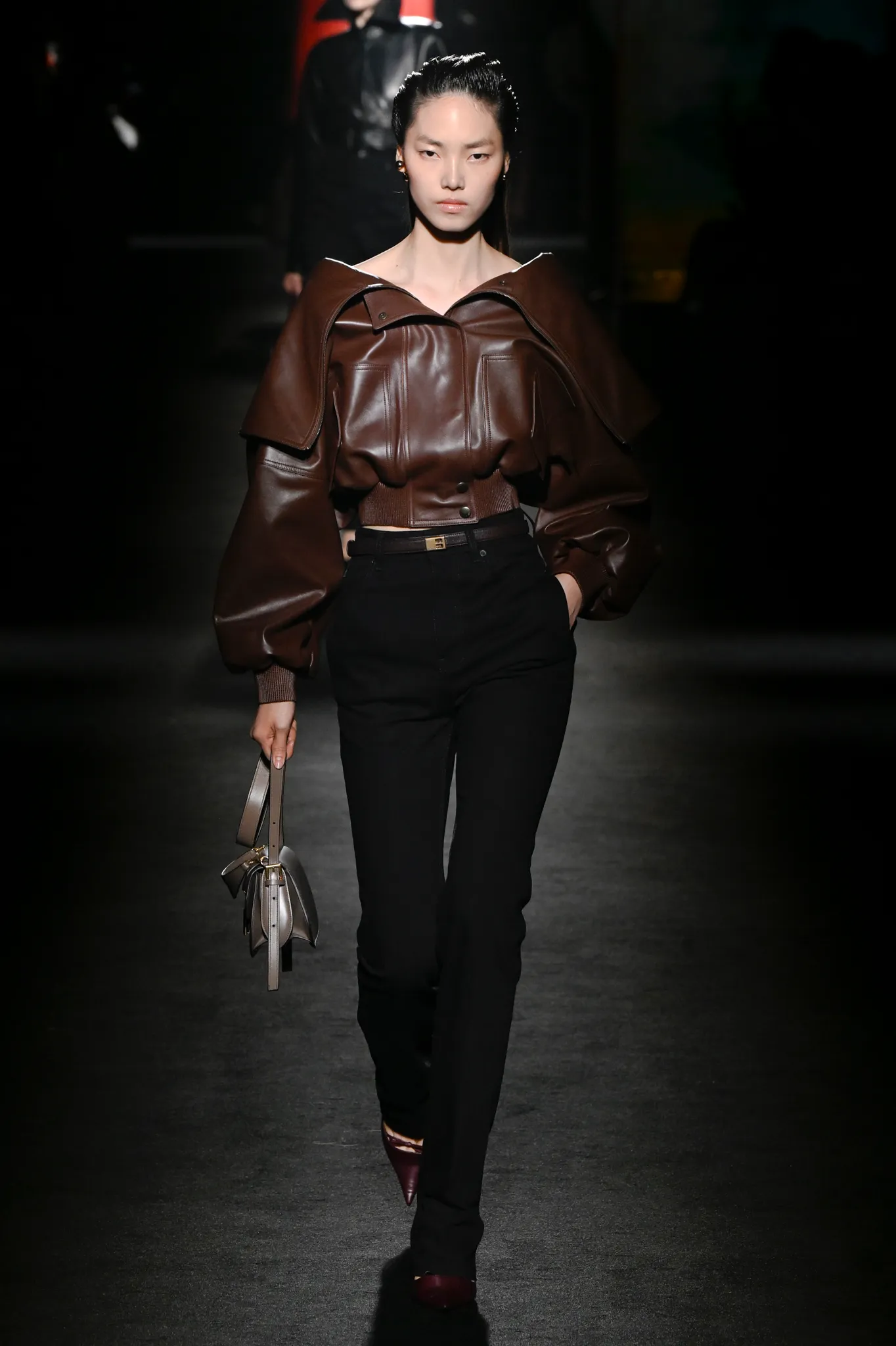 首个造型便是一件黑色皮革气球飞行员夹克与铅笔裙一体化设计,从胯部到颈部拉链贯通,呈现街头与高定融合的风格。黑色皮革披风、飞行员迷你裙搭配过膝靴,以及印有《Euphoria》剧照的毛衣,都显然在呼应年轻消费者的文化喜好。