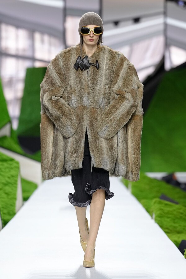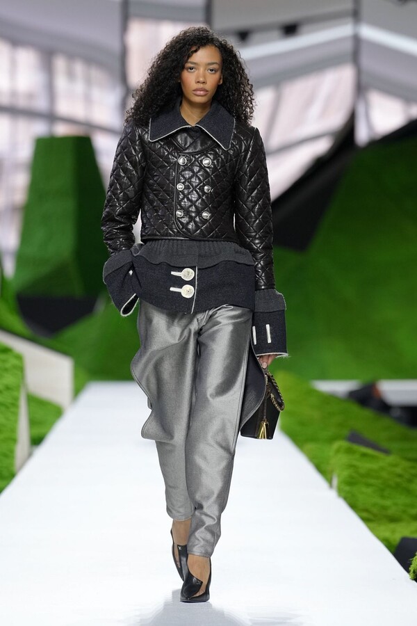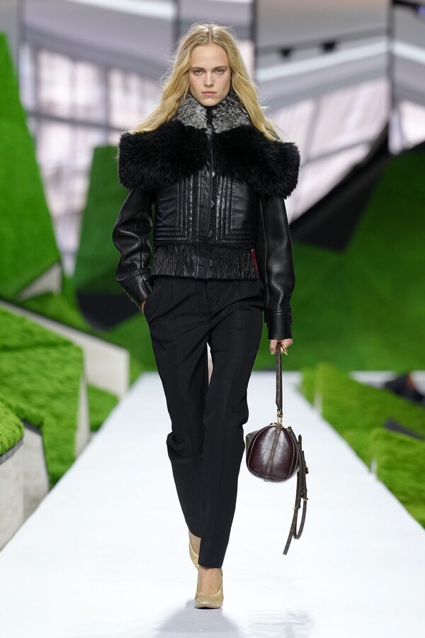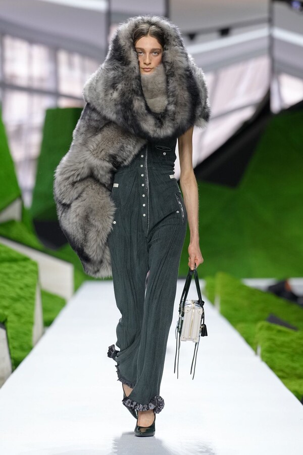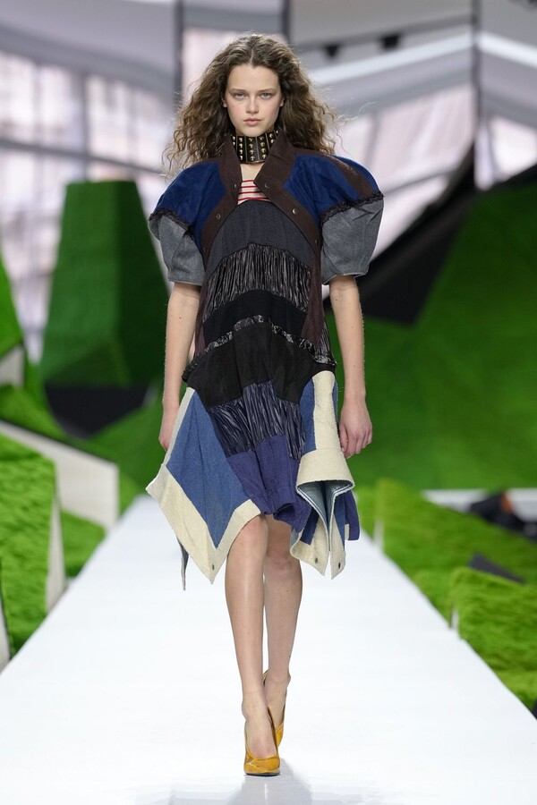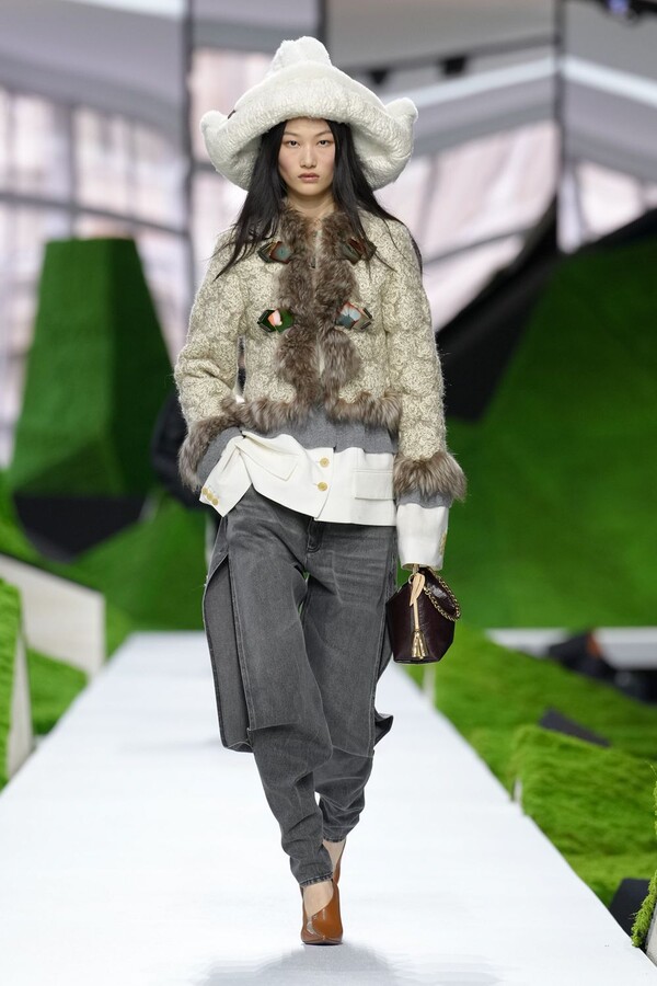除了以上民间元素,Nicolas Ghesquière 标志性美学也得以保留。短款皮夹克在领口处饰以植物纹理皮草,为整体注入了更鲜明、更具都市气息的活力。由错综复杂的几何图案拼接而成的短裙利落前卫,与本季的自然元素形成了鲜明对比。