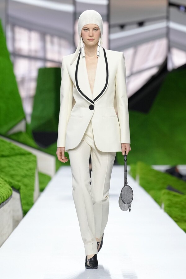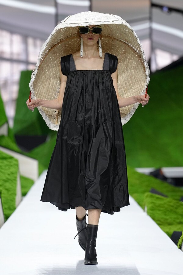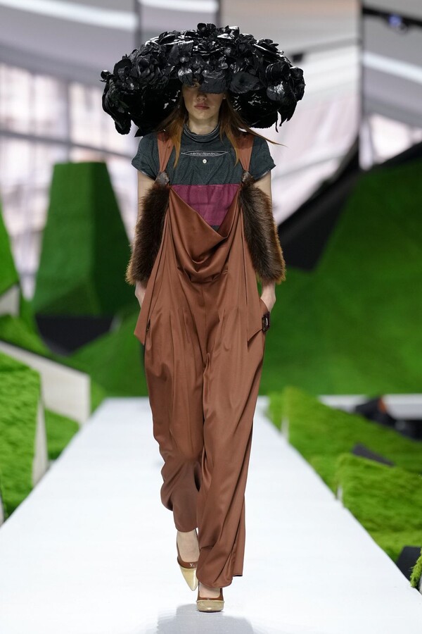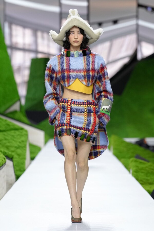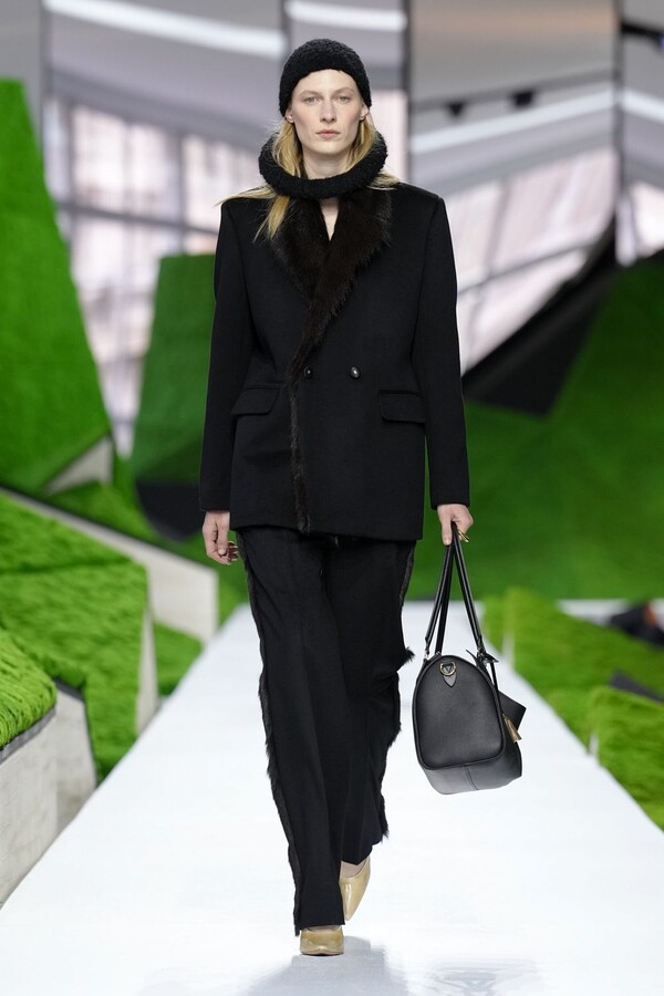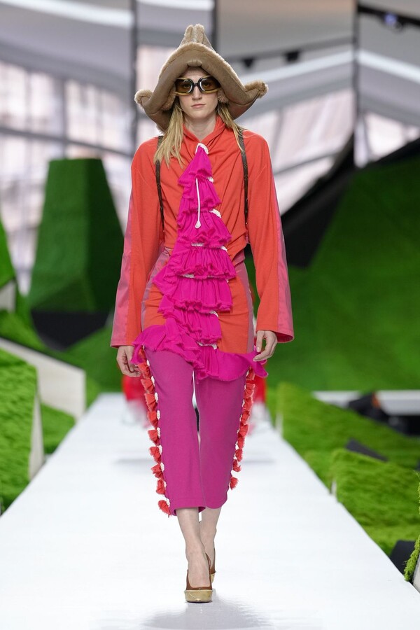除了以上民间元素,Nicolas Ghesquière 标志性美学也得以保留。短款皮夹克在领口处饰以植物纹理皮草,为整体注入了更鲜明、更具都市气息的活力。由错综复杂的几何图案拼接而成的短裙利落前卫,与本季的自然元素形成了鲜明对比。