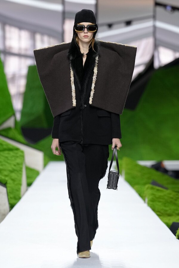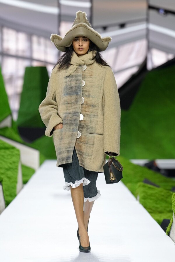 在 Nicolas Ghesquière 的主导下,LOUIS VUITTON 2026 秋冬系列一改以往常见的都市风,转而对服装传统进行了更为广阔的思考。开场几套造型令人联想到土耳其传统的牧羊人披风,它们经由 LOUIS VUITTON 的设计语言重新诠释,以拉绒动物毛面料或皮革饰边羊毛制成,廓形宽大,极具立体感。其夸张的尺寸和雕塑般的造型,与本季巴黎时装周上常见的实用主义风格截然不同。Nicolas Ghesquière 并未将重点放在穿着的便捷性上,而是打造出鼓励视觉探索和叙事联想的廓形。