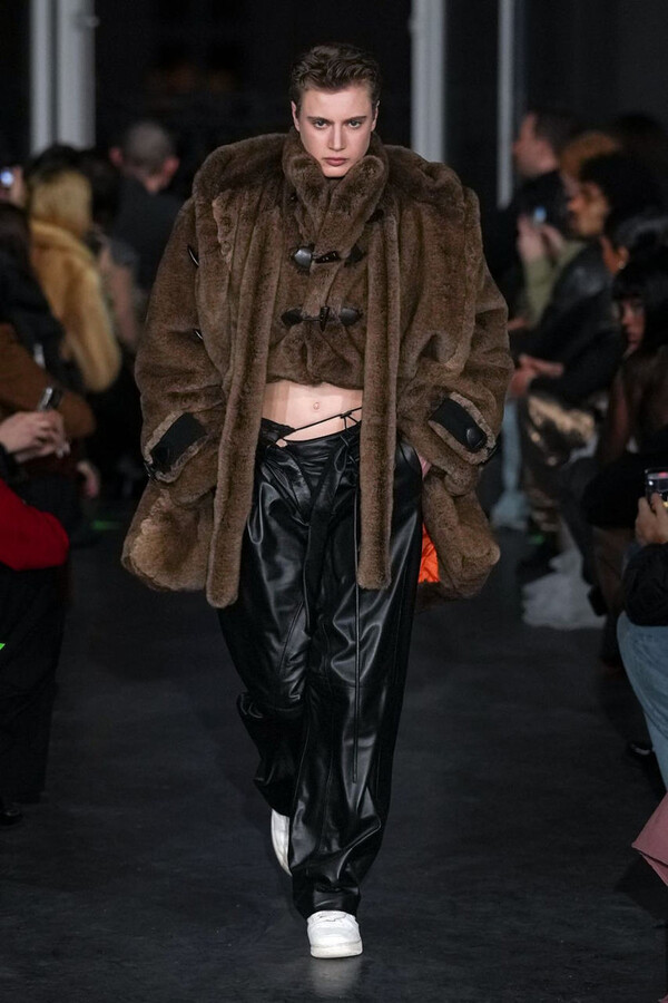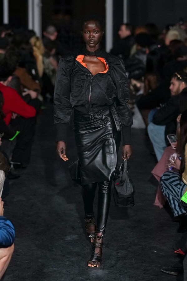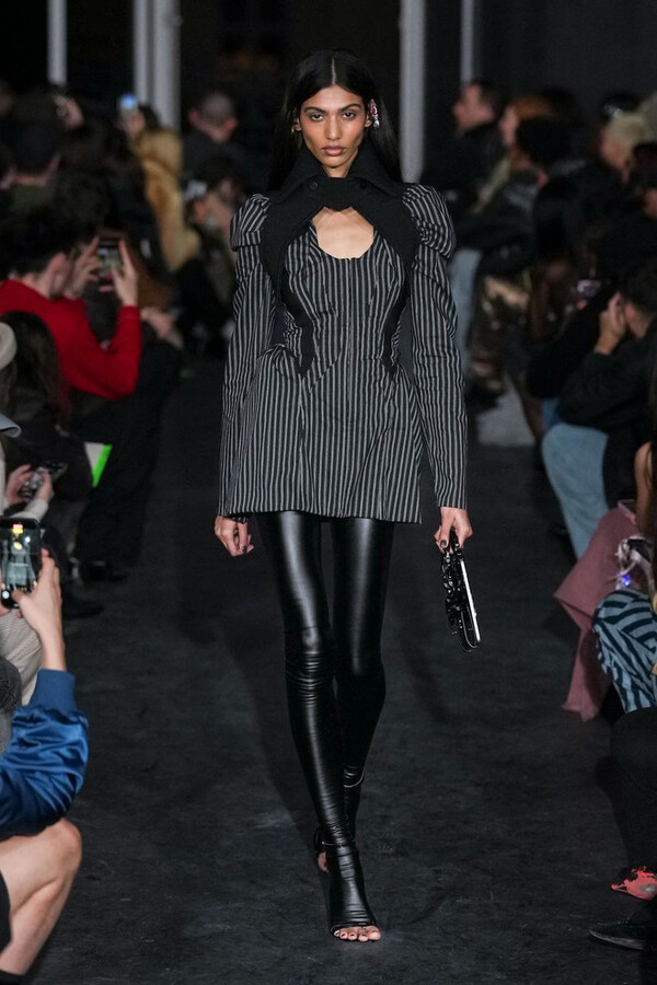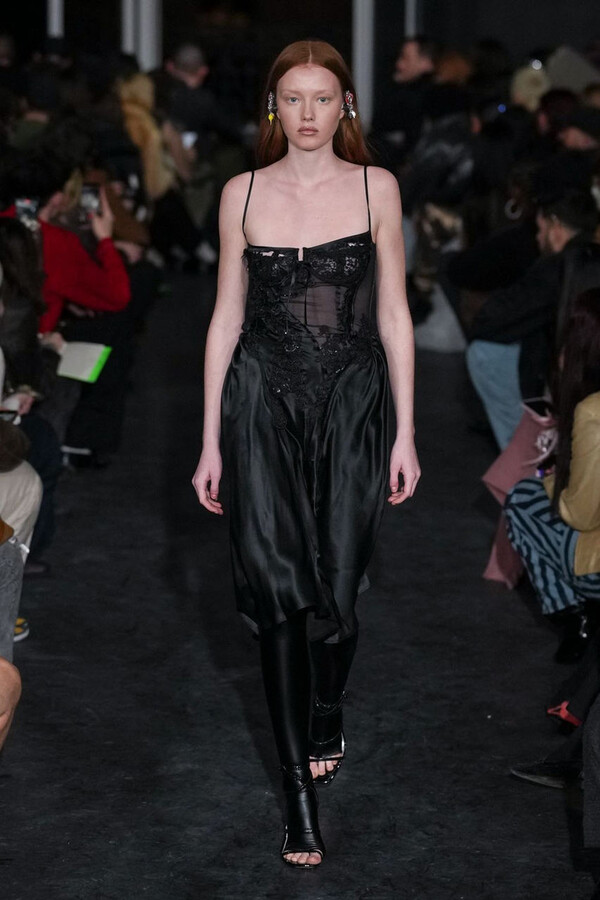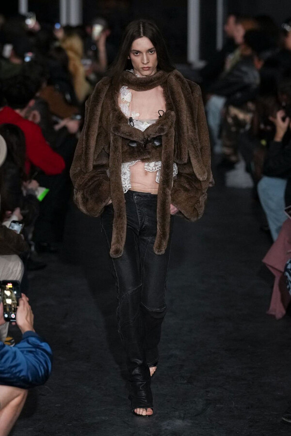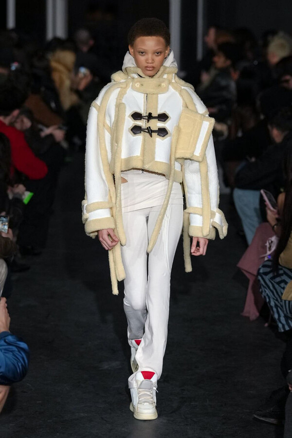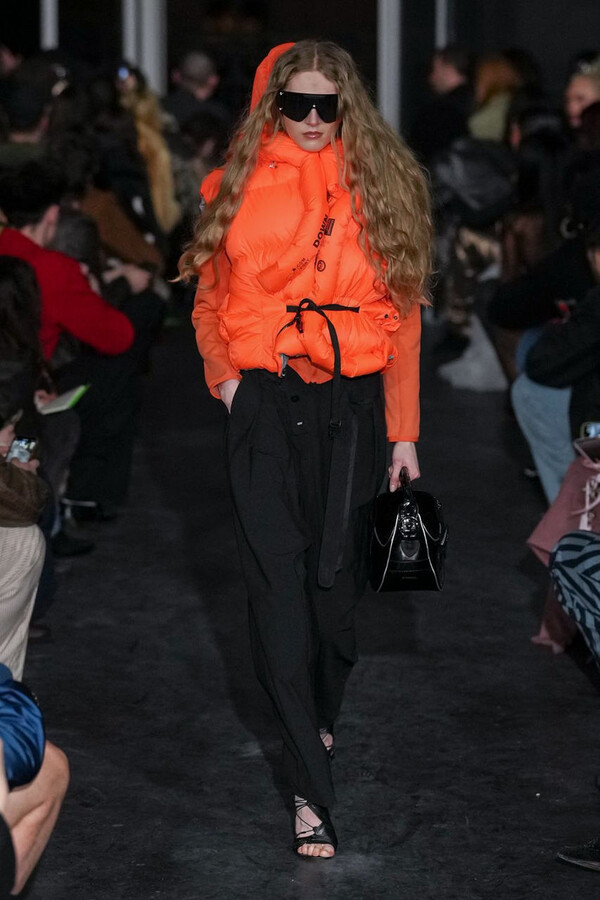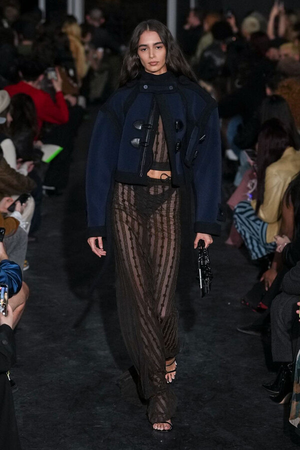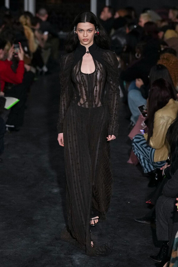 全场处处可见实用主义元素。粗呢大衣的纽扣被巧妙地运用到人造皮草夹克和缎面连衣裙上,胸罩上的抽绳则向上延伸。这种设计既带有高山运动装的风格,又兼具夜店造型的时尚感。在秀临近尾声时,服装廓形再次发生了变化——以传统紧身连衣裙为灵感的礼服亮相。它们采用氯丁橡胶和薄纱等新材质,将民间元素与未来主义的制作工艺巧妙融合,进一步强化了混搭感。