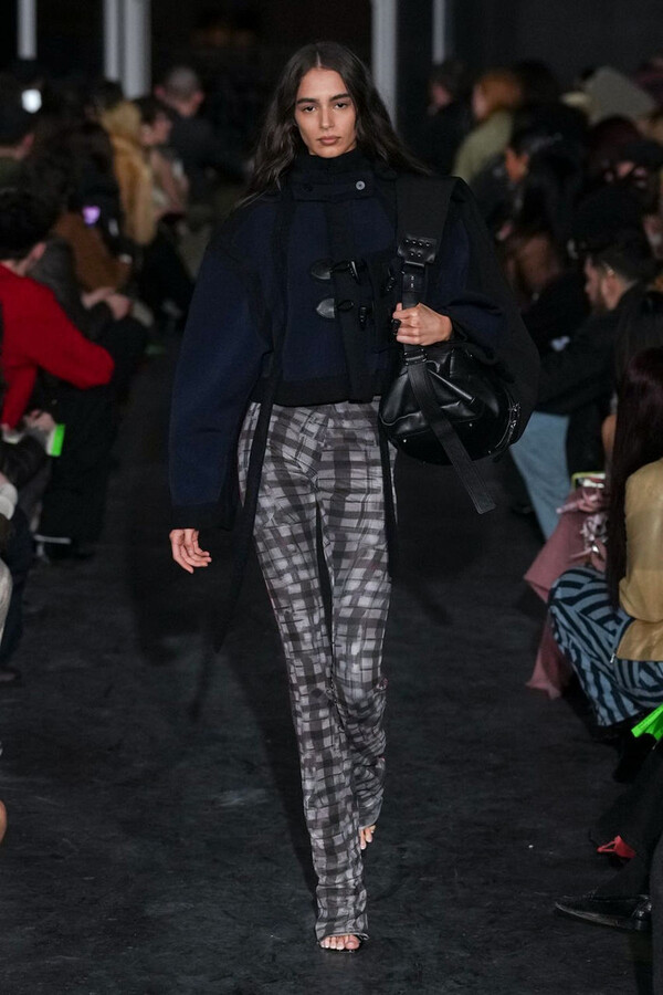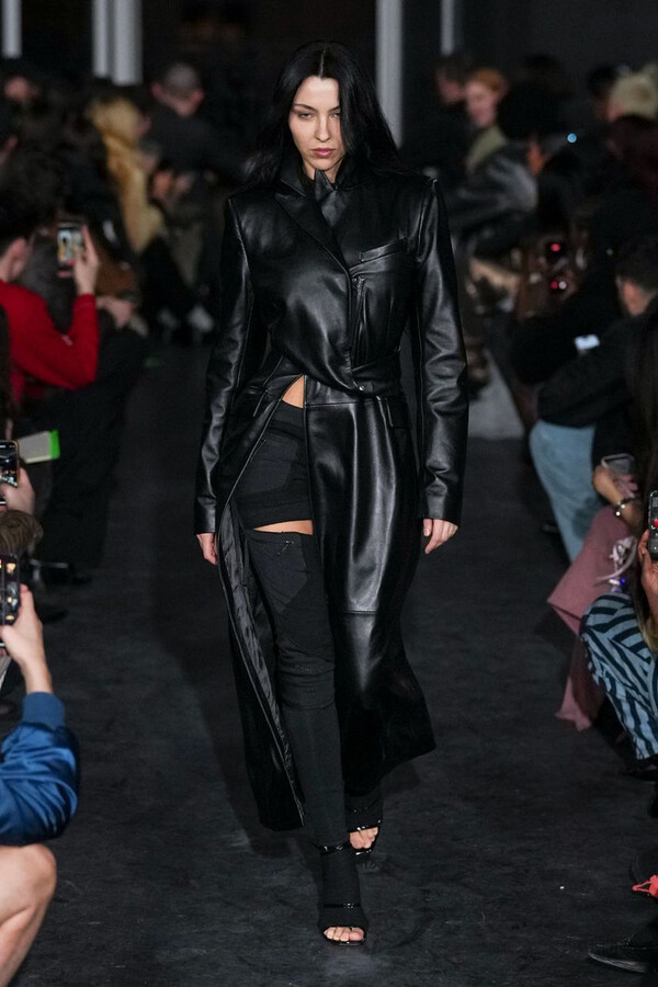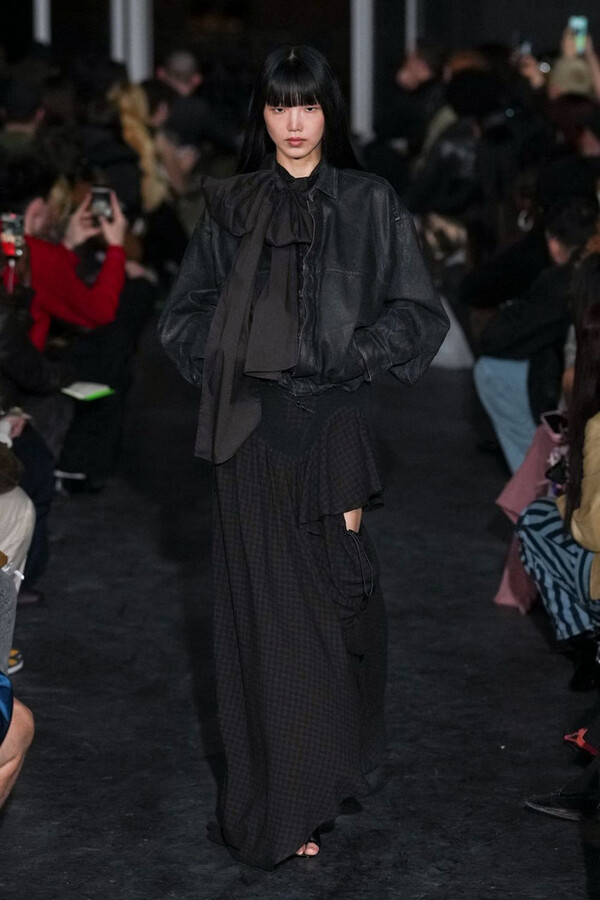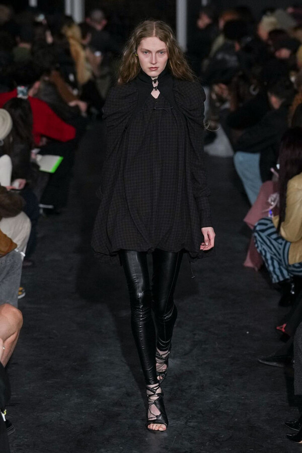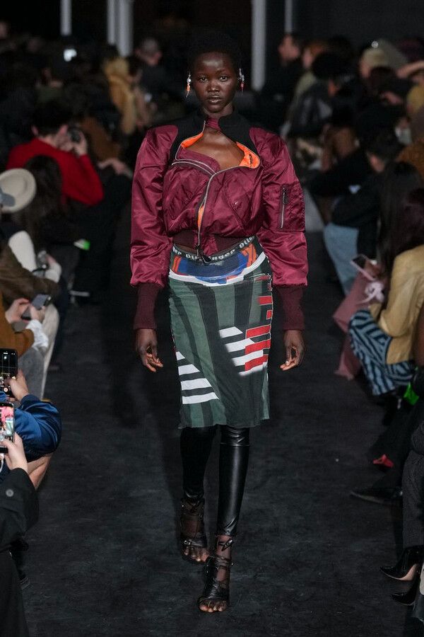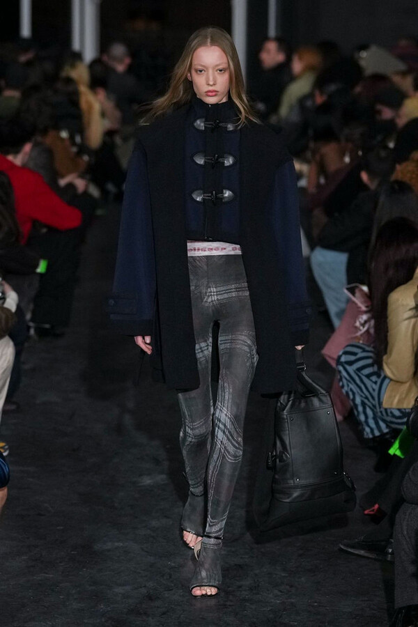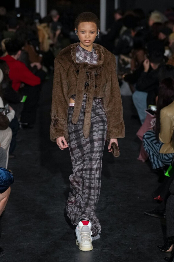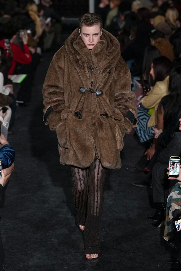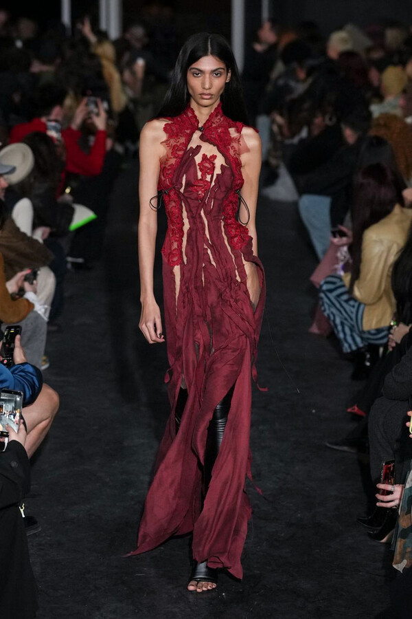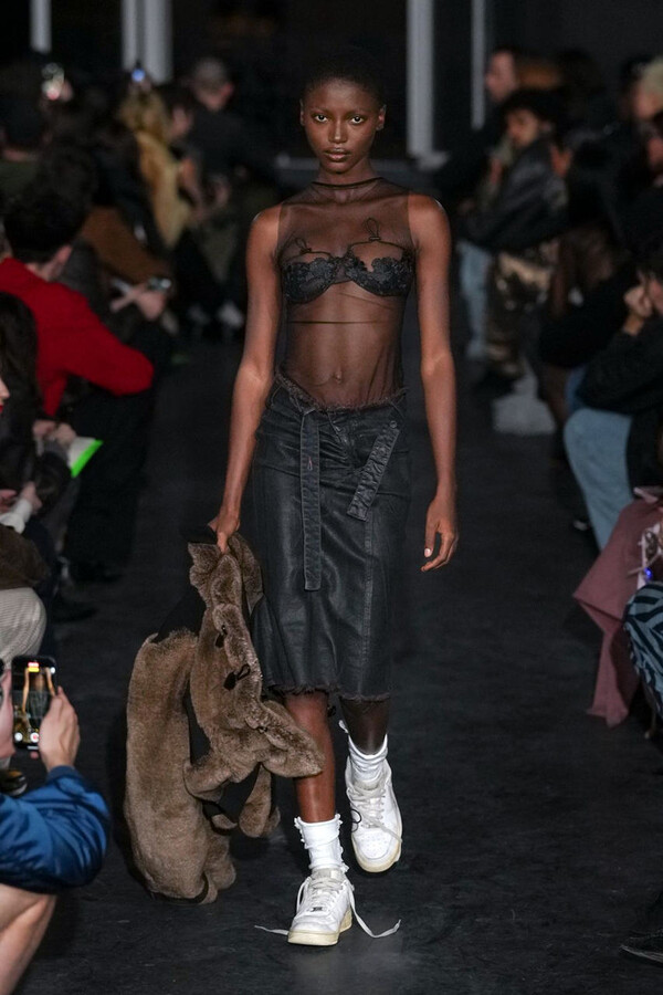 全场处处可见实用主义元素。粗呢大衣的纽扣被巧妙地运用到人造皮草夹克和缎面连衣裙上,胸罩上的抽绳则向上延伸。这种设计既带有高山运动装的风格,又兼具夜店造型的时尚感。在秀临近尾声时,服装廓形再次发生了变化——以传统紧身连衣裙为灵感的礼服亮相。它们采用氯丁橡胶和薄纱等新材质,将民间元素与未来主义的制作工艺巧妙融合,进一步强化了混搭感。