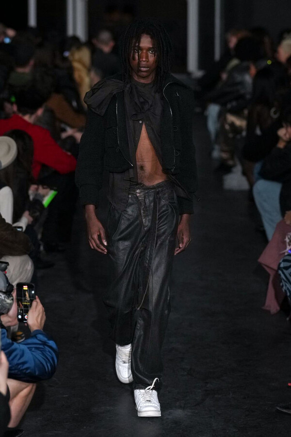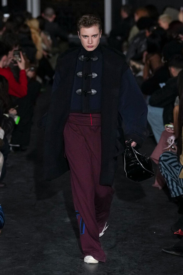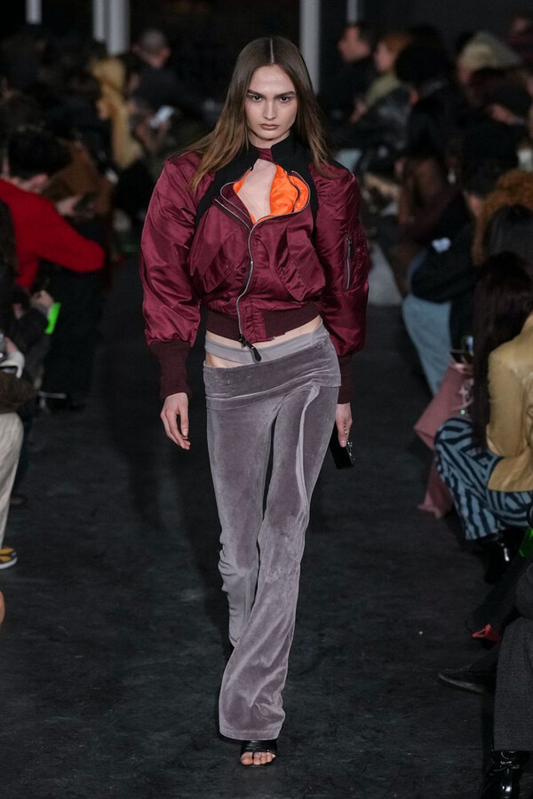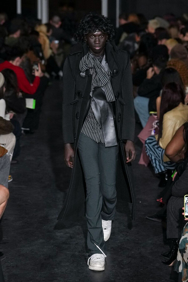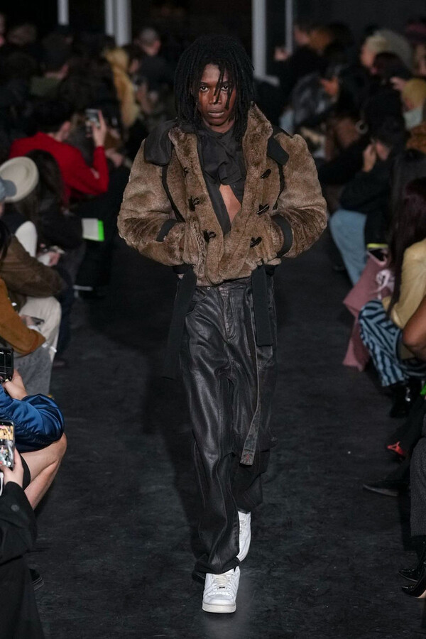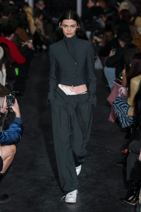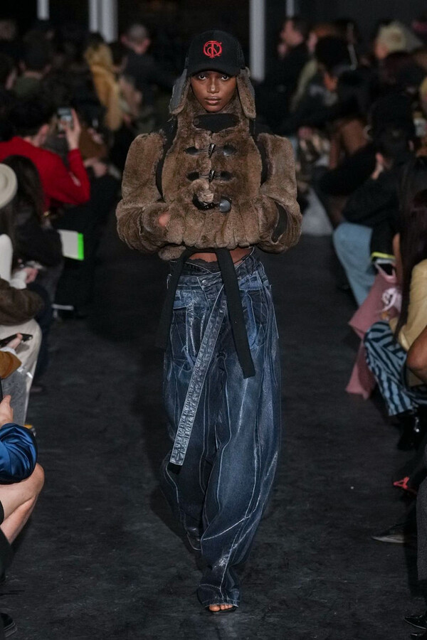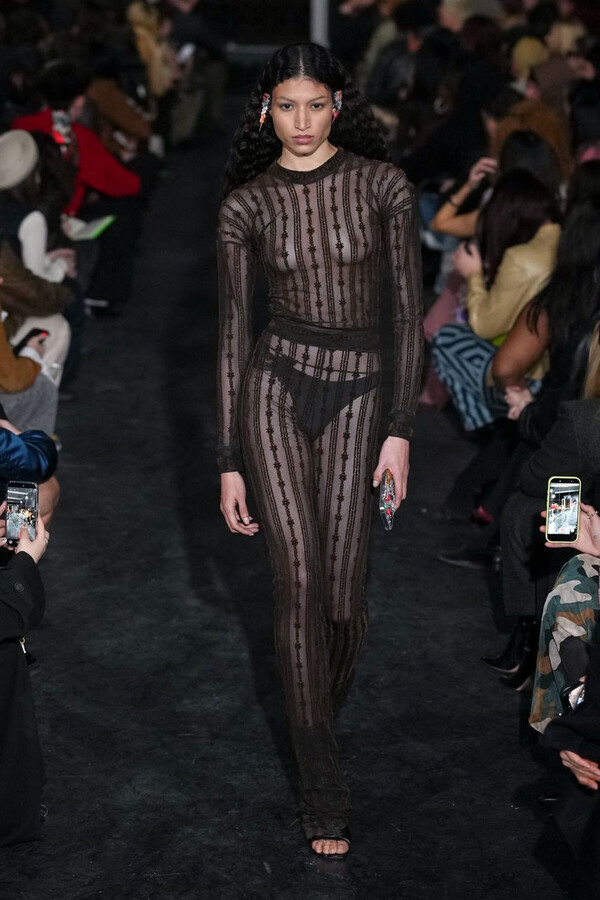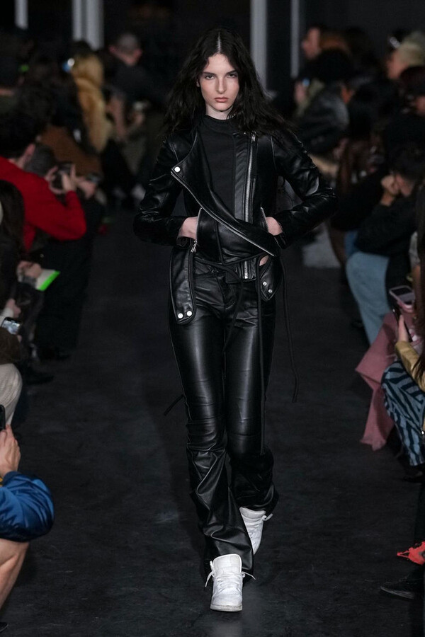 全场处处可见实用主义元素。粗呢大衣的纽扣被巧妙地运用到人造皮草夹克和缎面连衣裙上,胸罩上的抽绳则向上延伸。这种设计既带有高山运动装的风格,又兼具夜店造型的时尚感。在秀临近尾声时,服装廓形再次发生了变化——以传统紧身连衣裙为灵感的礼服亮相。它们采用氯丁橡胶和薄纱等新材质,将民间元素与未来主义的制作工艺巧妙融合,进一步强化了混搭感。