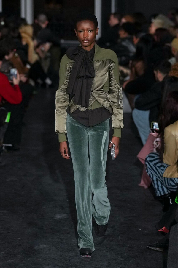 廓形上继续玩转比例与露肤度——Christa Bösch 和 Cosima Gadient 摒弃了品牌早期标志性的紧身机车裤,转而推出低腰裤,腰带与腰部之间以精致的蕾丝拼接点缀。这一细节在保持前卫的同时增添了一丝性感。设计师们还以独特视角重新诠释了经典剪裁元素,将细条纹与系带衬衫和线条流畅的迷你连衣裙融合。她们还进一步探索丝绒休闲服饰,推出了一款兼具舒适性和时尚感的垂坠半身裙。