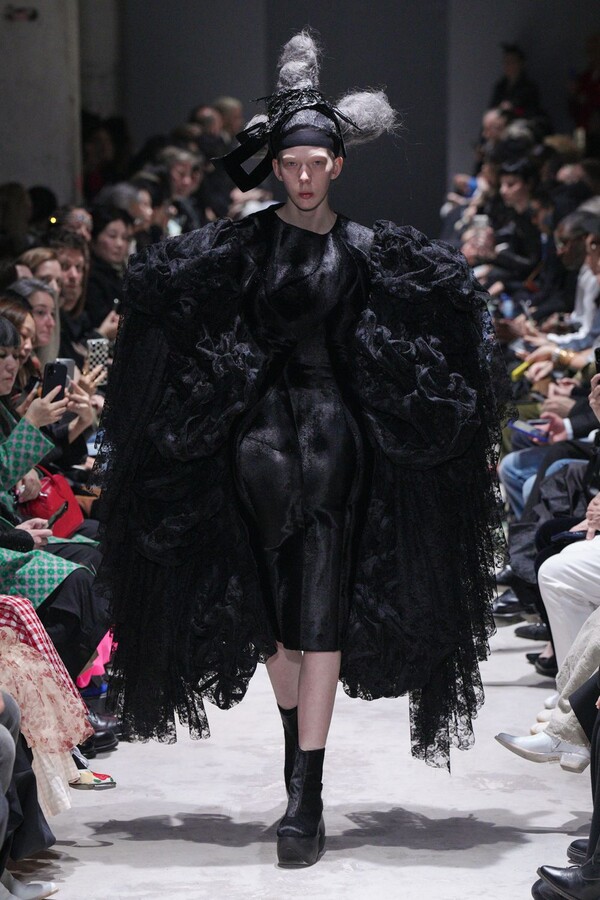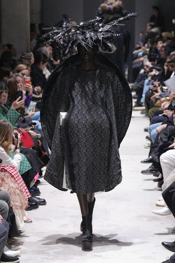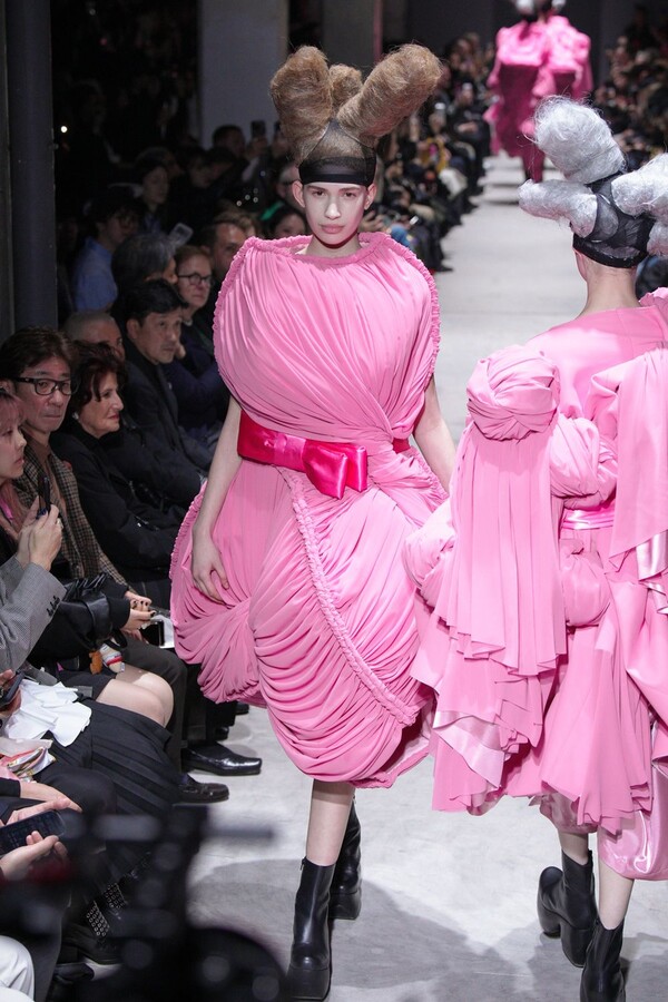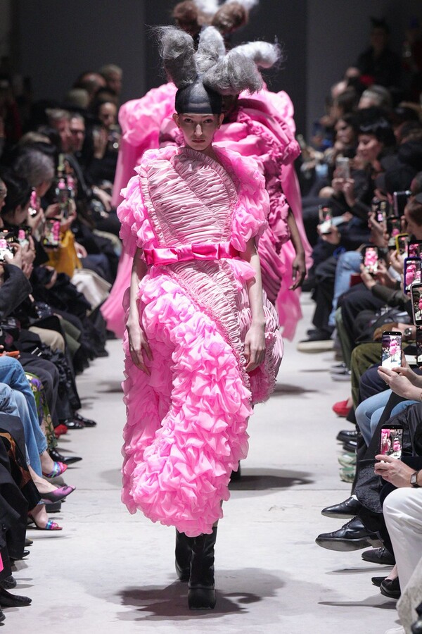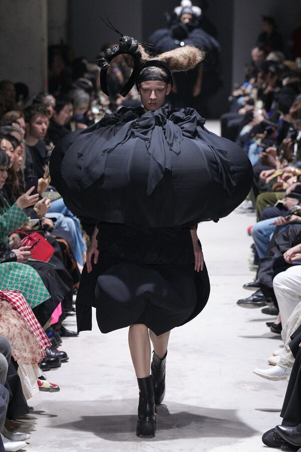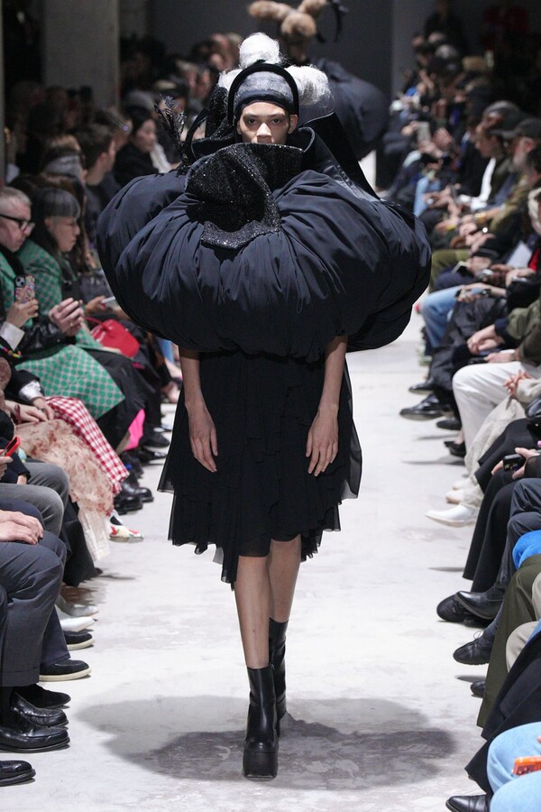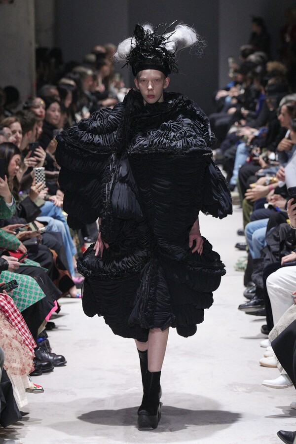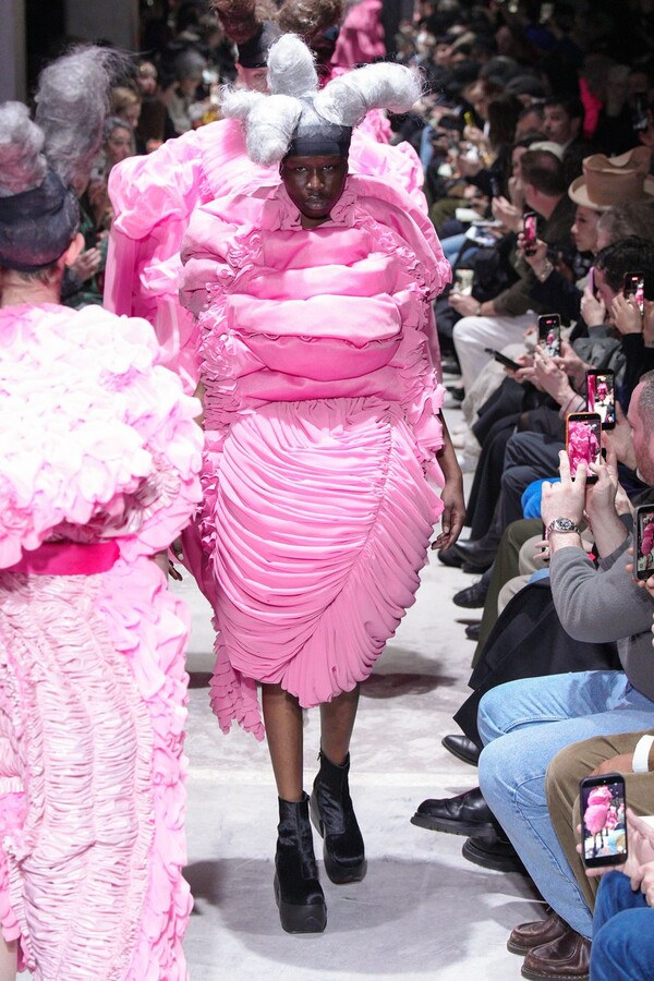 同往季一样,COMME des GARÇONS 2026 秋冬秀与传统的时装秀相比更像是一场哲学的探讨。它运用造型、质地和色彩来引发人们思考,而非提供简单的答案。整场秀以十六套黑色造型拉开帷幕,每件服装都宛如雕塑般精雕细琢,层层叠叠的复杂工艺与视觉张力交织融合。廓形宽大而富有建筑感,将人包裹其中。随后的六套造型与先前的轮廓遥相呼应,但色调换成了甜美浓郁的粉色。这突如其来的色彩转变与起初的暗色调形成了鲜明对比,令人眼前一亮。