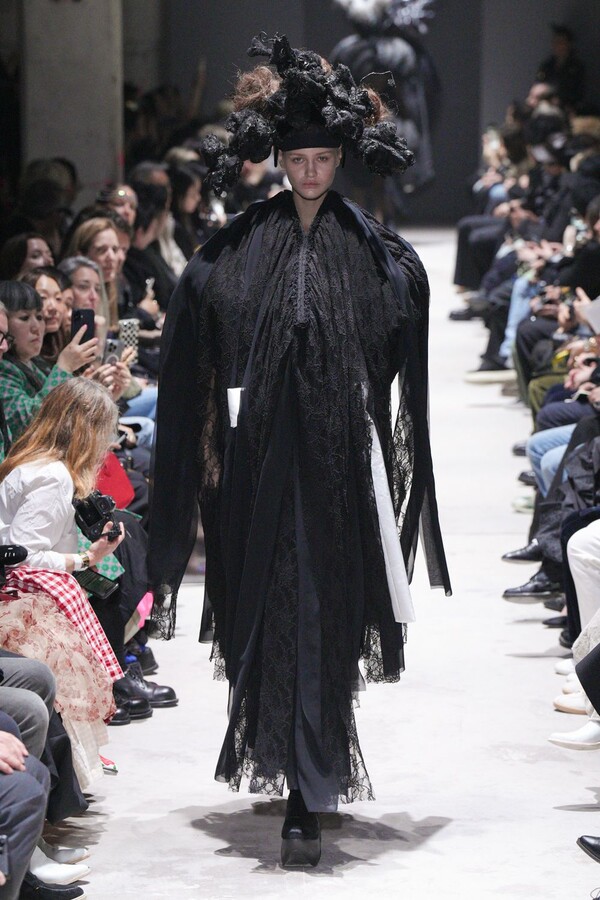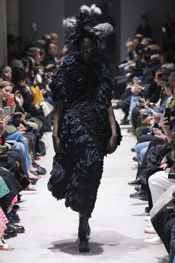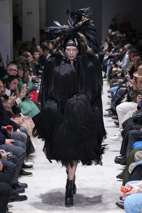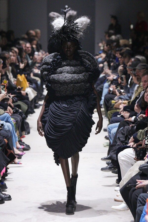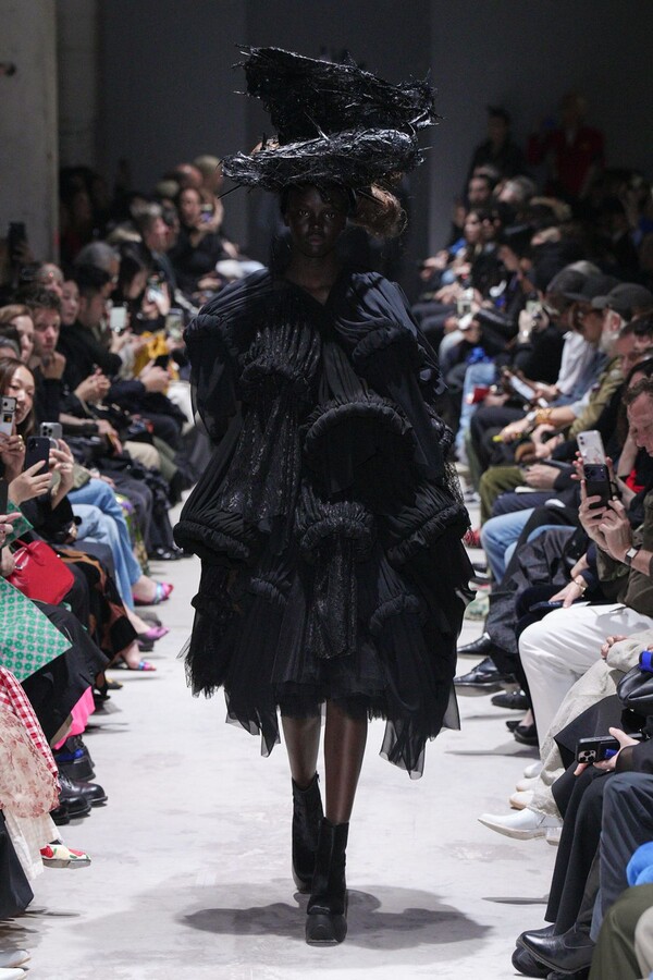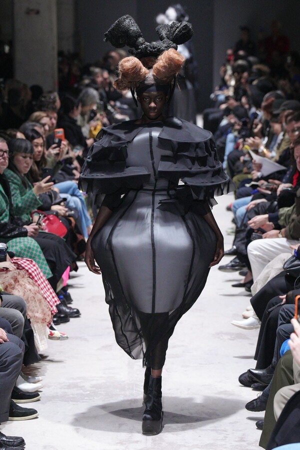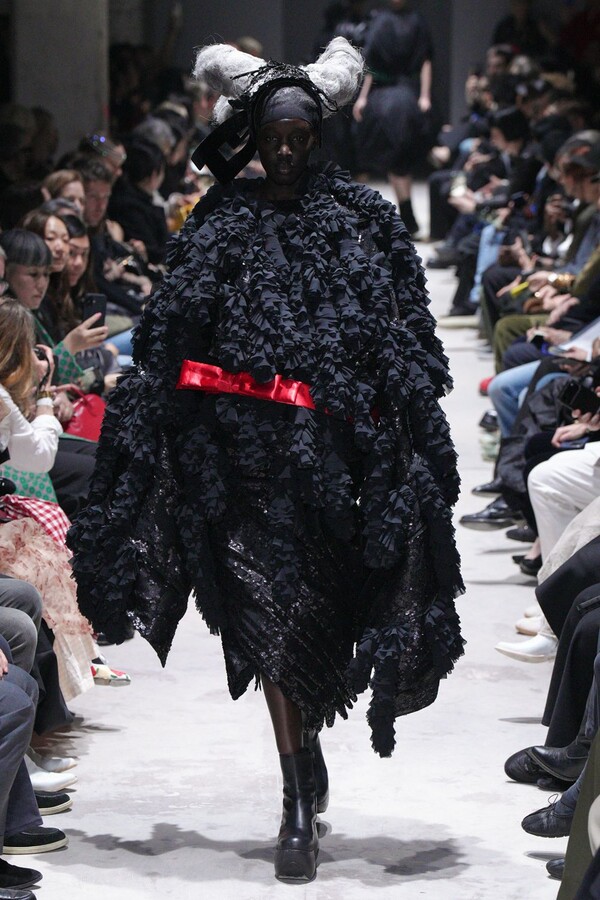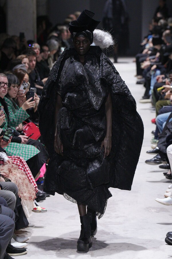 同往季一样,COMME des GARÇONS 2026 秋冬秀与传统的时装秀相比更像是一场哲学的探讨。它运用造型、质地和色彩来引发人们思考,而非提供简单的答案。整场秀以十六套黑色造型拉开帷幕,每件服装都宛如雕塑般精雕细琢,层层叠叠的复杂工艺与视觉张力交织融合。廓形宽大而富有建筑感,将人包裹其中。随后的六套造型与先前的轮廓遥相呼应,但色调换成了甜美浓郁的粉色。这突如其来的色彩转变与起初的暗色调形成了鲜明对比,令人眼前一亮。