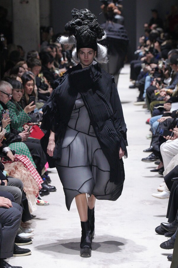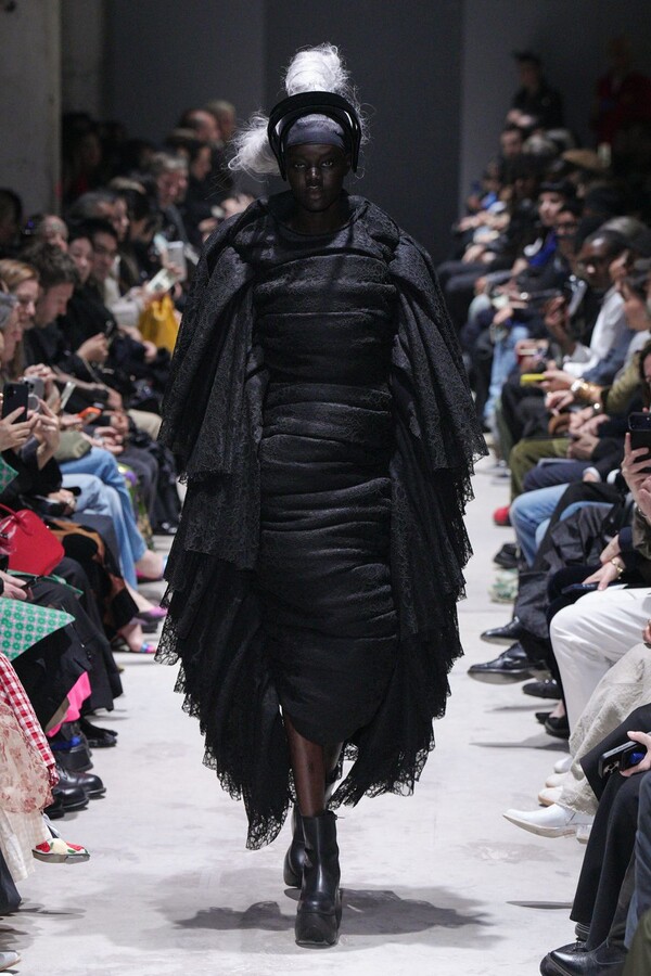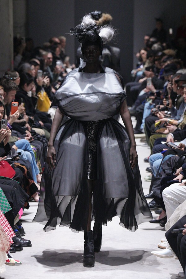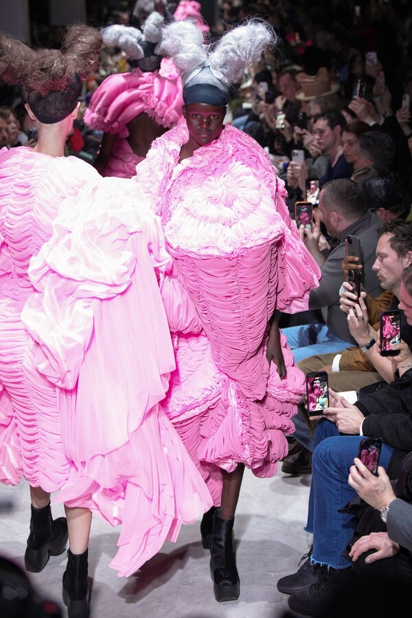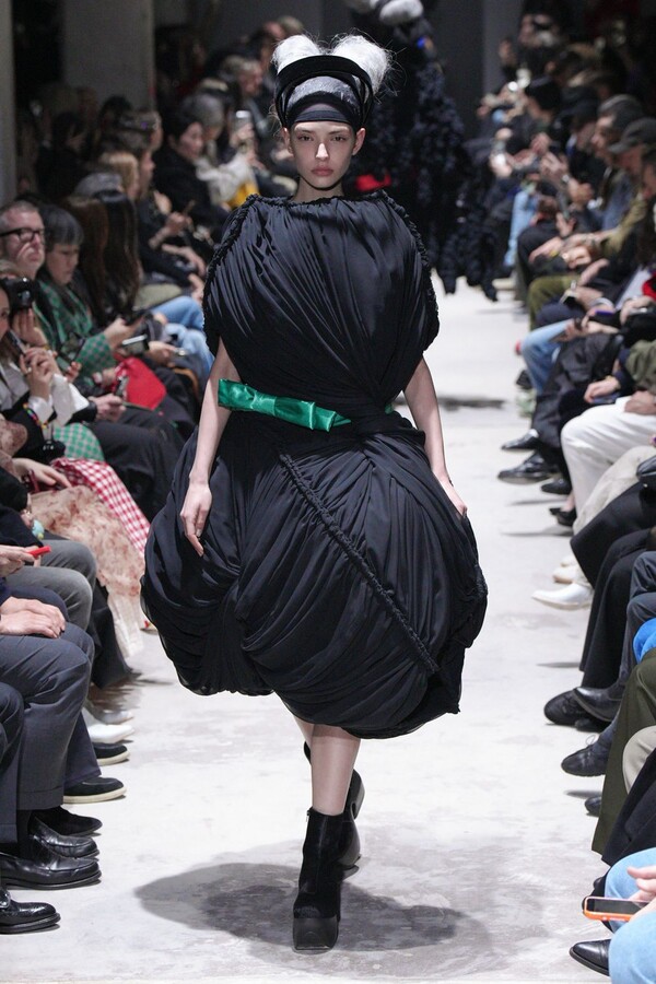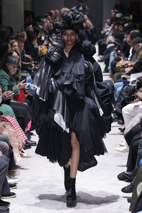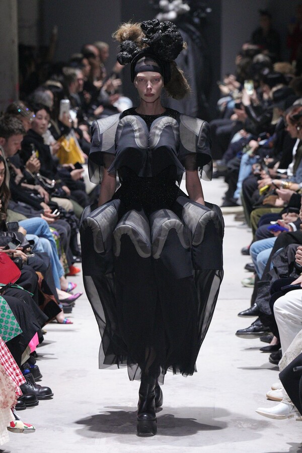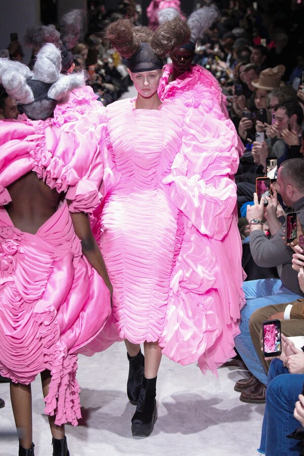 同往季一样,COMME des GARÇONS 2026 秋冬秀与传统的时装秀相比更像是一场哲学的探讨。它运用造型、质地和色彩来引发人们思考,而非提供简单的答案。整场秀以十六套黑色造型拉开帷幕,每件服装都宛如雕塑般精雕细琢,层层叠叠的复杂工艺与视觉张力交织融合。廓形宽大而富有建筑感,将人包裹其中。随后的六套造型与先前的轮廓遥相呼应,但色调换成了甜美浓郁的粉色。这突如其来的色彩转变与起初的暗色调形成了鲜明对比,令人眼前一亮。