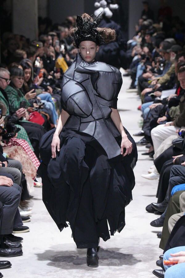 整个系列仍保持了川久保玲代表性的抽象风格。胸部、肩部或臀部的弧形填充设计可根据不同视角诞生出多种解读。有些造型令人联想起建筑构件或雕塑陶瓷;另一些则展现出仿佛从织物中自然涌现的有机形态。