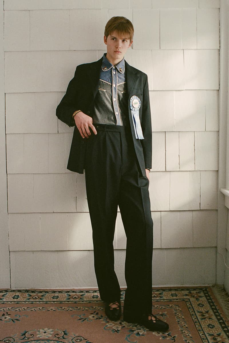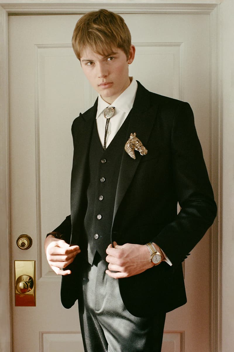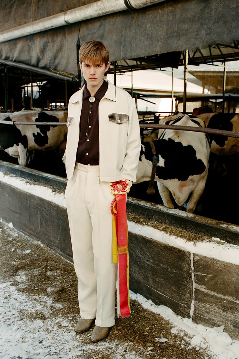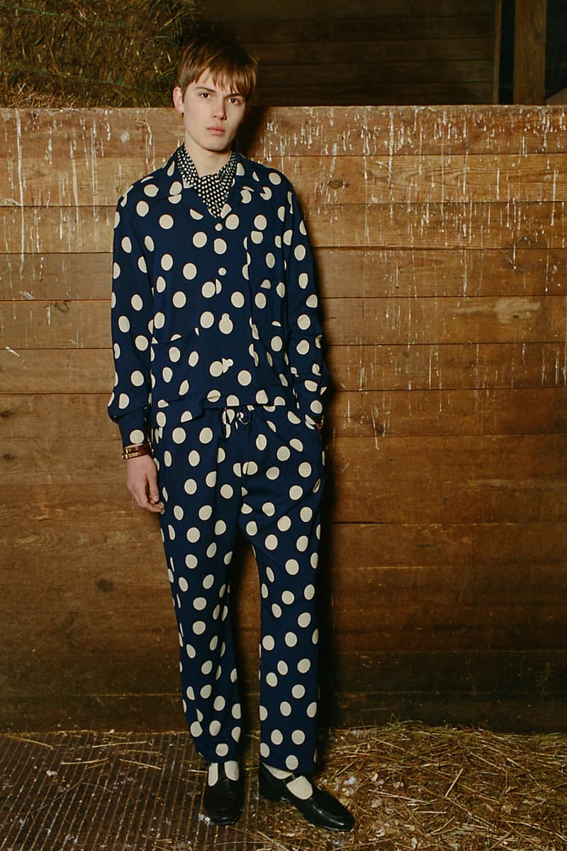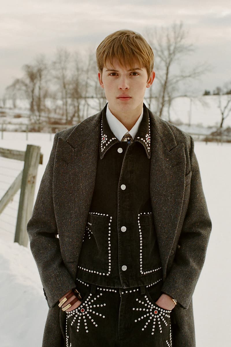 在视觉风格上,系列通过大胆图案与材质营造出极具辨识度的造型,例如全套波点造型、牛纹图案裤装搭配羊羔绒夹克,以及以牛纹为主题的马海毛针织衫与珠宝装饰西装外套。与此同时,BODE 也延续其标志性的复古与怪诞气质,包括带有金色编织装饰的黑色军装风大衣以及采用盘扣结构设计的夹克单品。整体系列在西部文化与手工工艺之间取得平衡,为品牌十周年呈现出一场充满个性与叙事感的时装表达。