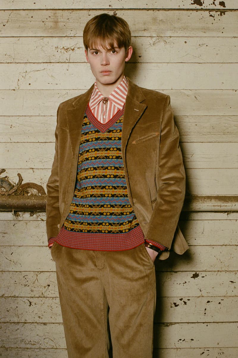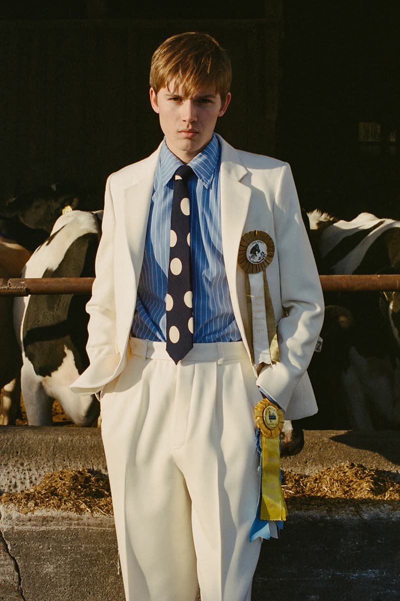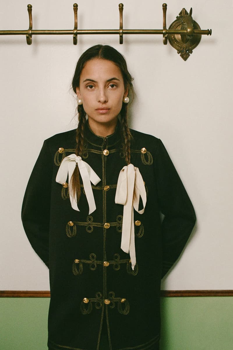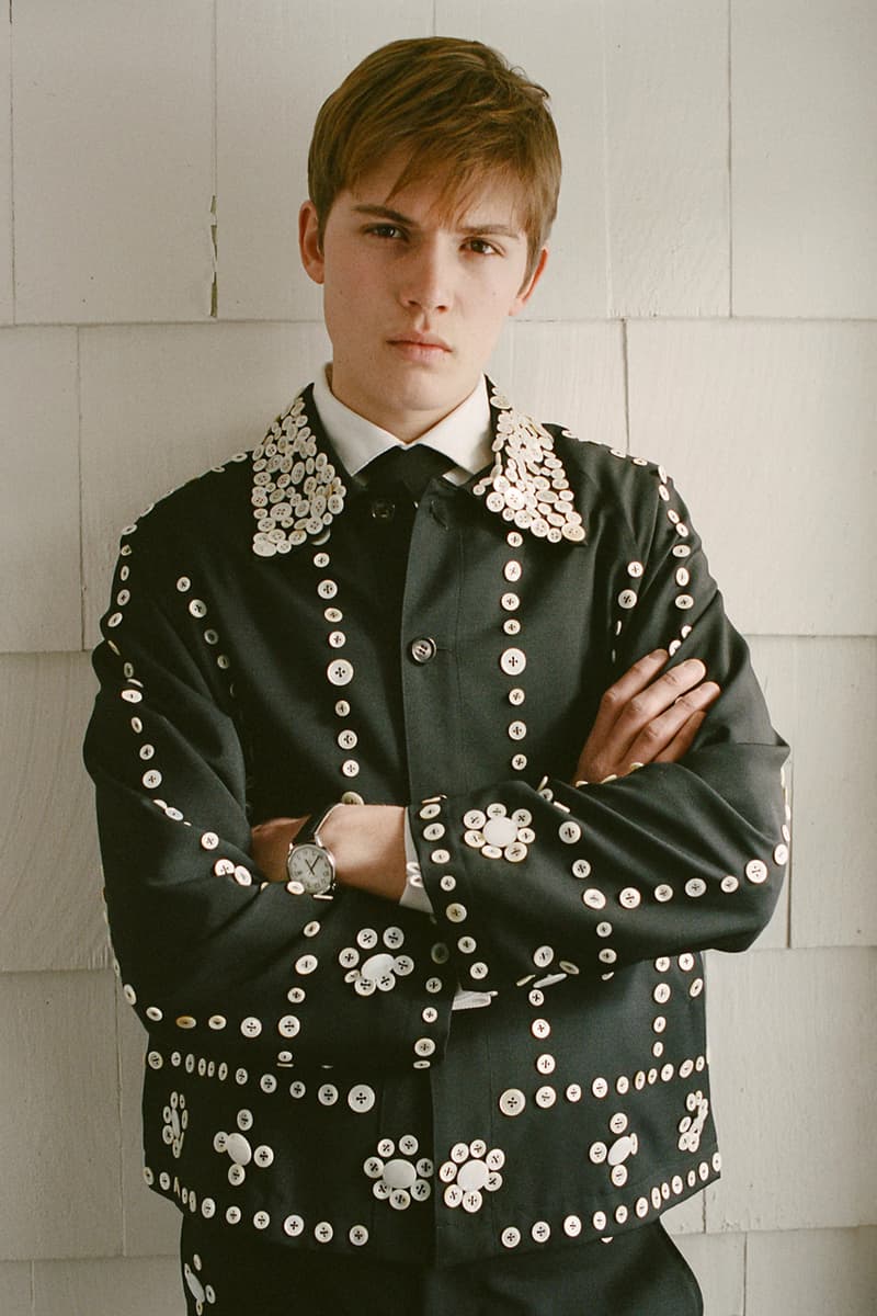 在视觉风格上,系列通过大胆图案与材质营造出极具辨识度的造型,例如全套波点造型、牛纹图案裤装搭配羊羔绒夹克,以及以牛纹为主题的马海毛针织衫与珠宝装饰西装外套。与此同时,BODE 也延续其标志性的复古与怪诞气质,包括带有金色编织装饰的黑色军装风大衣以及采用盘扣结构设计的夹克单品。整体系列在西部文化与手工工艺之间取得平衡,为品牌十周年呈现出一场充满个性与叙事感的时装表达。