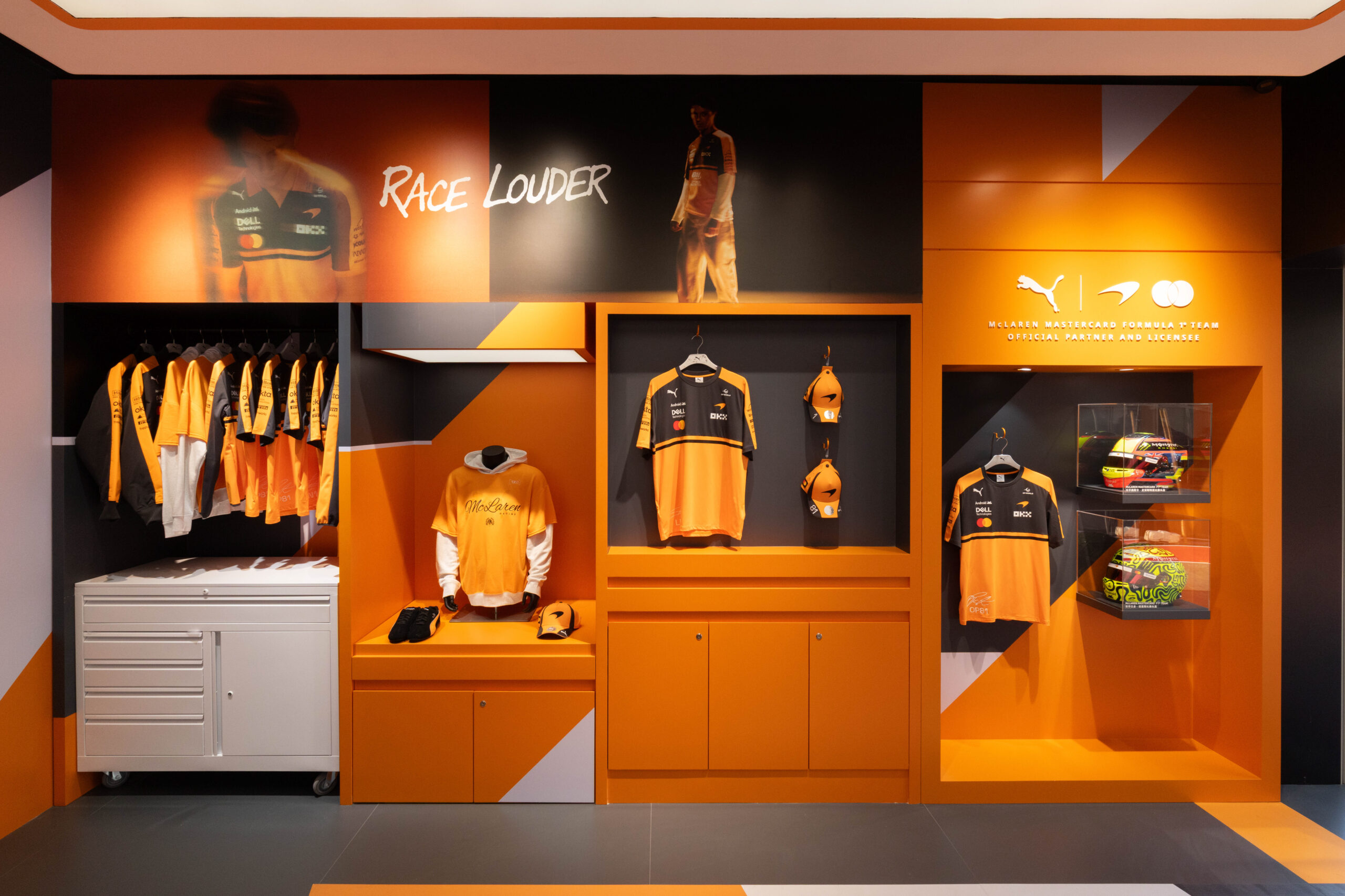 快闪空间整体以 F1 赛事核心场景为蓝本,高度还原 McLaren Mastercard F1 Team、法拉利惠普 F1 车队、阿斯顿·马丁沙特阿美 F1 车队的赛车及 P 房实景,并延伸出 PUMA NITRO 科技空间与 Lifestyle 潮流空间,呈现出 PUMA 独一无二的先锋品牌文化。