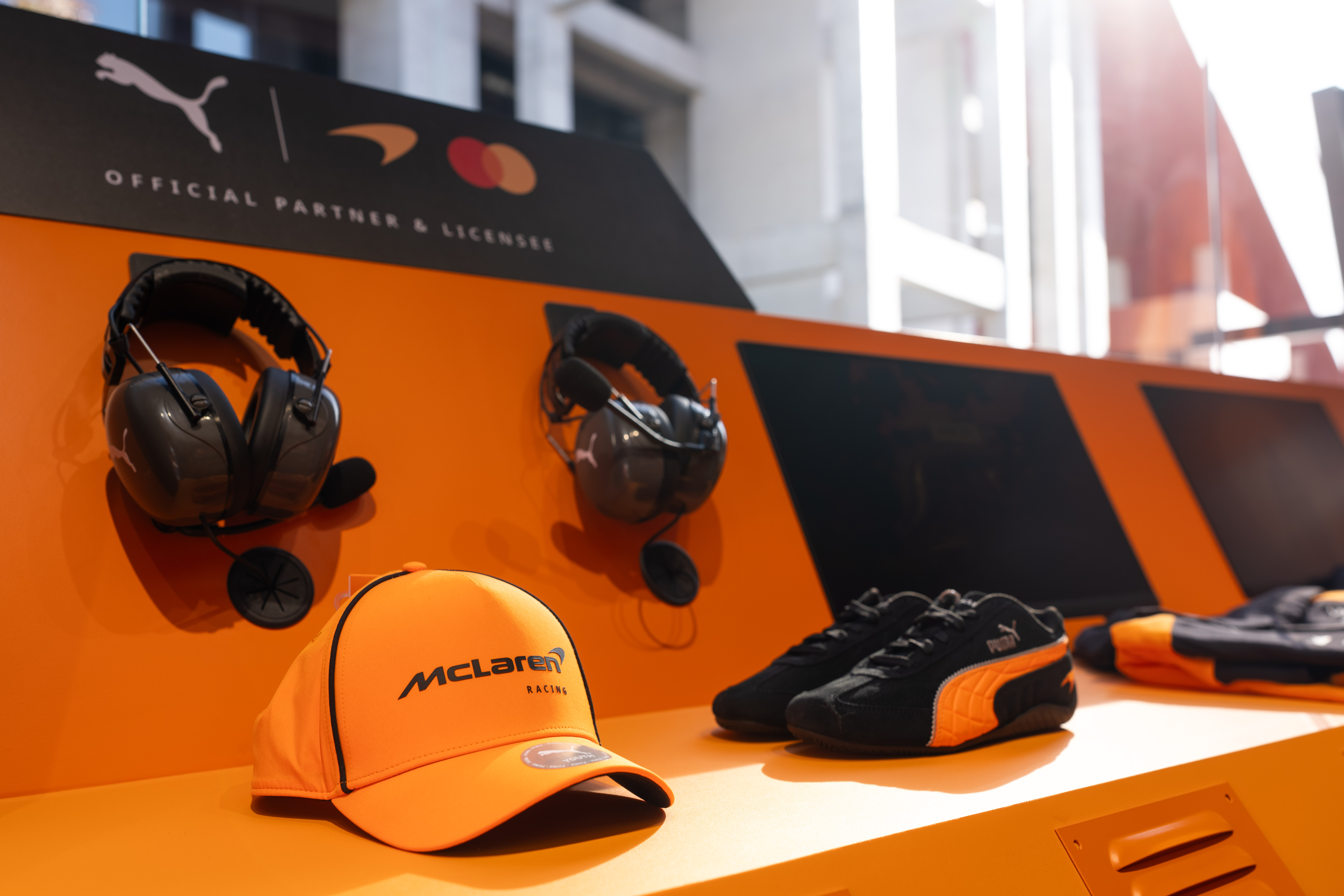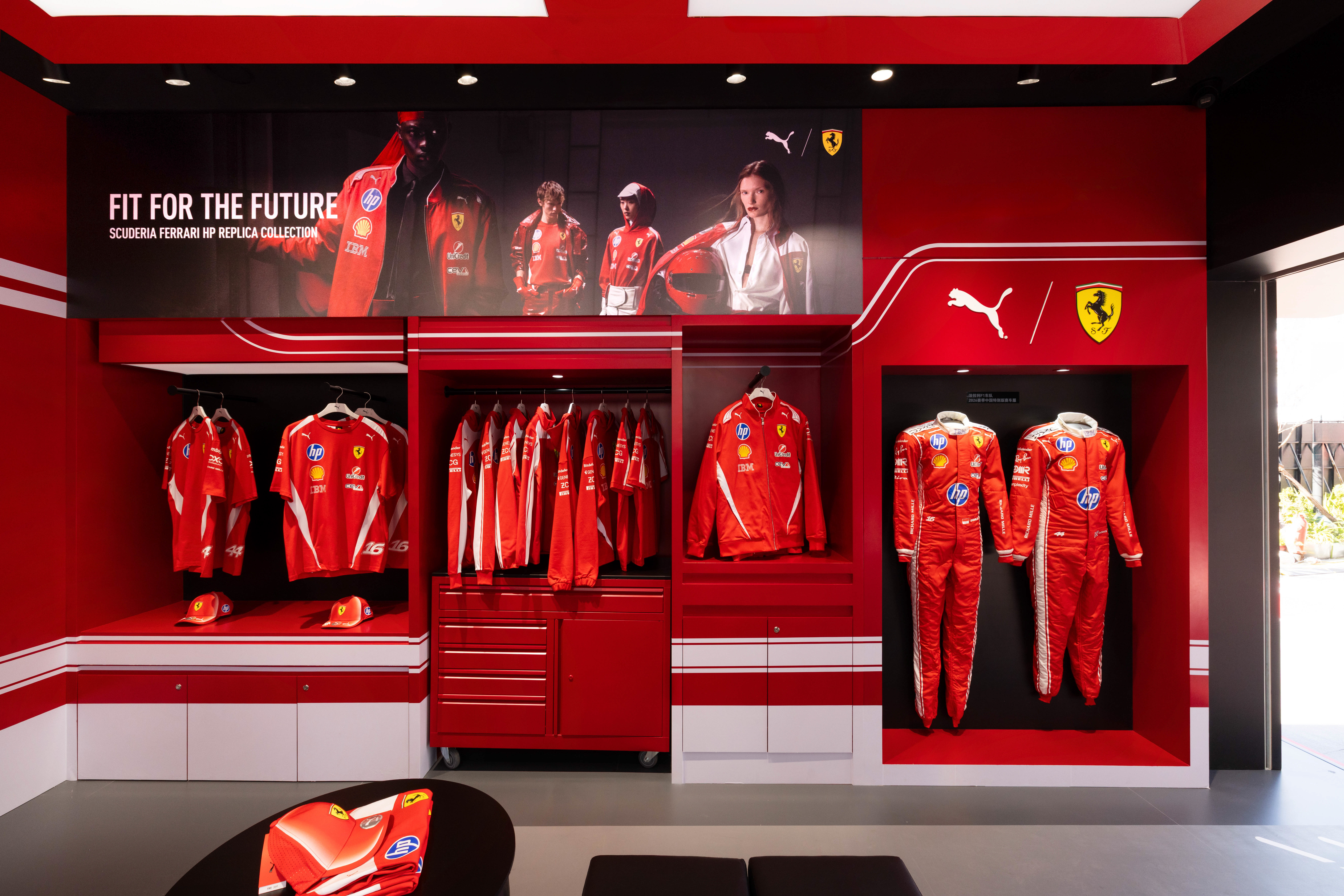 现场矗立着巨型 PUMA 赛车手装置,车手身着全套 PUMA 装备,呈现蓄势待发的动感驾驶姿态,瞬间点燃现场的极速氛围。三大车队 P 房则分别以各队标志性色调为主视觉,内部陈列车队联名系列,涵盖复刻队服与休闲服饰。