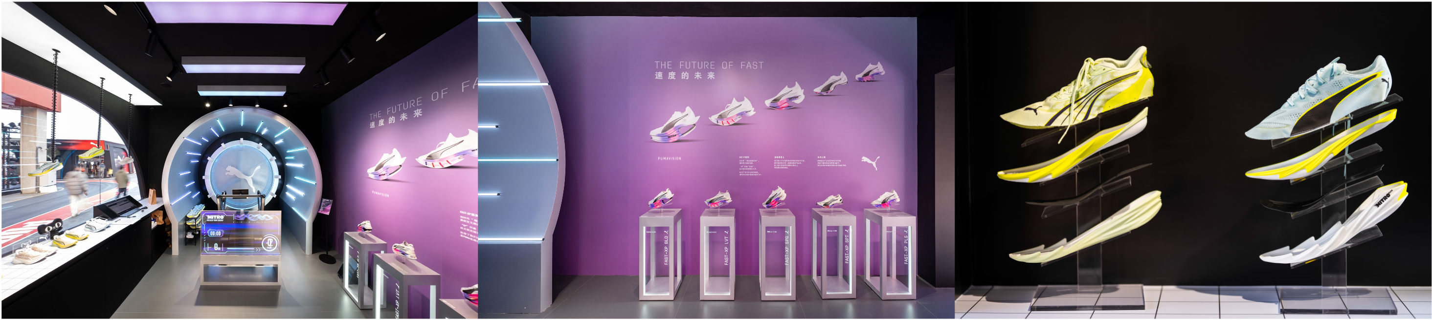 PUMA NITRO 科技空间作为品牌前沿科技的秀场,以拱形装置与错落渐变的灯带营造出风驰电掣的视觉轨迹,呼应 PUMA 在赛道速度美学上的持续探索。展区后方设有来自赛车灵感的风洞装置,将 F1 的竞速基因连接到 PUMA 的尖端科技,空间内集中呈现当季搭载 NITROFOAM™ 科技的专业跑鞋——DEVIATE NITRO 4 和DEVIATE ELITE 4,及未来感十足的 FAST-XP 概念鞋款,直观展现 PUMA 在高性能运动科技领域的持续突破。