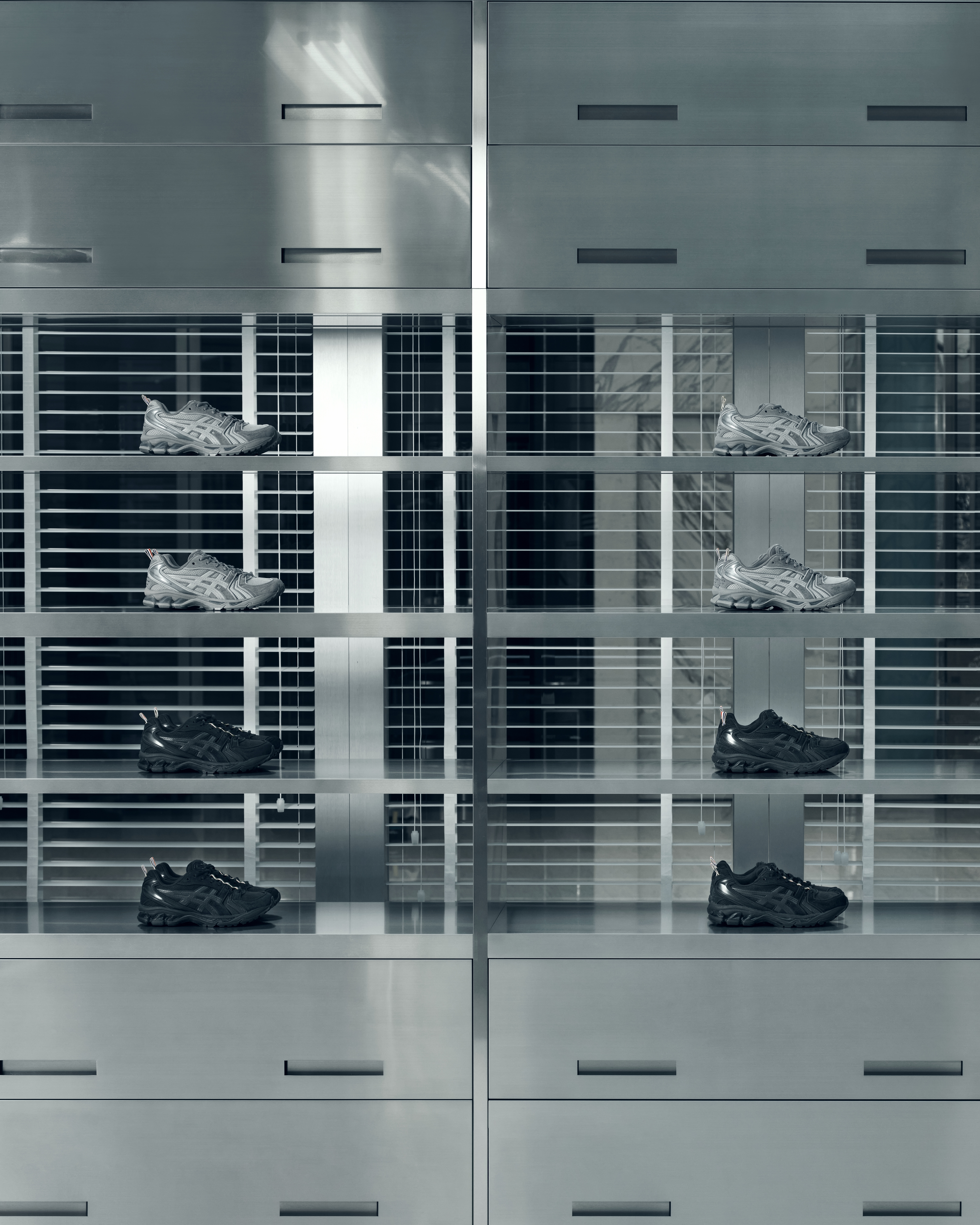 上海限时体验空间以灰色调为基底,将日常办公场景转化为艺术化表达。步入空间,位于视觉中心的艺术化巨型饮水装置十分醒目,与「超现实办公室美学」主题遥相呼应。品牌经典的百叶窗设计贯穿始终,以重复的线条韵律与光影的开合变幻,营造出层次丰富的视觉节奏。虚实交错间,勾勒出复古而摩登的空间氛围。空间中央的银色钢制办公桌成为视觉锚点——Thom Browne x ASICS GEL-KAYANO 14 联名鞋款在书堆上列队,一种有序与无序共存的智趣感跃然纸上。金属表面倒映着百叶窗的疏密光影,亦映衬出鞋履与配饰的利落轮廓。成衣系列静置于边柜之中,灵感源自thom对运动的长久热爱,以及他在定制运动时装领域的深厚造诣,处处呈现品牌量身定制的衣橱概念。每一处陈列皆遵循着品牌一贯的秩序美学——正如高级剪裁的精髓在于精准的结构与内敛的表达。空间中的每一寸布局,皆是对裁缝精神的视觉转译。而运动精神中那份对恒久的坚持,亦悄然呼应着 Thom Browne 衣橱哲学的内核:历久弥新,方可长久相伴…本次合作系列,于 2 月 6 日在旧金山荣誉勋位宫博物馆举办的 Thom Browne 2026 秋冬系列时装秀中首次释出。由 Thom Browne 对 ASICS 经典 GEL-KAYANO 14 鞋款进行全新解构与重塑。