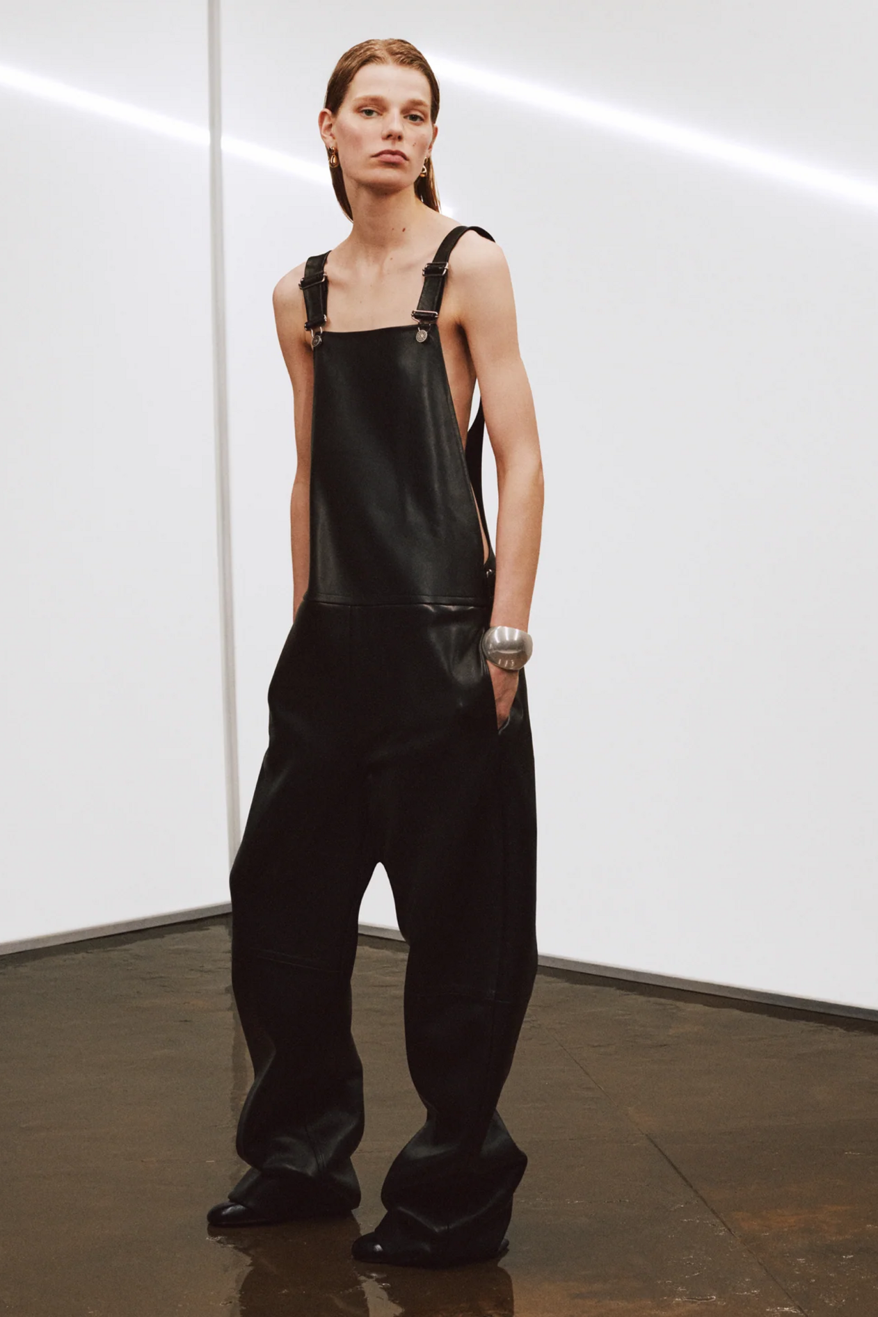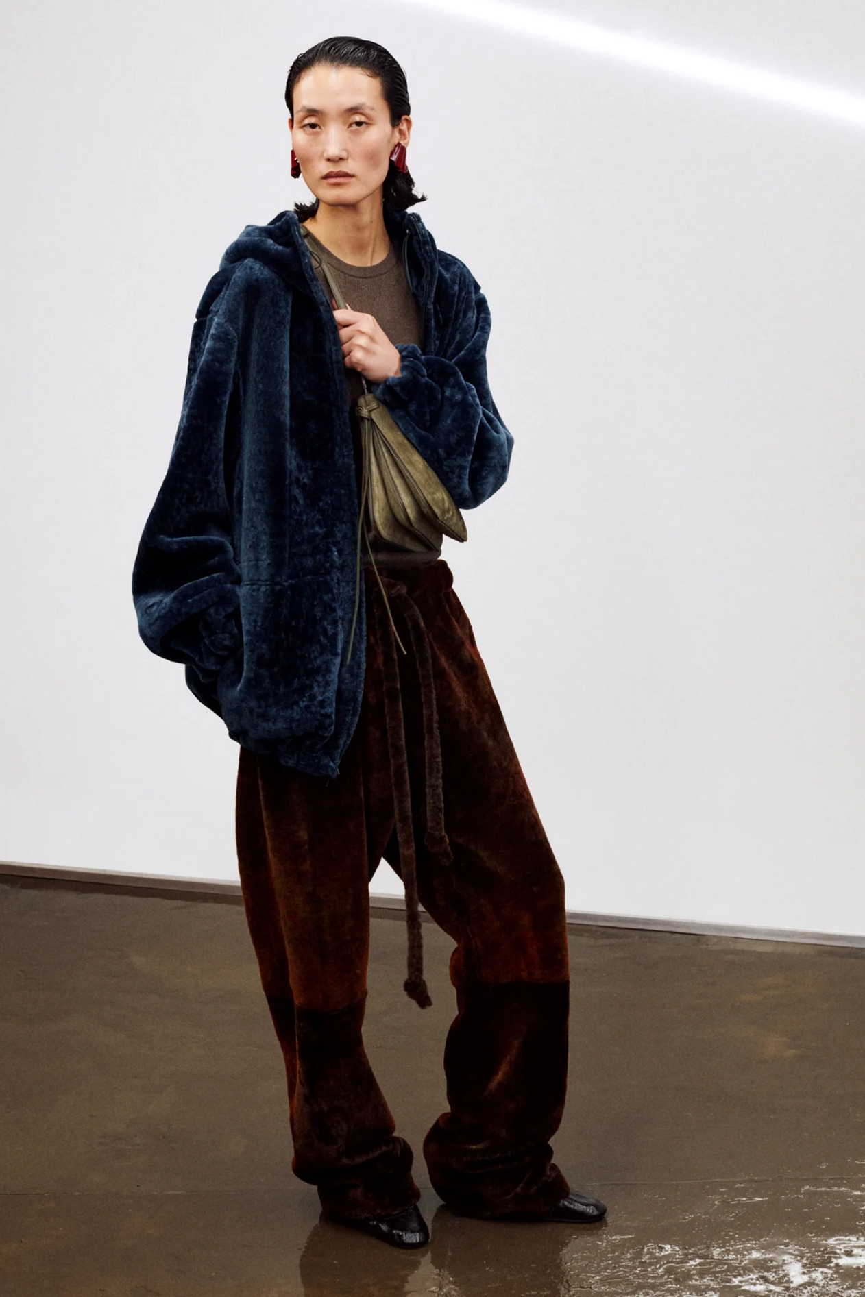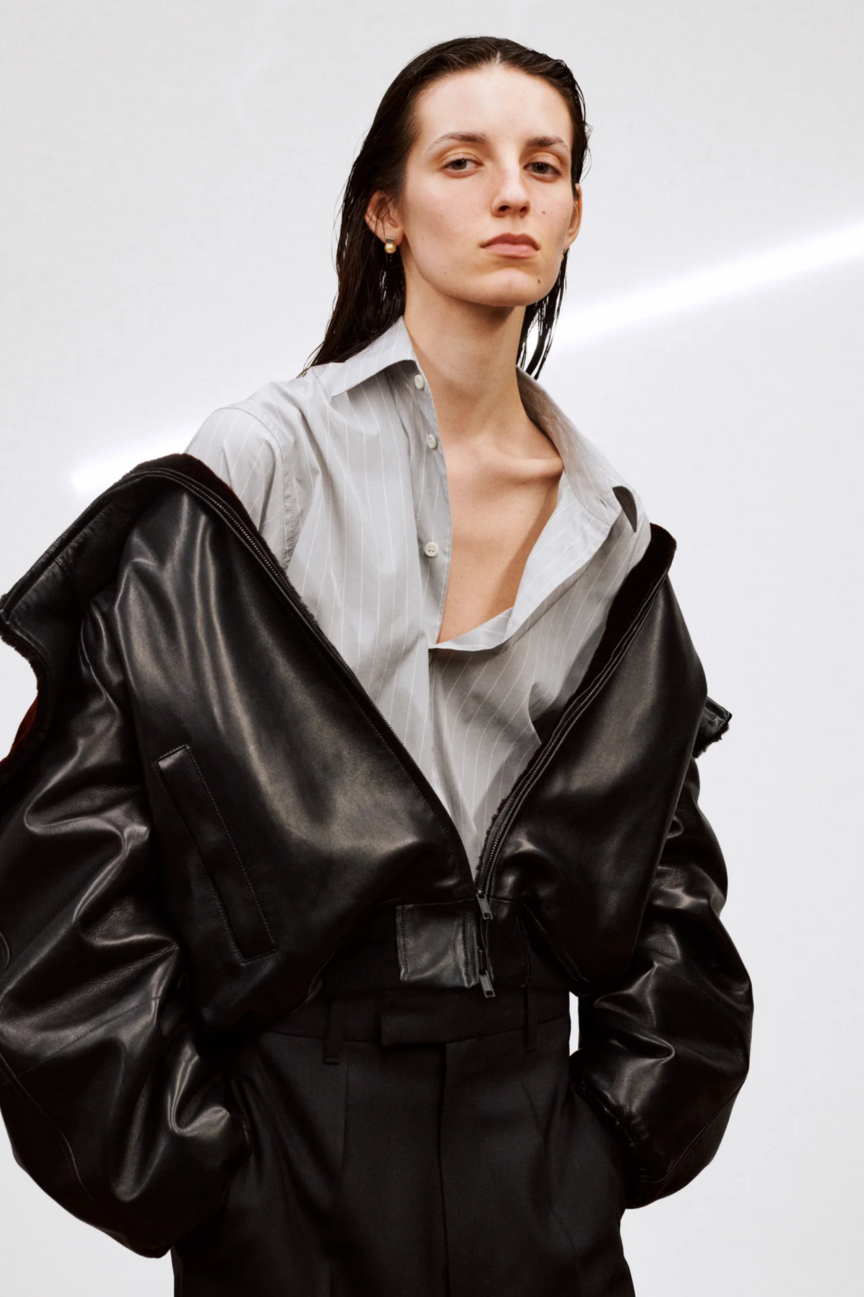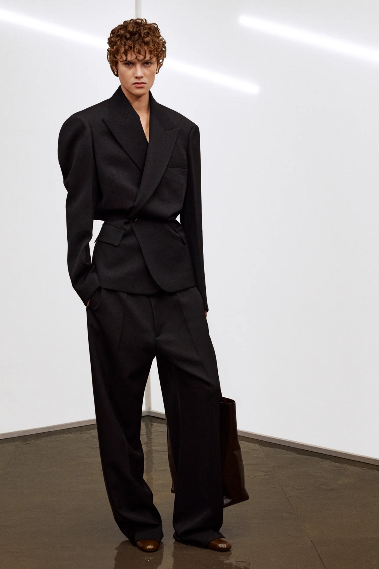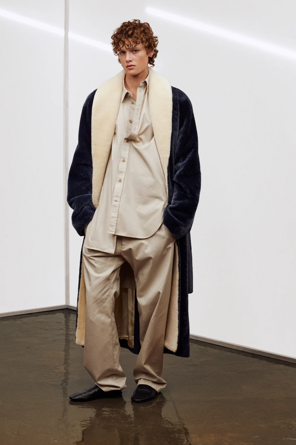 材质扮演着低调却重要的角色。羊毛皮贯穿始终,经特殊处理后其质感从挺括变为柔软,效果近乎做旧。皮革则被运用在一些看似不寻常的单品中——尤其是常常用来营造舒适感的款式,例如宽松长裤或简约套装。这种熟悉与颠覆之间的张力贯穿整季,赋予了原本简洁的单品更加鲜明的个性。